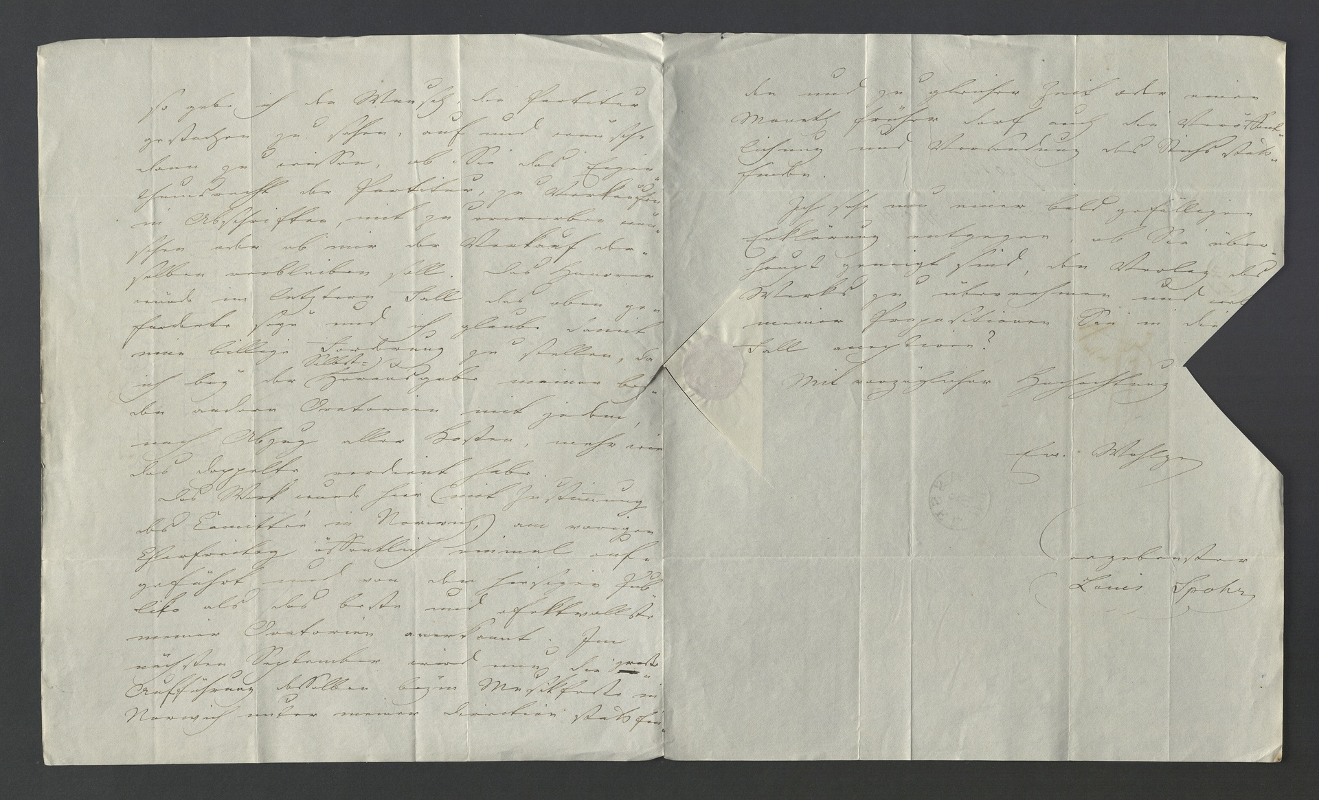 Text: "Hochgeehrtester Herr, In Bezug auf eine frühere, vorläufige Anfrage und weil nun die Zeit heranrückt, wo es mir gestattet ist, mein neues Oratorium "Babylons Fall" der Öffentlichkeit zu übergeben, bin ich so frei, hiermit ergebenst anzufragen, ob Sie geneigt sind, dasselbe in Verlag zu übernehmen? Gern hätte ich es gesehen, wenn außer dem Clavierauszuge und den Gesangstimmen auch die Partitur gestochen worden wäre, wie dieß bey einigen neuern Oratorien und den 3 letzten meiner Sinfonien geschehen ist. Ich offerire Ihnen daher das Werk zu einer solchen Ausgabe für ein Honorar von 600 Rth. Sollten Sie aber der Ansicht seyn, daß die Kosten des Partiturstichs durch den Verkauf derselben nicht zu decken seyen, so gebe ich den Wunsch, die Partitur gestochene zu sehen, auf und wünsche dann zu wissen, ob Sie das Eigenthumsrecht der Partitur, zu Verkaufen in Abschriften, mit zu erwerben wünschen oder ob mir der Verkauf derselben verbleiben soll. Das Honorar würde im letzten Fall das oben geforderte seyn und ich glaube damit eine billige Forderung zu stellen, da ich bey Selbst-Herausgabe meiner beyden andern Oratorien mit jedem, nach Abzug aller Kosten, mehr wie das doppelte verdient habe. Das Werk wurde hier (mit Zustimmung des Comitté in Norwich,) am vorigen Charfreitag öffentlich einmal aufgeführt und von dem hießigen Publiko als das beste und efektvollste meiner Oratorien anerkannt. Im nächsten September wird nun die zweite Aufführung desselben beym Musikfest in Norwich unter meiner Direktion stattfinden und zu gleicher Zeit oder einen Monath früher darf auch die Veröffentlichung und Versendung des Werks stattfinden. Ich sehe nun einer bald gefälligen Erklärung entgegen, ob Sie überhaupt geneigt sind, den Verlag des Werks zu übernehmen und wel[che] meiner Propositionen Sie in die[sem] Fall acceptiren? Mit vorzüglicher Hochachtung Ew. Wohlgeb. ergebenster Louis Spohr". Karl Traugott Goldbach, Spohr-Briefe: <http://bit.ly/1QogOg2>