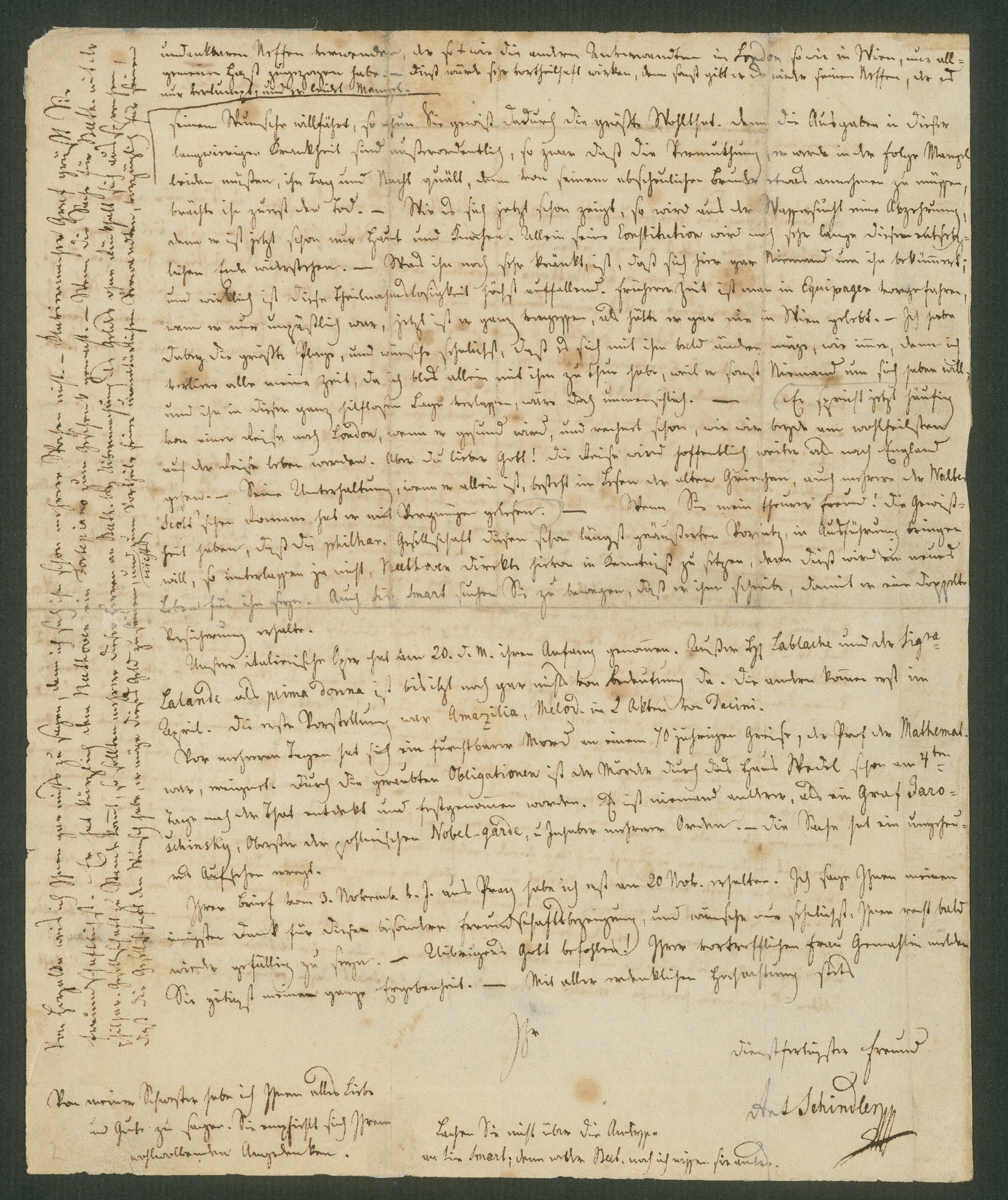Sensibel bittet Schindler, der Meister dürfe von seinem Zustand nichts wissen. Er glaube noch immer, bald nach England reisen zu können. Sobald Moscheles positive Nachricht von der Philharmonischen Gesellschaft habe, möge er an Beethoven schreiben, um ihm neuen Mut zu geben und ihn zu stärken. (F.G.)