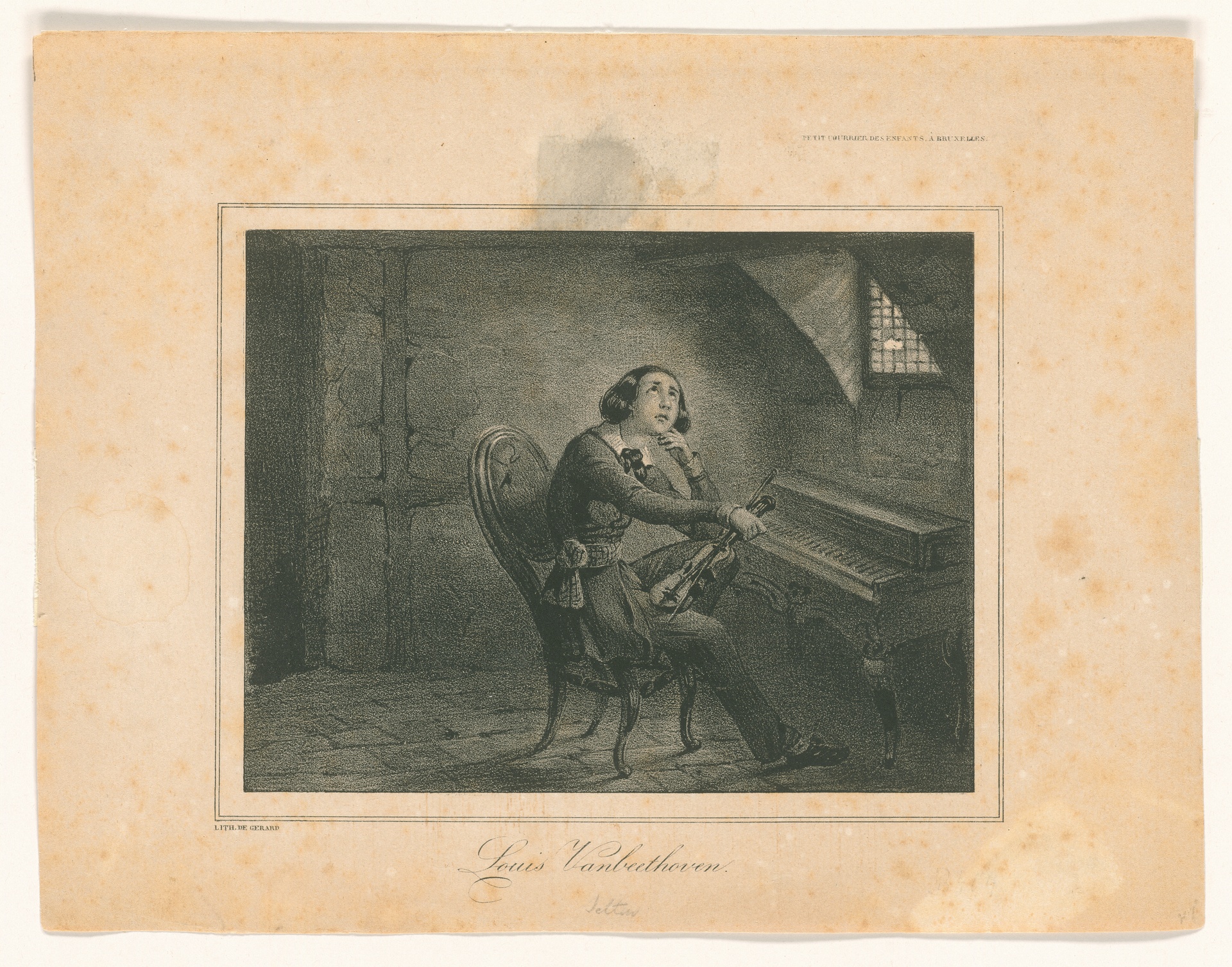 Beethoven als Kind in einer Dachkammer sitzend - Lithographie von Gérard, wohl nach einer eigenen Zeichnung, Brüssel, 1837