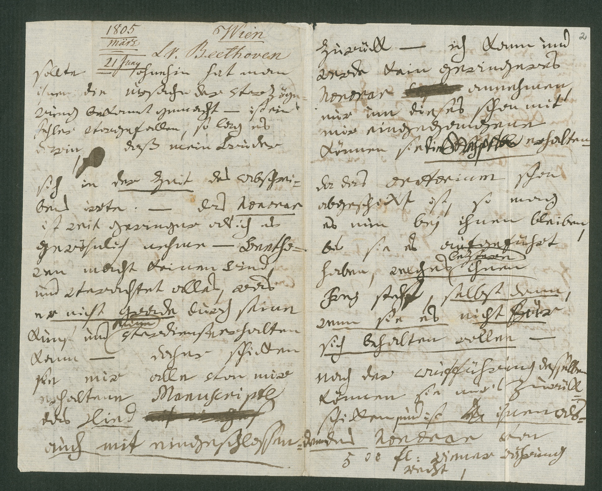 Ohne weiter auf die Höhe des Honorars einzugehen (immerhin betont er, es sei "weit geringer als ich es gewöhnlich nehme"), bittet Beethoven verärgert um die Rückgabe der bereits übersandten Werke (opp. 53, 54, 55 und vermutlich WoO 136), da er nicht bereit sei, sie für weniger Geld zu verkaufen.