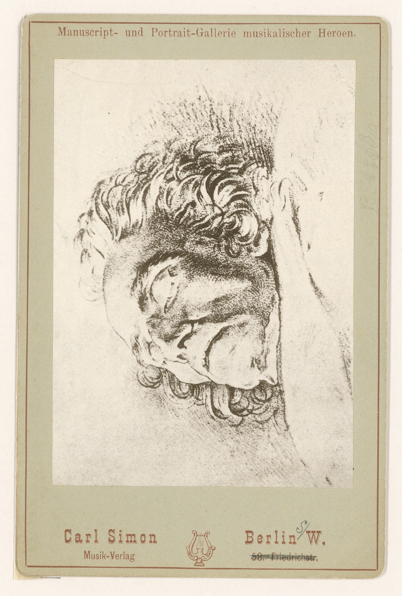 Josef Danhausers Lithographie mit der Darstellung Beethovens auf dem Totenbett ist in zwei unterschiedlichen Fassungen überliefert. Während das hier abgebildete Blatt im Besitz des Beethoven-Hauses keine Inschrift trägt, haben sich einige Abzüge erhalten, die unter der Zeichnung die Aufschrift tragen: "Beethoven - den 28ten März an seinem Totenbette gezeichnet 1827".