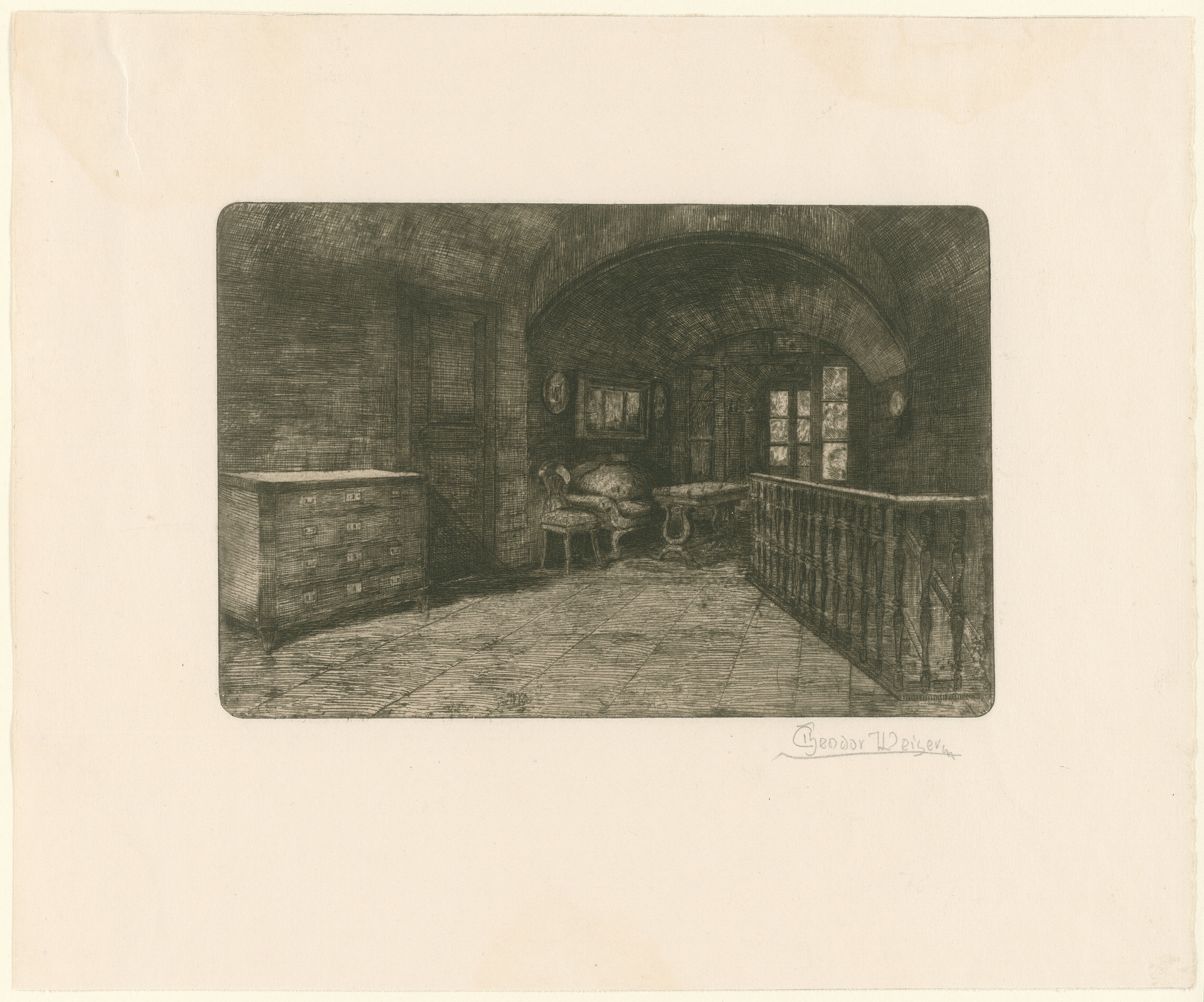 Gneixendorf, Schlossstraße 19, Trautinger Hof, "Kneifel-Zimmer"Wohnung des Bildhauers Kneifel, "Kneifel-Zimmer" - Radierung von Theodor Weiser nach einer eigenen Zeichnung, um 1920