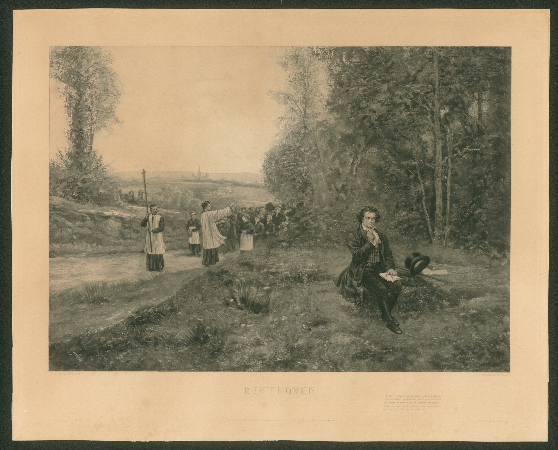 Beethoven beim Komponieren in der Umgebung Bonns, im Hintergrund ein Beerdigungszug - Heliogravüre nach einem Gemälde von Paul Leyendecker, veröffentlicht von Boussod, Valadon in Paris, 1888