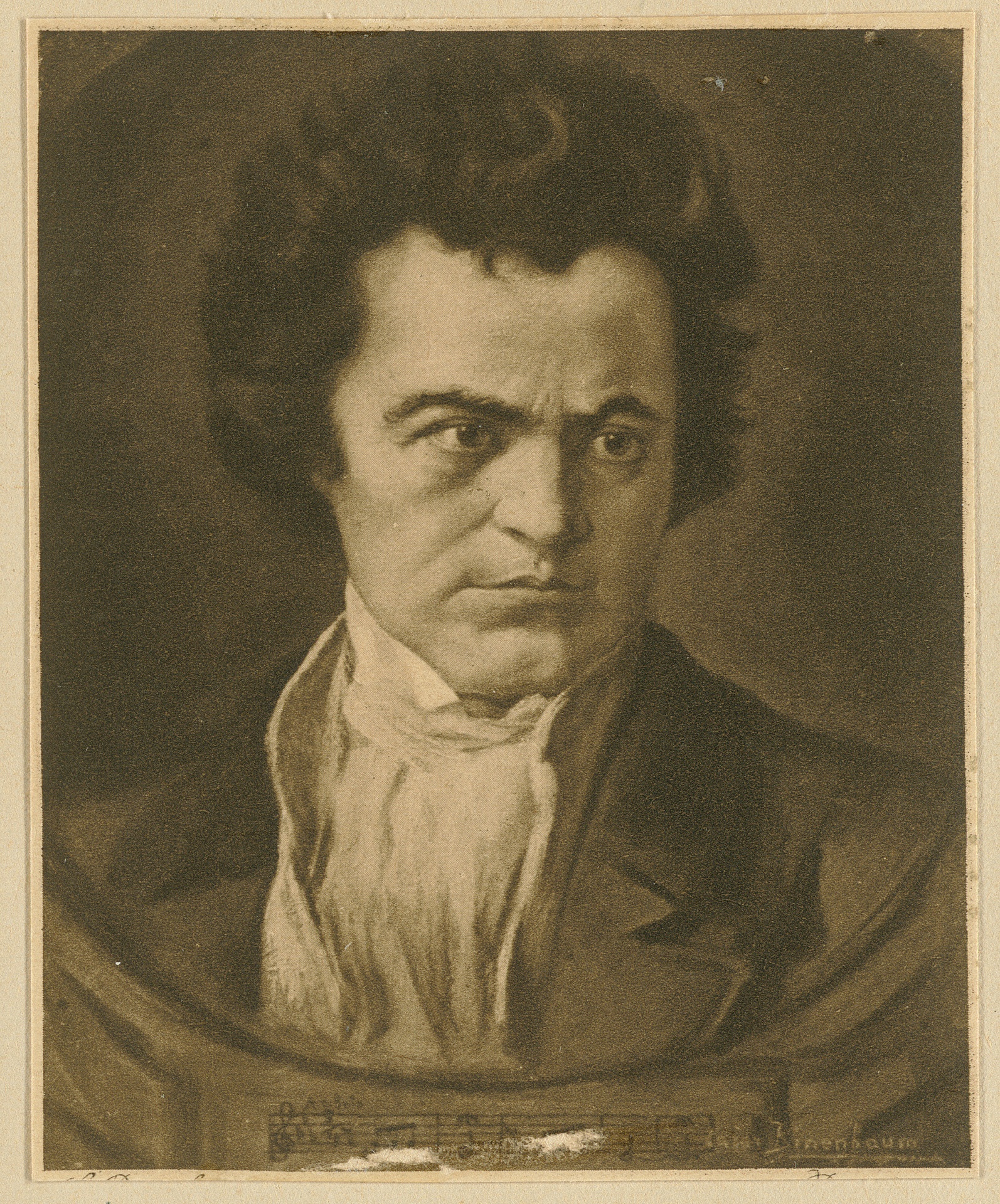 Ludwig van Beethoven, mit Notenzeile der 5. Sinfonie - Gemälde von Lazar Binenbaum, Reproduktion, um 1925