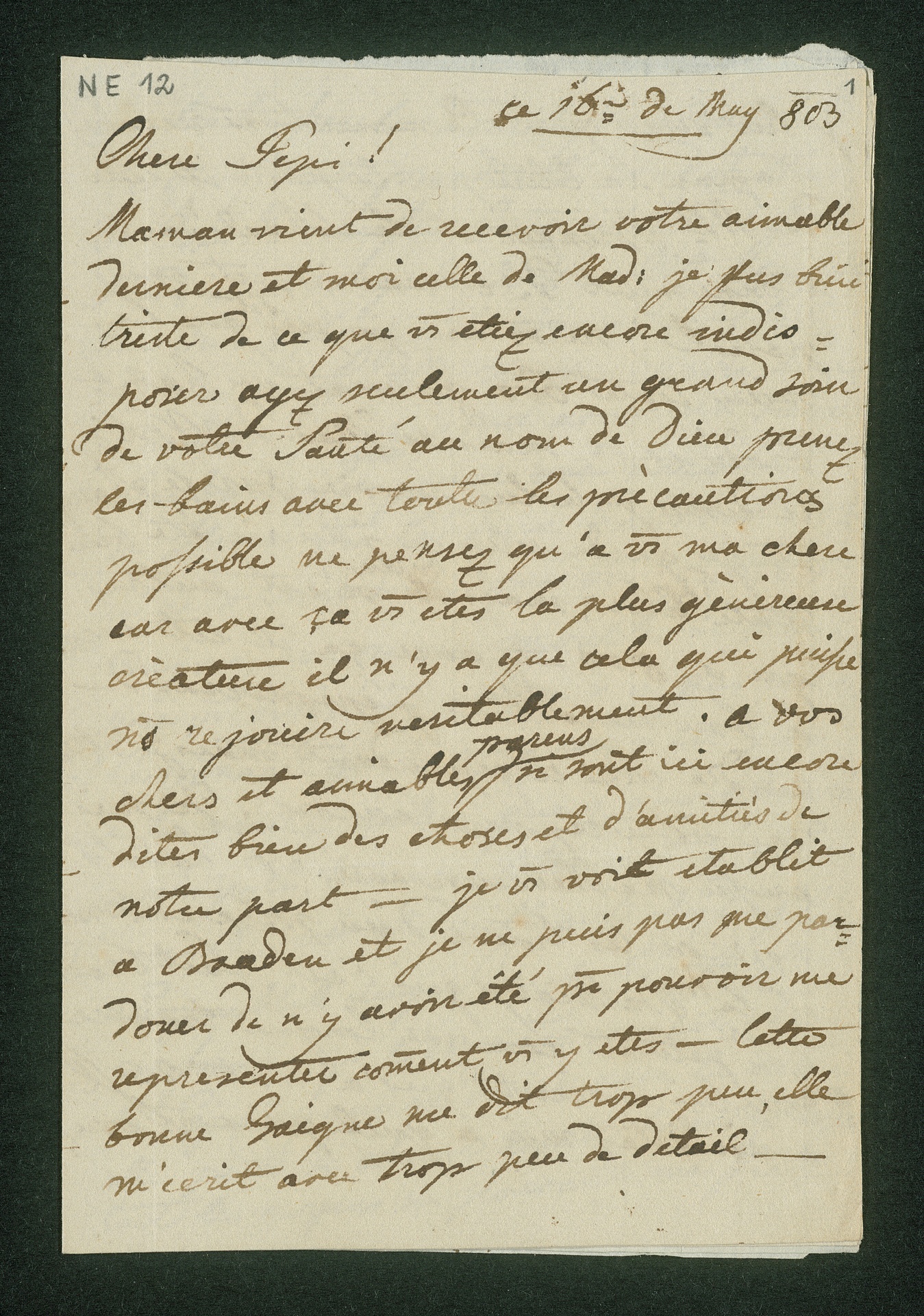Therese macht sich Sorgen um die Gesundheit ihrer Schwester, die in Baden zur Kur ist, und empfiehlt ihr, regelmäßig die Bäder zu besuchen und gut auf sich Acht zu geben. Therese war offenbar um Besorgungen und Gefälligkeiten gebeten worden, über deren Erledigung sie berichtet. Auch gibt sie Empfehlungen für ihre Schwester ab.