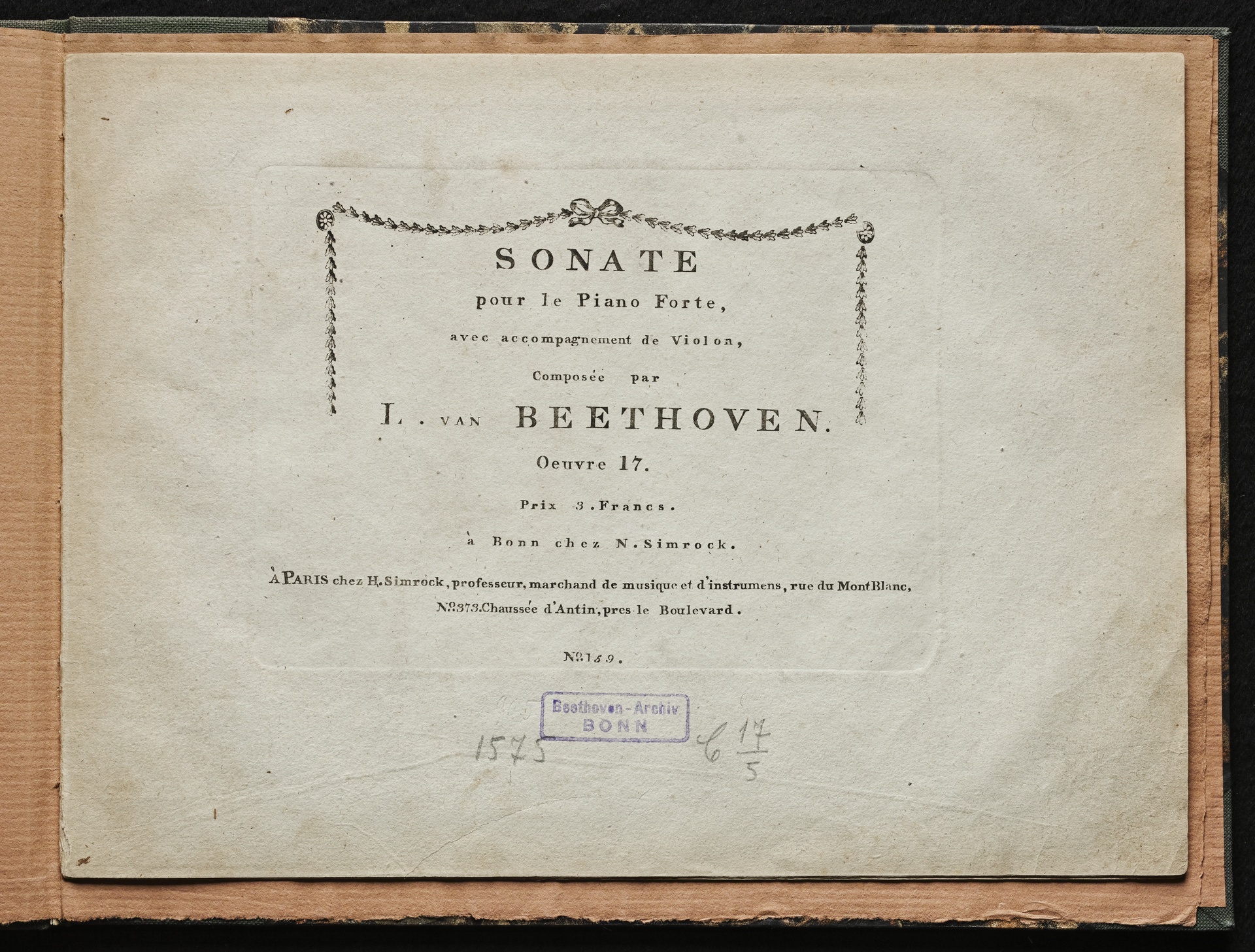 Ludwig van Beethoven, Sonate für Klavier und Horn oder Violoncello (F-Dur) op. 17, Bearbeitung für Violine und Klavier, Stimmen, Simrock, 159