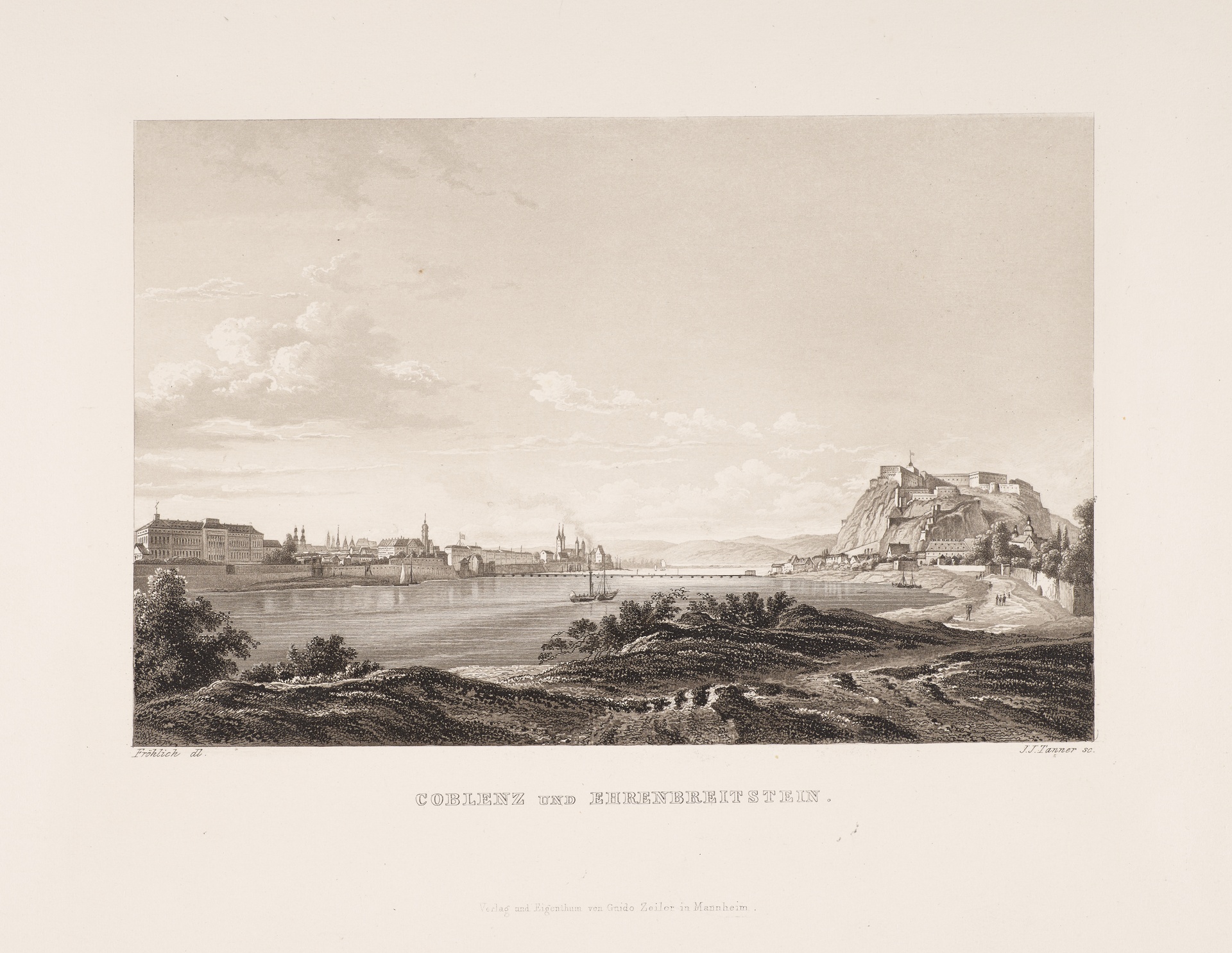 Blick auf Koblenz und die Festung Ehrenbreitstein - Stich von J. J. Tanner nach einer Zeichnung von Ernst Fröhlich, veröffentlicht vom Verlag Guido Zeiler, Mannheim, 1. Hälfte 19. Jh.