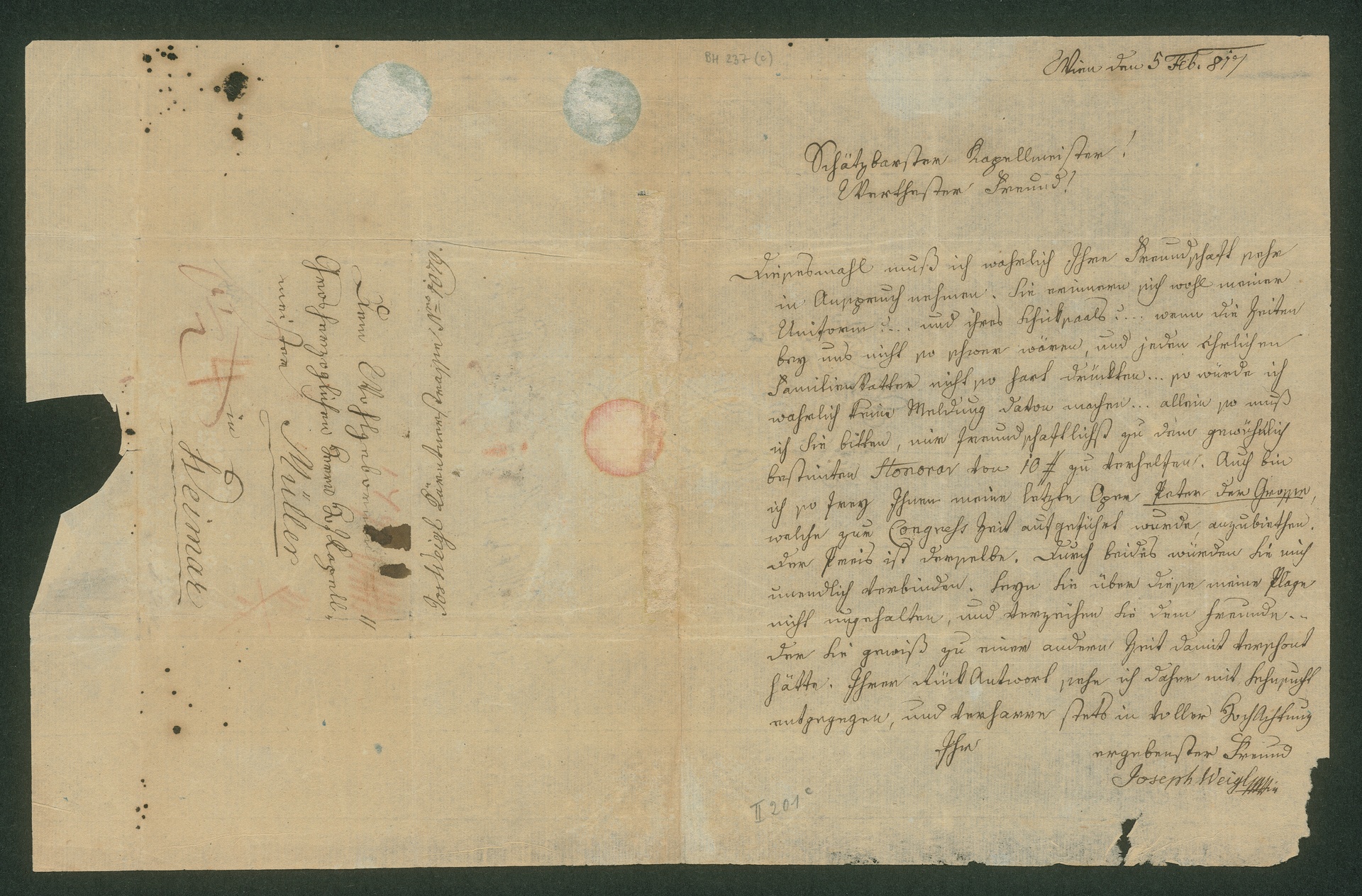 Im Digitalen Archiv werden alle drei Briefe von BH 237 abgebildet: Bild 1 und 2 zeigen den Brief Weigls an Strohmayer (BH 237 a), Bild 3 und 4 den Brief Weigls an Lichtenthal (BH 237 b) und Bild 5 den Brief Weigls an Müller (BH 237 c).