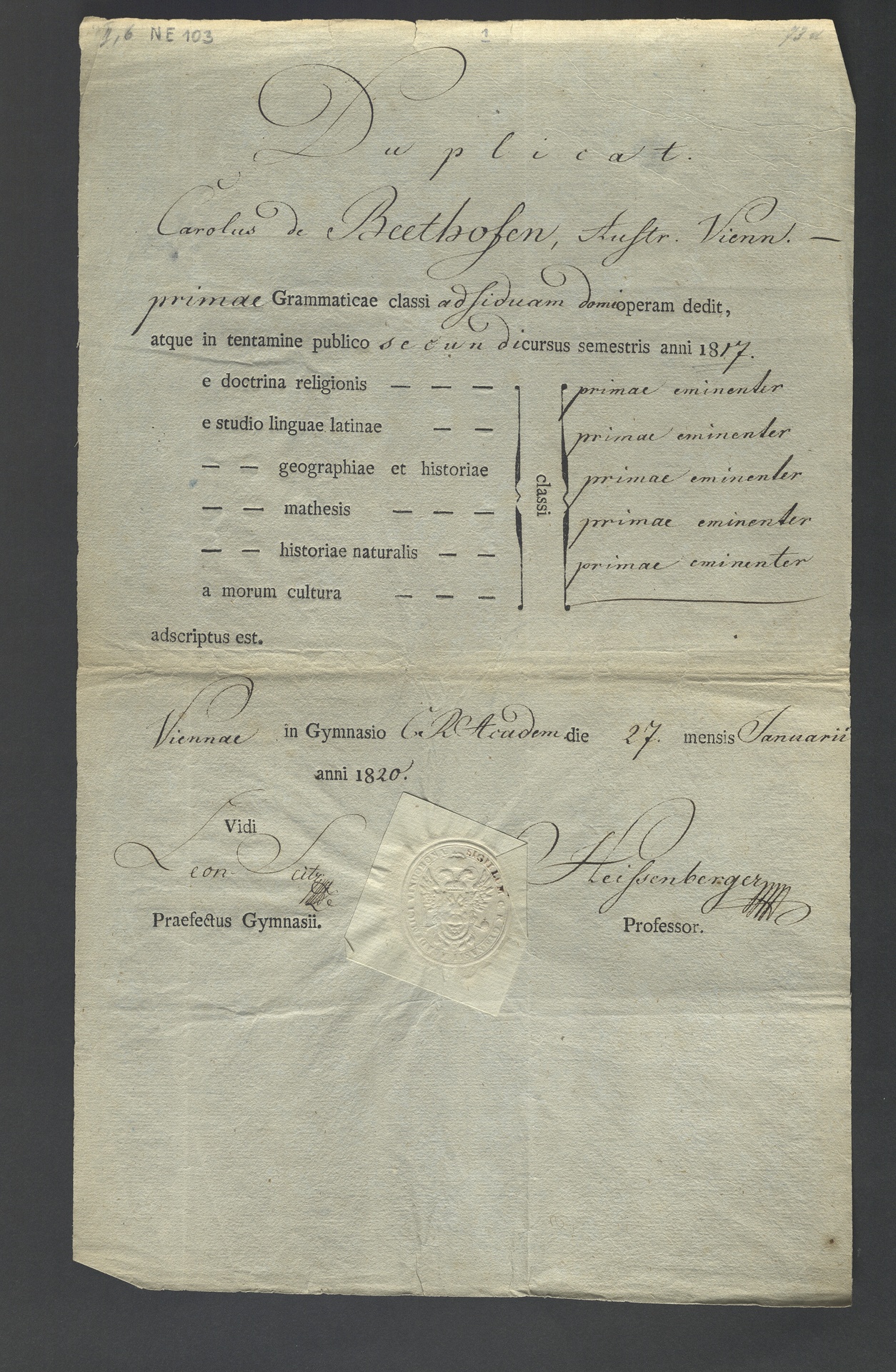 Karl van Beethoven (Neffe), Schulzeugnis der 1. Grammatikal-Klasse des Gymnasiums vom 27. Januar 1820, Abschrift