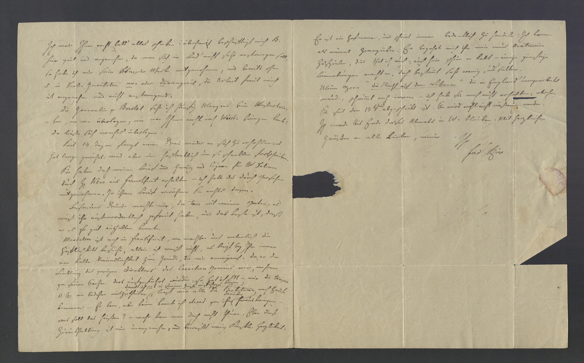 Während seiner Kur in Wiesbaden arrangiert Ries Klavierwerke Beethovens zu Streichquartetten und arbeitet an den "Biographischen Notizen" (Beethoven-Biographie). Ries betont, Wegeler könne die ihm zugeleiteten Notizen über Beethoven nach Wunsch auswerten und verändern. Er werde noch einiges hinzufügen. Wegeler möge aus Beethovens Briefen dessen Meinung über Ries als Freund und Künstler ergänzen. Auch soll es einen Brief Beethovens geben, in dem der Komponist seine einzigen zwei Schüler - Ries und Erzherzog Rudolph - erwähnt. "Denn ich gestehe, ich mag Sch[indler]- nicht, um das Kleeblatt der B:schen Schüler vollzumachen, denn ich kann das nicht alles glauben und verdauen, was der todte B: gesagt haben soll, auch kann ich mir schlechterdings nicht begreiflich machen, wie dieser Sch[indler]- so ein Intimus von ihm geworden seyn soll - ich hätte nie geglaubt, daß das der Mensch für ihn gewesen sey. Auch hat er in allen seinen Briefen an mich in England /:also während dieser Zeit:/ nur zweymal seinen Namen gennent oder über ihn gesprochen." Ries hat Felix Mendelssohn Bartholdy in Frankfurt kennen gelernt. Die Begegnung empfand er jedoch als sehr kühl und wenig herzlich. Auf der künstlerischen Ebene kam es weder zu dem von Ries erhofften Austausch über die Interpretation von Mendelssohns Werken noch äußerte Mendelssohn Anerkennung über Ries' Oratorium "Die Könige in Israel" op. 186. (F.G.)