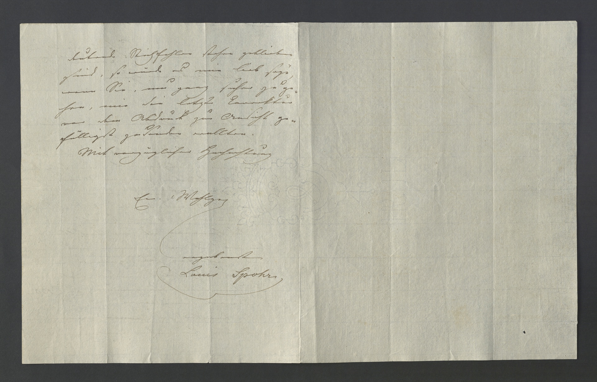 Text: "Wohlgeborner Herr, Beykommend erhalten Sie die 6 Duetten. Da Sie dieselben in 2 Heften herauszugeben wünschen, so habe ich den Titel demgemäß abgeändert. Die Folge kann dieselbe bleiben wie im Manuscript. Das 107te Werk wird demnach die Nummern 1, 3 und 5, das 108te die Nummern 2, 4 und 6 enthalten. Das Honorar ist Verhältniß zu dem, was ich in neuerer Zeit für Lieder erhalten habe, gewiß nicht zu hoch angesetzt; indeß will ich es, Ihrem Wunsche gemäß, auf 130 Rth. Pr. Courant ermäßigen. Da kürzlich in meinen Kompositionen bey andern Verlagen bedeutende Stichfehler stehen geblieben sind, so würde es mir lieb seyn, wenn Sie, um ganz sicher zu gehen, mir die letzte Correktur vor dem Abdruck zur Ansicht gefälligst zusenden wollten. Mit vorzüglicher Hochachtung Ew. Wohlgeb. ergebenster Louis Spohr". Karl Traugott Goldbach, Spohr-Briefe: <http://bit.ly/1Nmynr6>