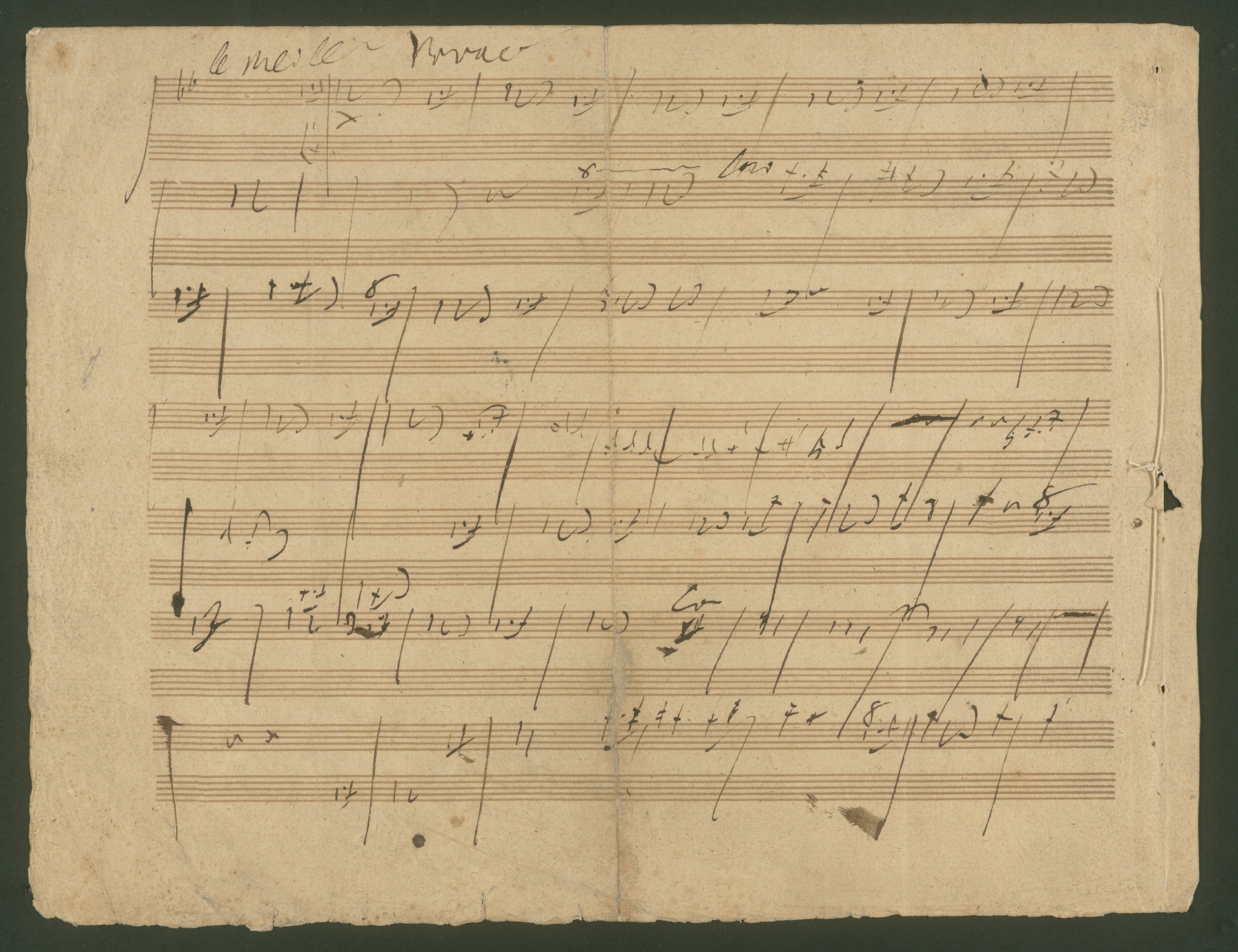 Auf diesem Skizzenblatt - es stammt wohl aus einem Heft, denn man kann noch Spuren der ehemaligen Heftung erkennen - finden sich auf der Rückseite Entwürfe zum 2. Satz der Hammerklaviersonate. Spannender ist jedoch der Text auf der Vorderseite: "[dreispaltig; links:] Adagio Cantique / From[m]er Gesang / in einer Sinfonie / in den alten Tonarten. [Mitte:] entweder / für sich allein / oder als Einleitung / in eine Fuge / (...) / [rechts:] vieleicht auf diese weise die / ganze 2te Sinfonie charakteri= /sirt wo alsdenn im lezten / [über die ganze Zeile:] Stück oder schon im adagio / die Singstimmen eintreten / die orchester Violinen etc werden beym lezten Stück verzehnfacht. / Oder das adagio wird auf gewiße weise im lezten / Stücke widerholt wobey alsdann erst die Singstim[m]en / nach u nach eintreten - im adagio text / griechischer Mithos Cantique Eclesiastique / im Allegro Feyer des Bachus."