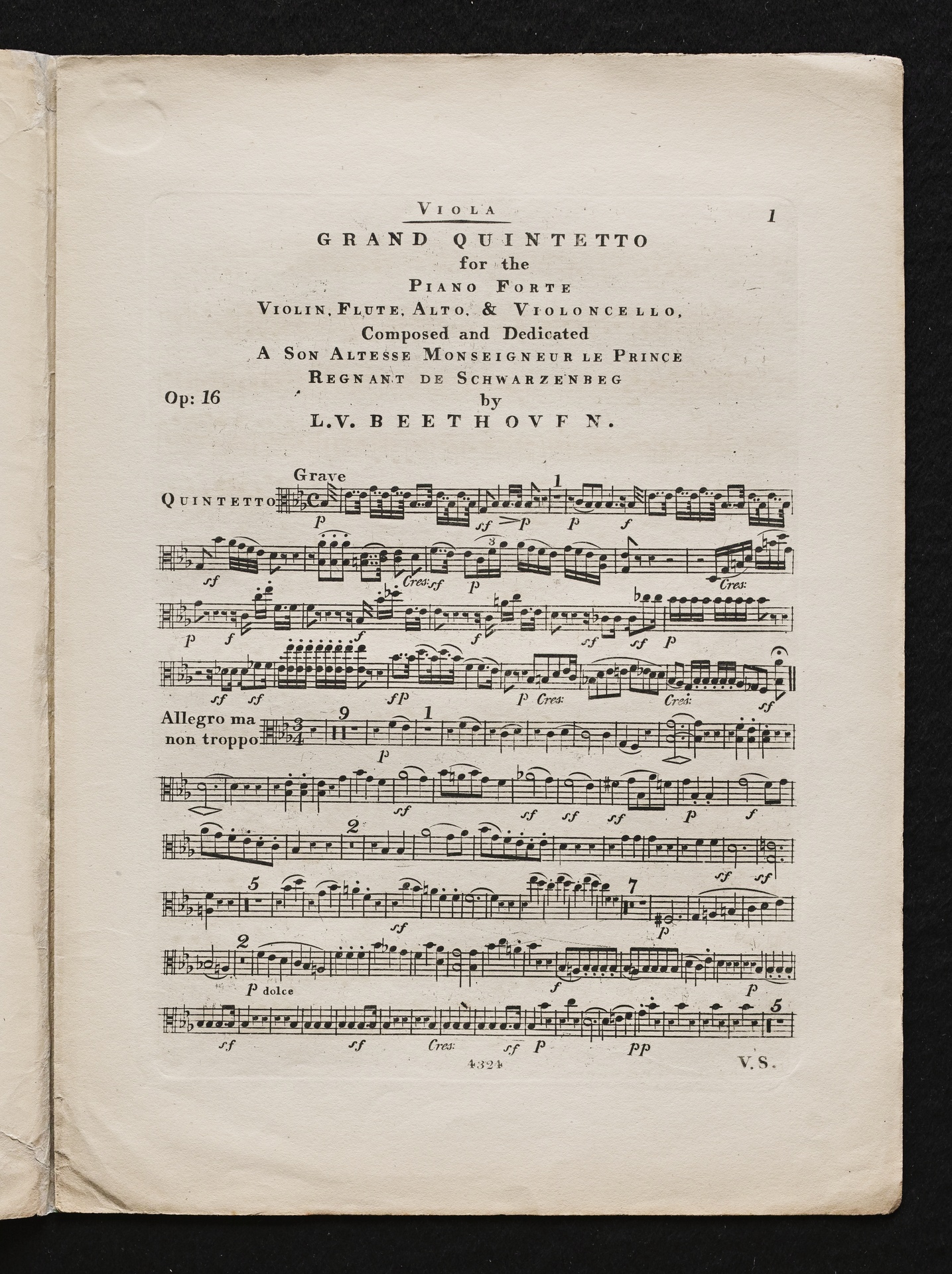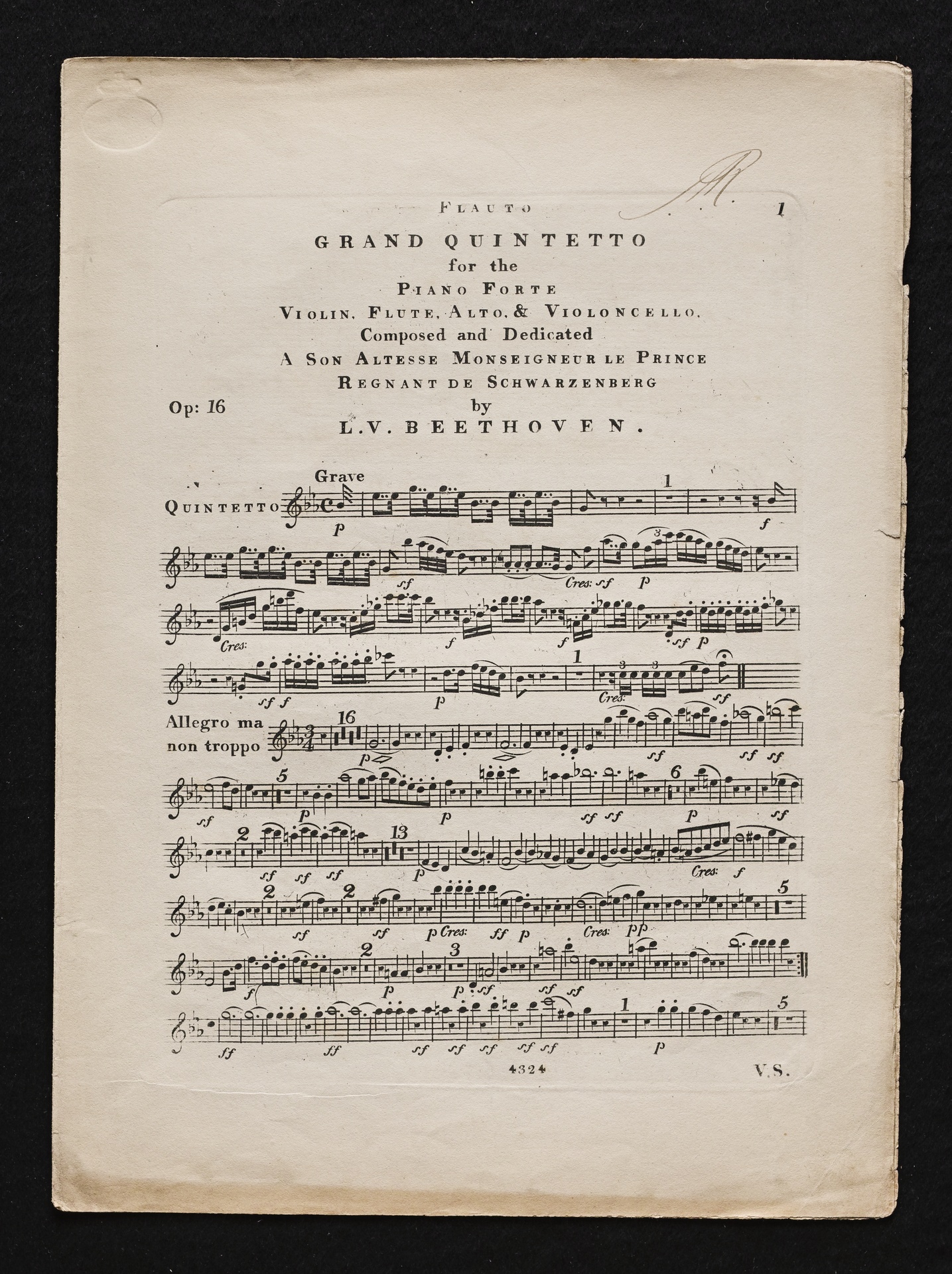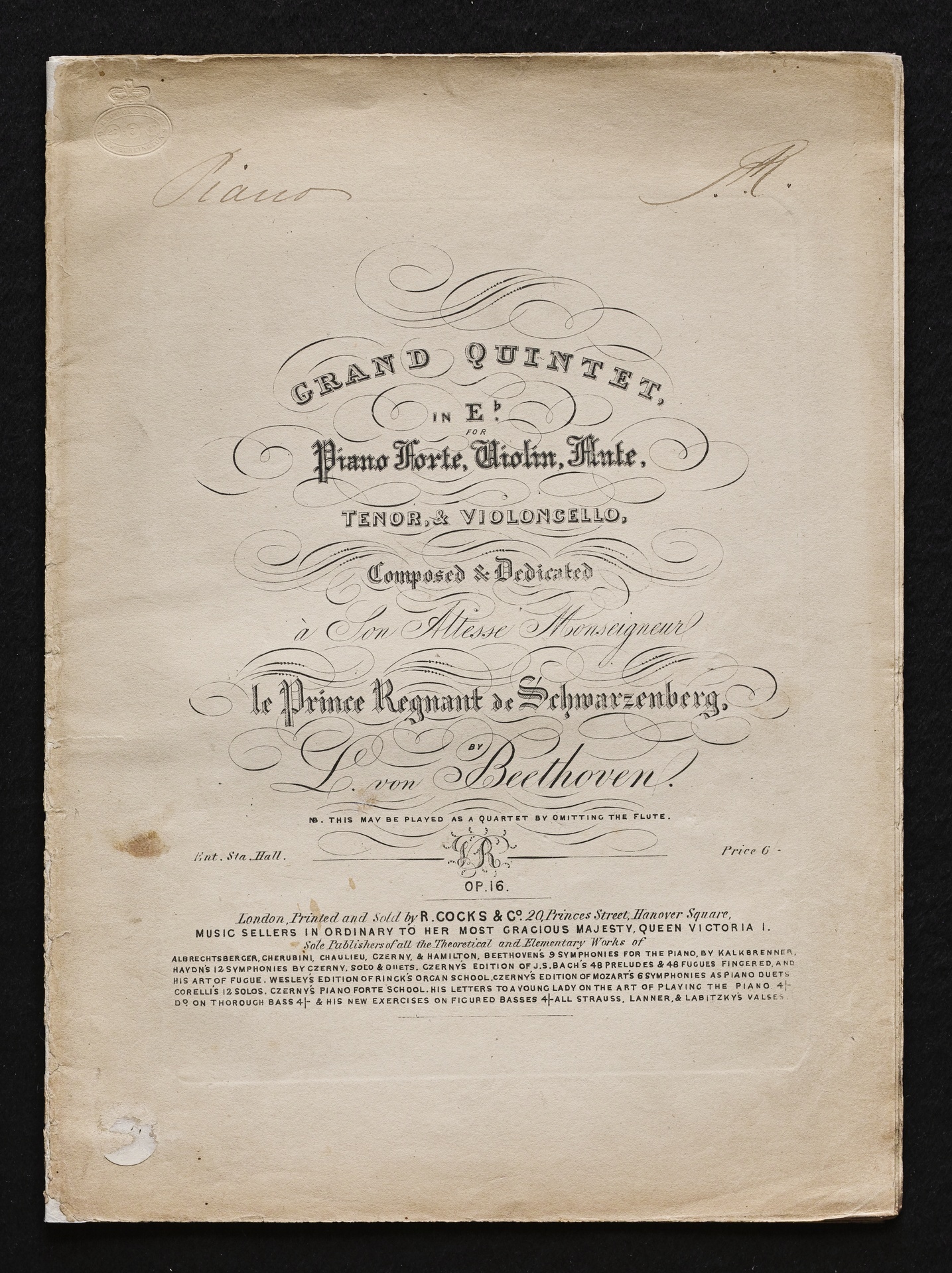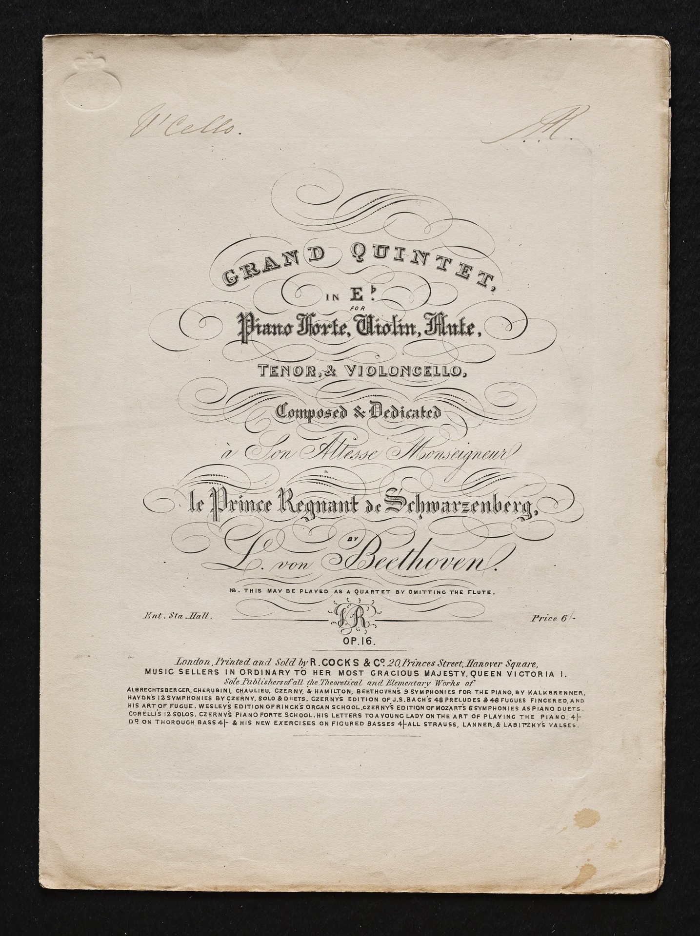 Ludwig van Beethoven, Quintett für Klavier, Oboe, Klarinette, Fagott und Horn (Es-Dur) op. 16, Bearbeitung für Klavier, Violine, Flöte, Violoncello, Stimmen, Cocks, 4324