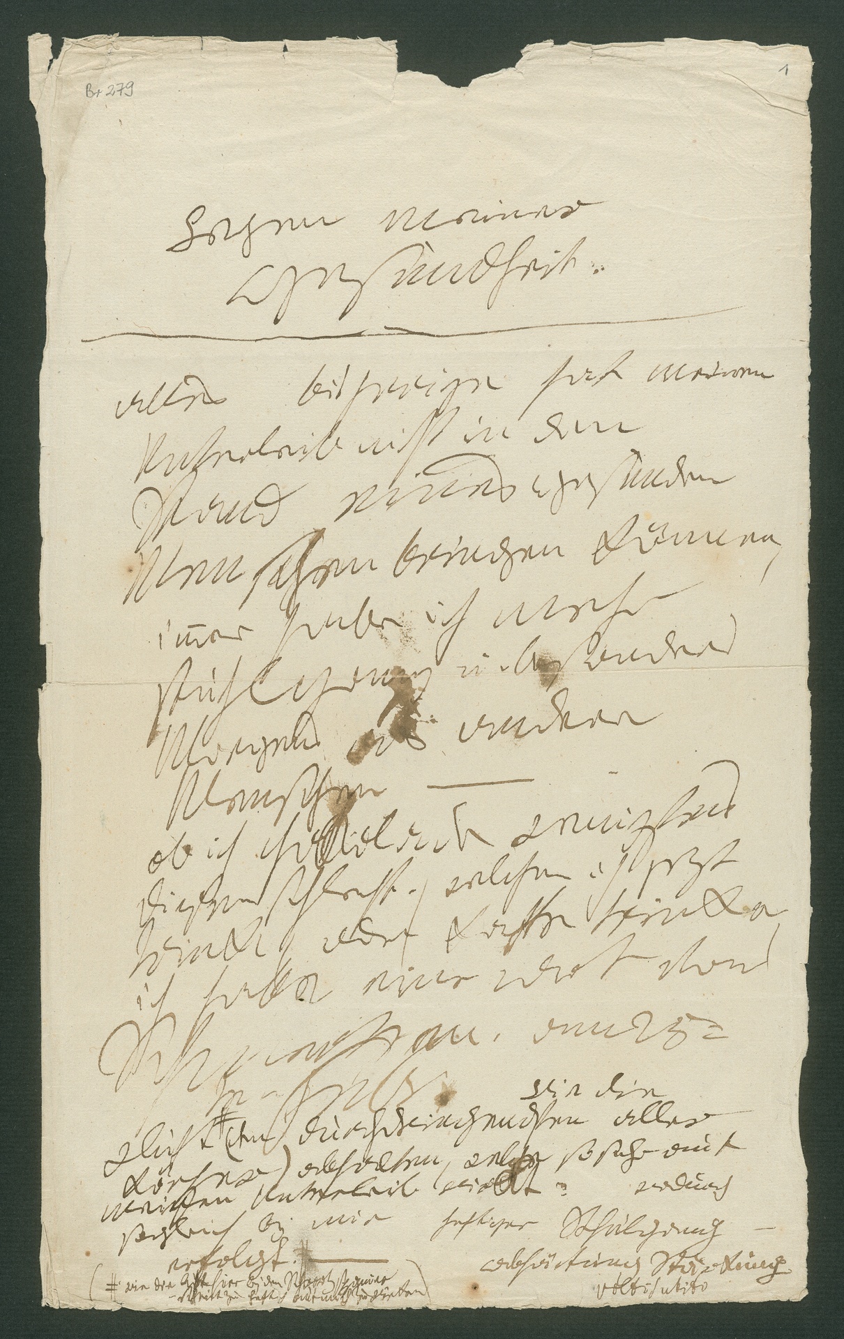 Übertragung: [recto:] Wegen meiner / Gesundheit. / Alles bisherige hat meinen / Unterleib nicht in den / Stand eines Gesunden / Menschen bringen können, / im[m]er habe ich mehr / stuhlgang u. besonders / morgens als andere / Menschen - / ob ich Ga[?]lande wenigstens / diesem schlecht, welchen ich jetzt / trinke, oder Kaffe trinke, / ich habe eine Art von / Schmerzen am 25- / ten Febr. [andere Feder:] wie die / Luft # (den durchdringendsten aller / Körper) abhalten, welche so sehr auf / meinen Unterleib wirkt. wodurch / sogleich bey mir heftiger Stuhlgang - / erfolgt. <#> - Abführung Stärkung / volti subito / (# wie die Luft hier bey dem Schwarzspanier / - scheint zu heftig auf mich zu wirken) / [verso:] Aüßere Einreibungen würden das beste seyn - (J.R.)