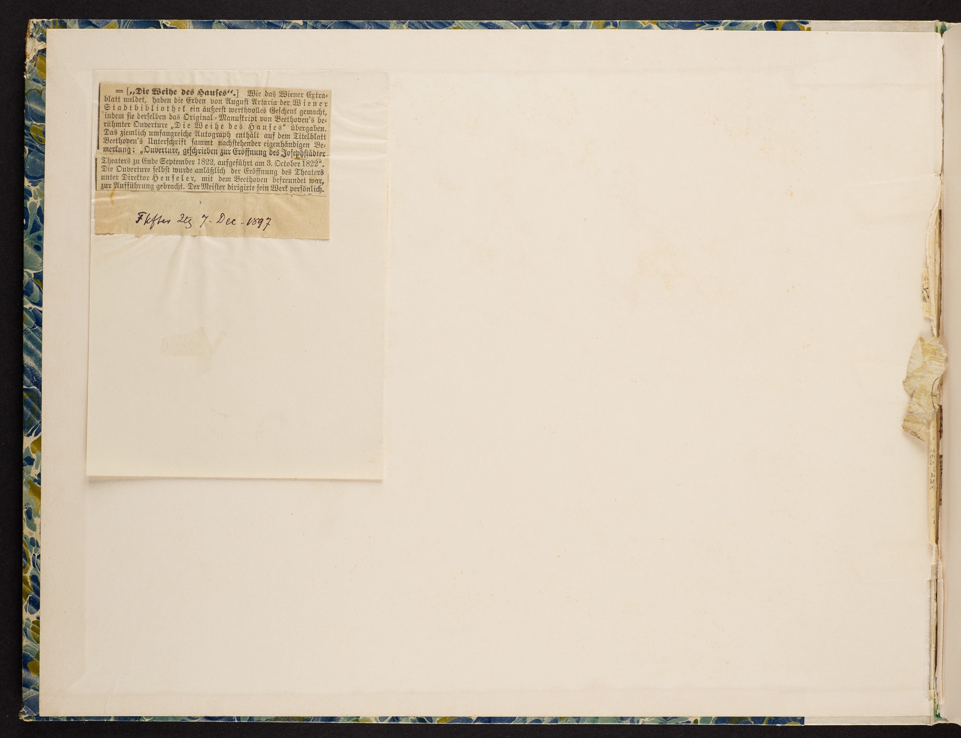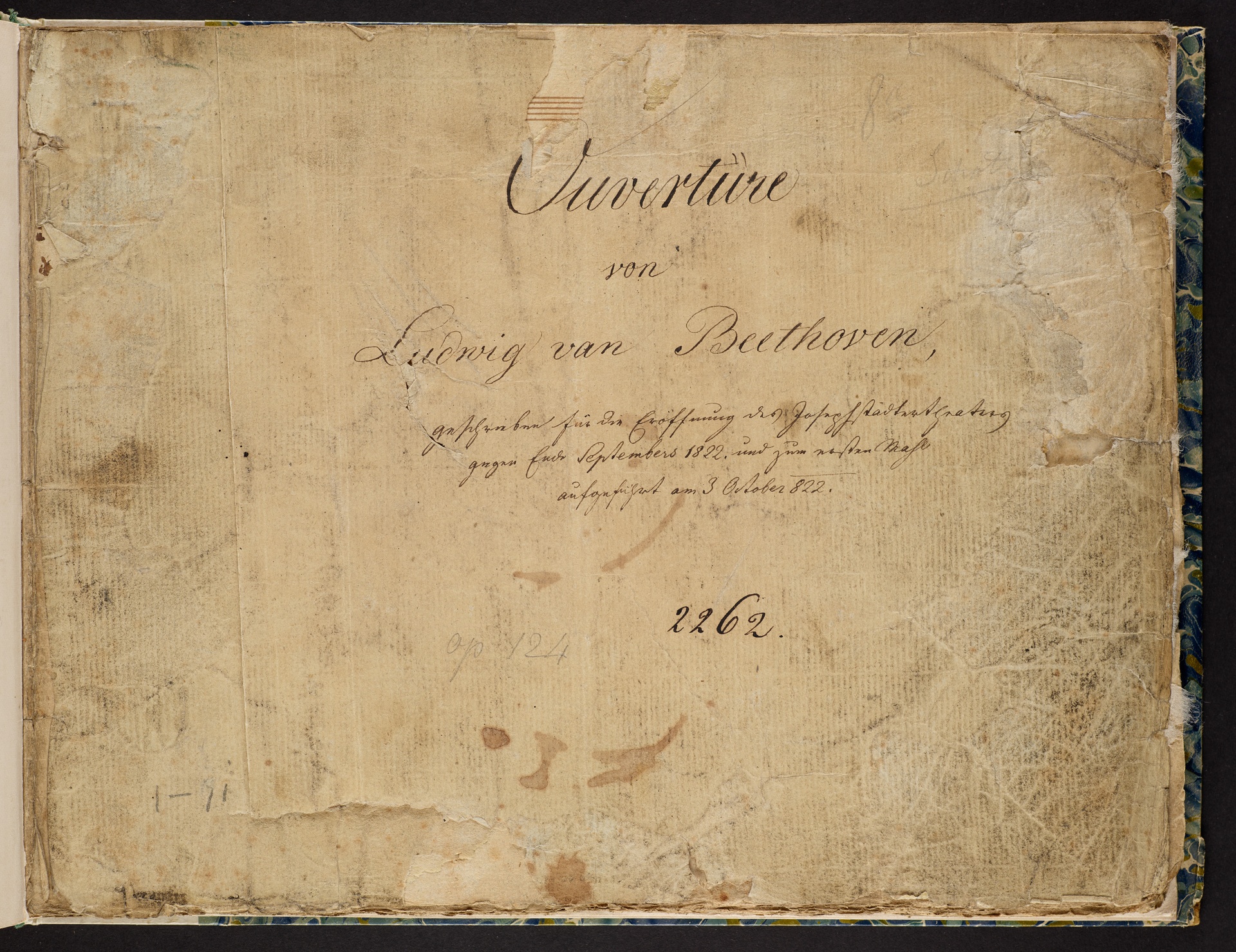 Den Beinamen "Die Weihe des Hauses" trägt die Ouvertüre weder im Autograph noch in den Abschriften noch in der Originalausgabe. Der Kopist hatte in der Eile sogar übersehen, dass es sich um ein neues Werk handelte und ihm dieselbe Überschrift wie die wiederzuverwendenden Stücke gegeben: "Die Ruinen von Athen". Lediglich der Titelzusatz belegt, dass das Werk tatsächlich als Eingangsmusik zur "Eröffnung des Josephstädter Theaters aufgeführt" worden war. Beethoven ergänzte zur Sicherheit noch das Datum "am 3. Oktober 1822" und seine Unterschrift. (F.G.)
