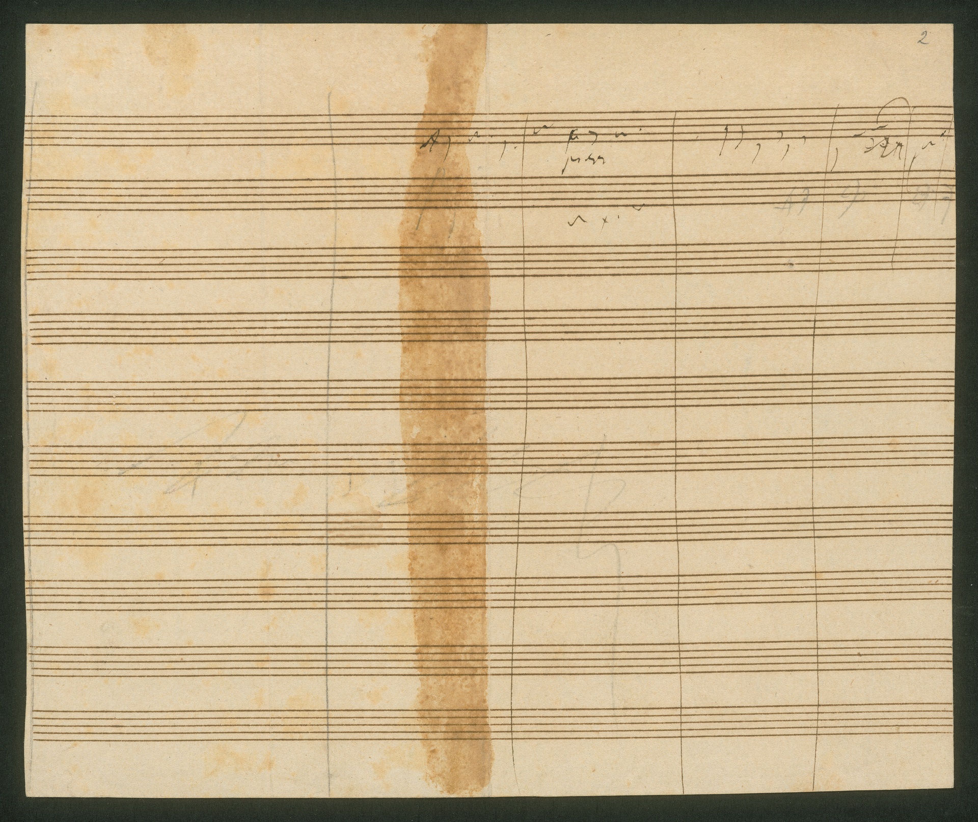 Beethoven erhielt den Auftrag, eine Schauspielmusik zu Johann Wolfgang Goethes Trauerspiel Egmont zu komponieren, im Herbst 1809. Goethe hatte bereits im Text an etlichen Stellen Musik vorgesehen, wie die Regieanweisungen deutlich machen. Für eine Aufführung des Dramas bestellte nun k. k. Hoftheaterdirektor Joseph Hartl eine Umsetzung des Goetheschen Regiekonzepts. Das vorliegende Skizzenblatt stammt vermutlich noch aus der Anfangsphase von Beethovens Beschäftigung mit dem Stoff. Davon zeugen die vielen Anmerkungen, die er sich zum Trauerspiel machte. So notierte er sich beispielsweise am oberen Rand: "3ter Akt so laß mich sterben die Welt hat keine Freuden auf diese", die beschließenden Worte Klärchens im 3. Akt. Weiter unten macht er sich Gedanken zur Musik: "vielleicht doch besser nur(?) Marsch" und "4ter Akt einfallend während der Vorhang noch auf". (J.R.)