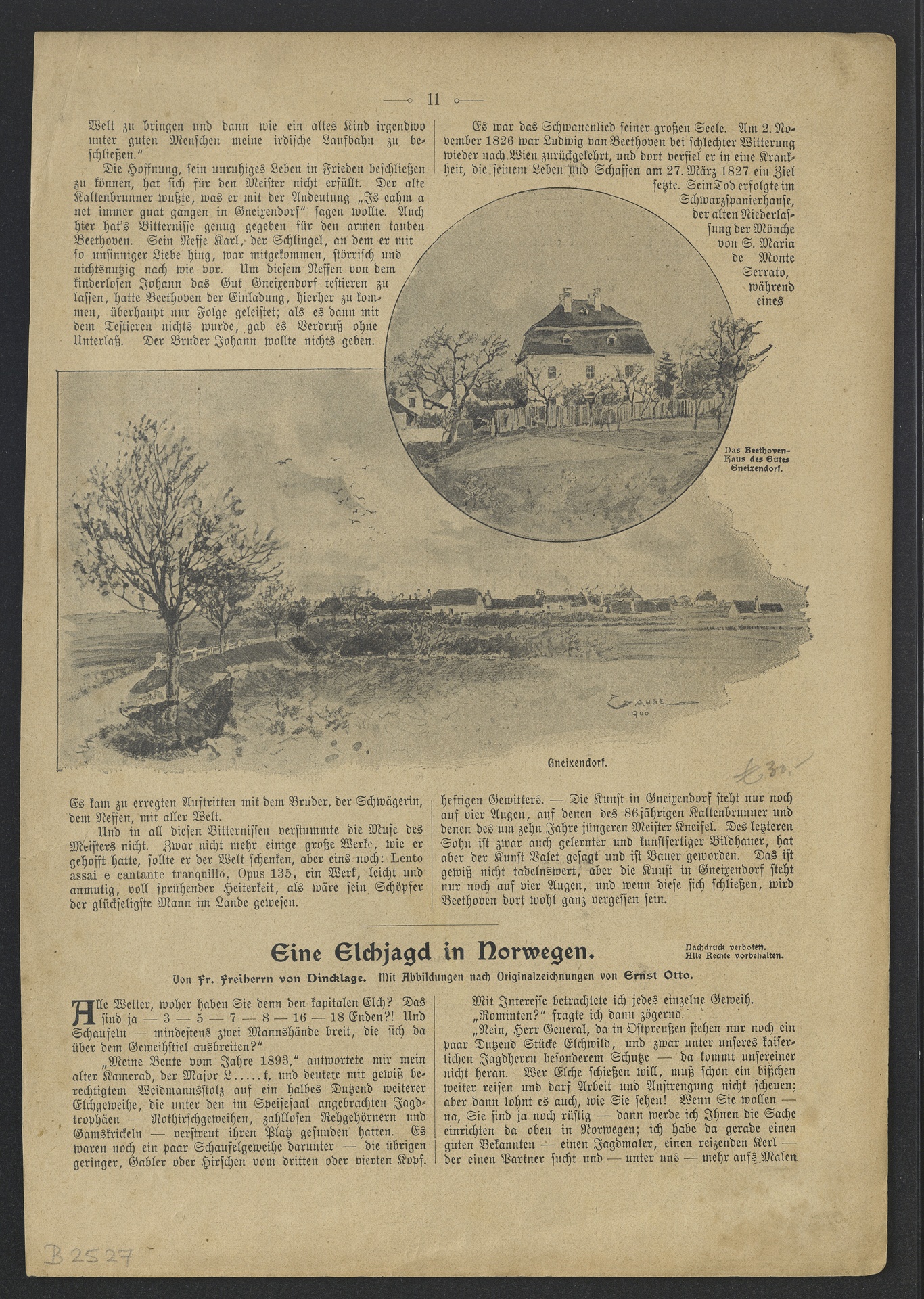 Blick auf Gneixendorf und Nahansicht des Beethoven-Hauses - zwei Aquarelle oder Tuschpinselzeichnungen von Wilhelm Gause, Reproduktionsdruck, Leipzig, 1901