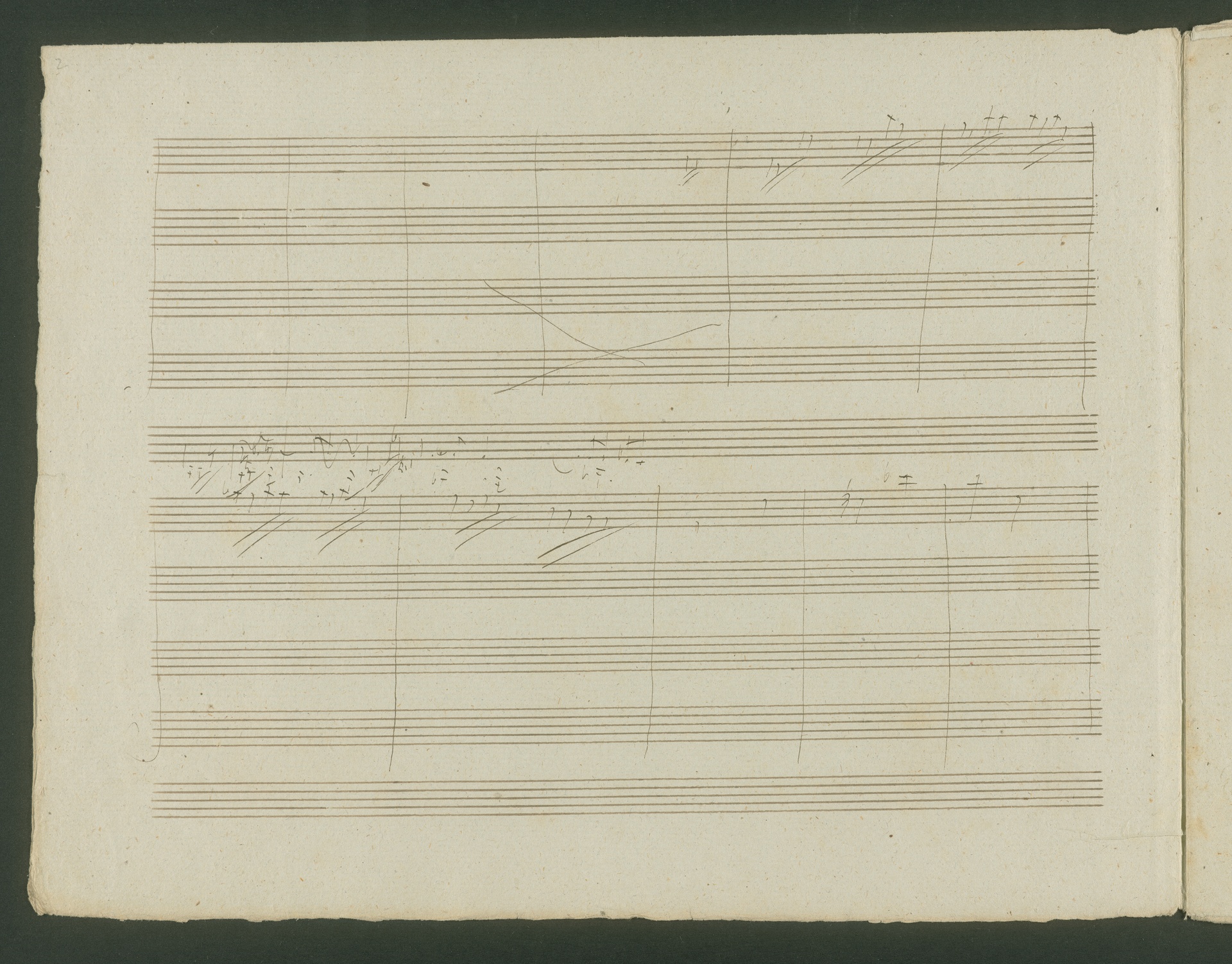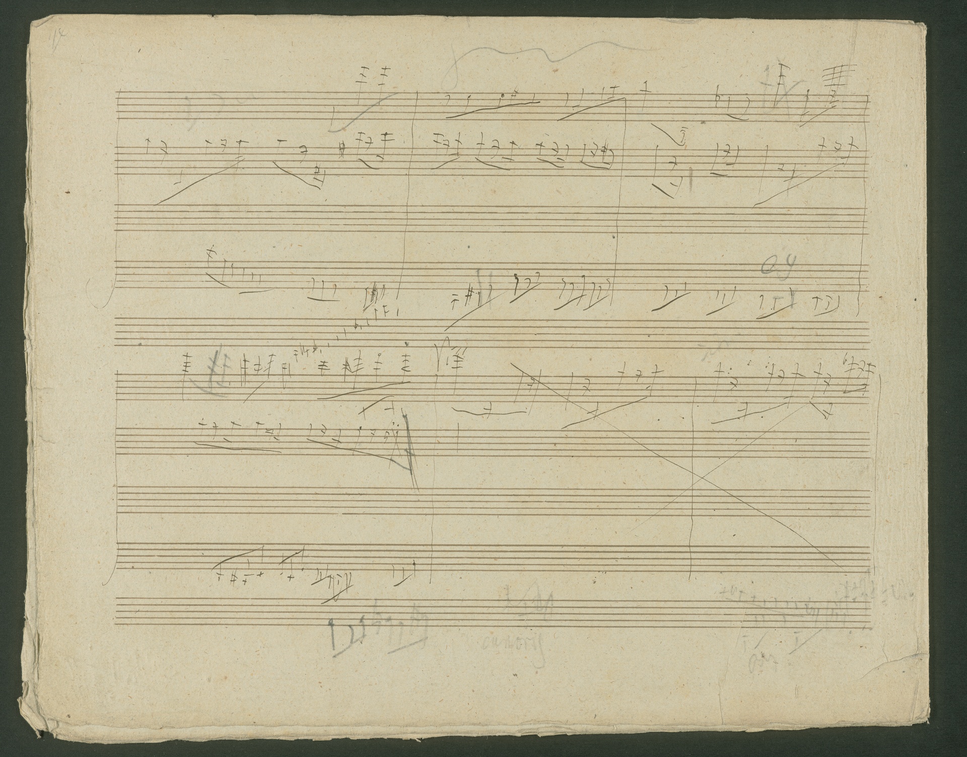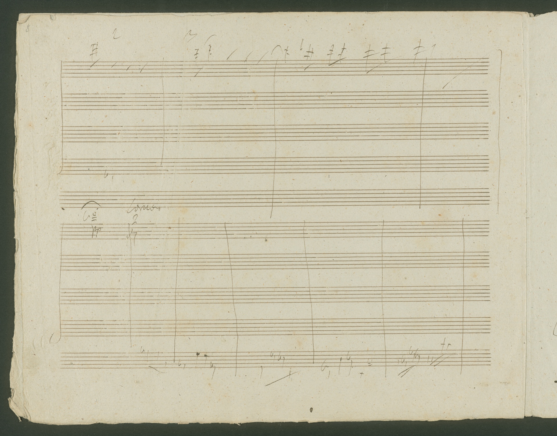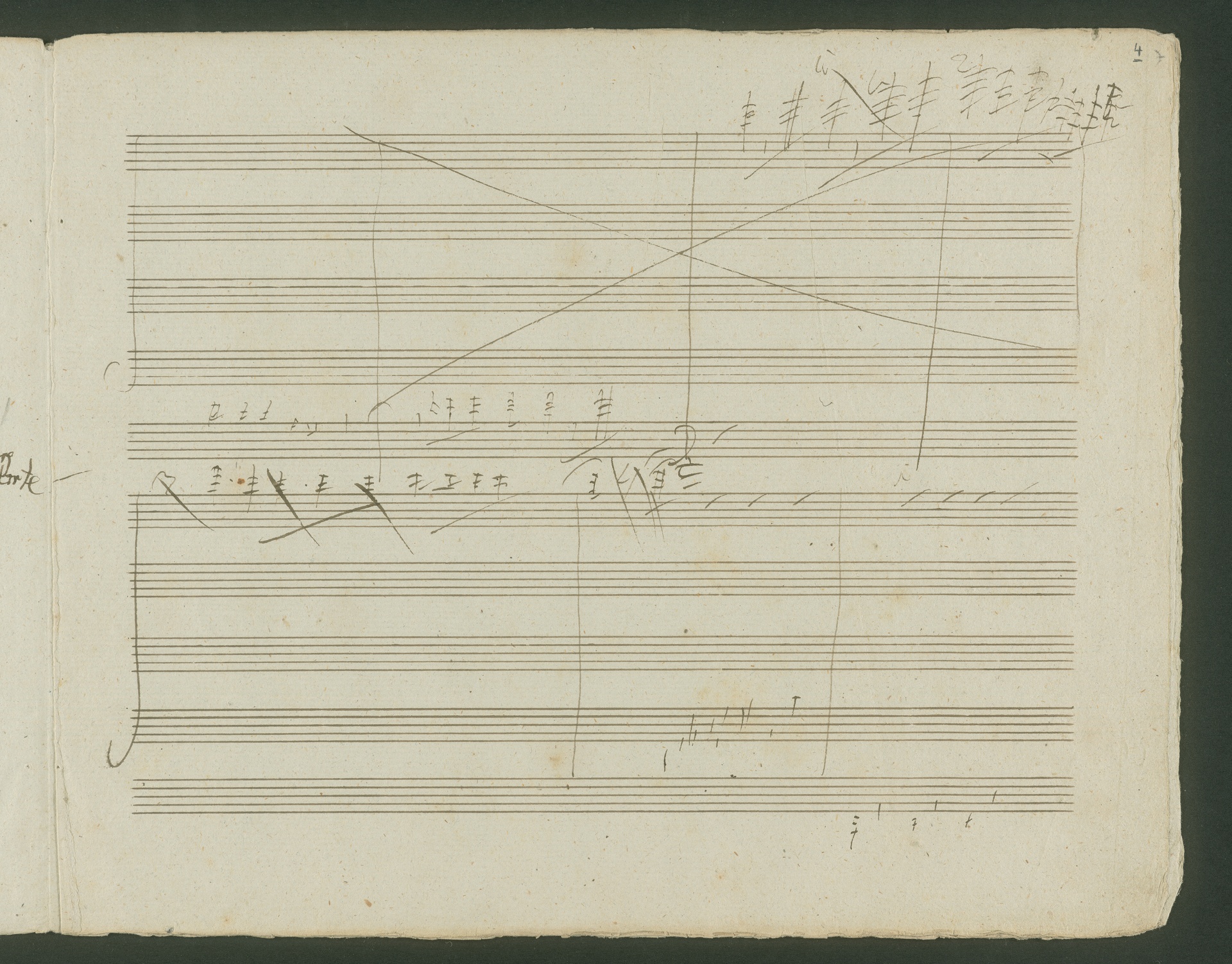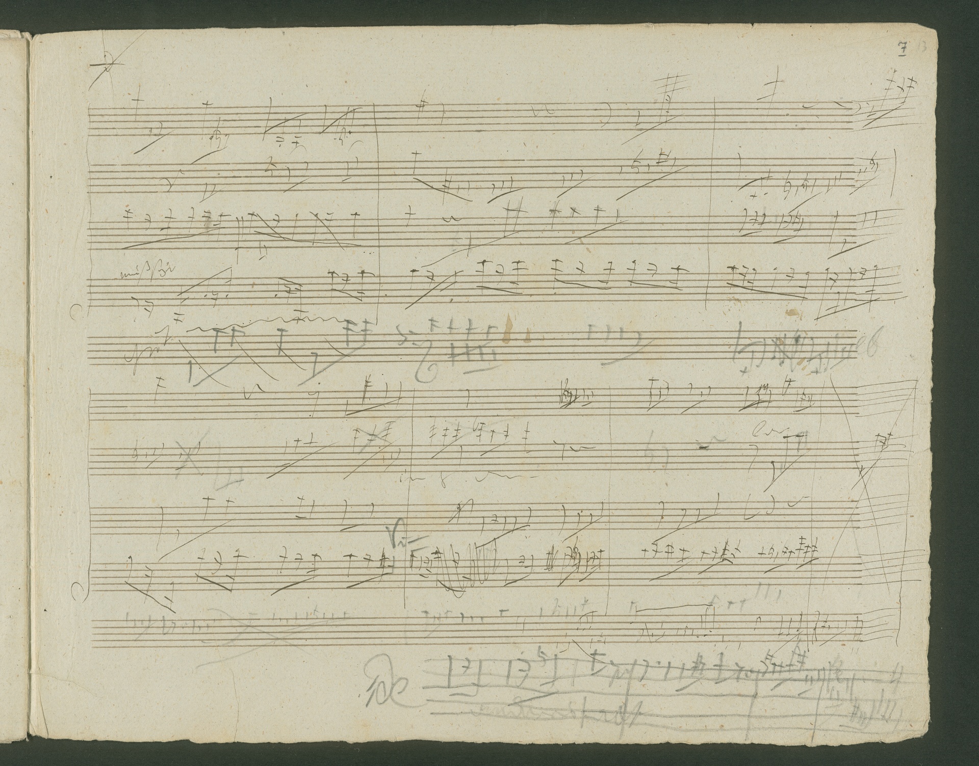 Beethoven skizzierte auf den abgebildeten Blättern die Anlage der Streichquartett-Fuge op. 133. Er hatte sie zunächst als Schlusssatz zum Quartett op. 130 geplant, später jedoch ausgesondert und durch einen neuen ersetzt. Als Finale war der Satz vielen seiner Zeitgenossen zu komplex.
