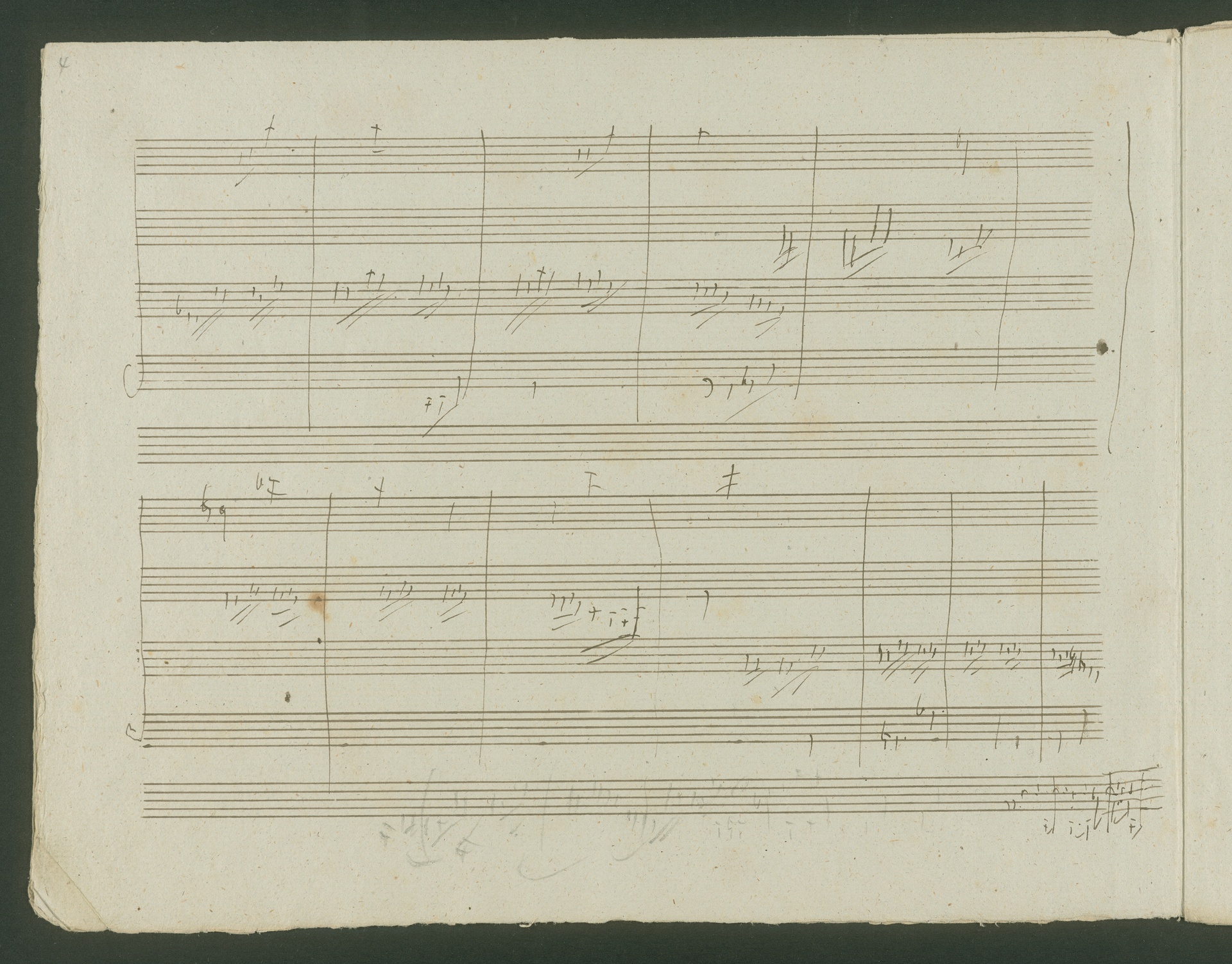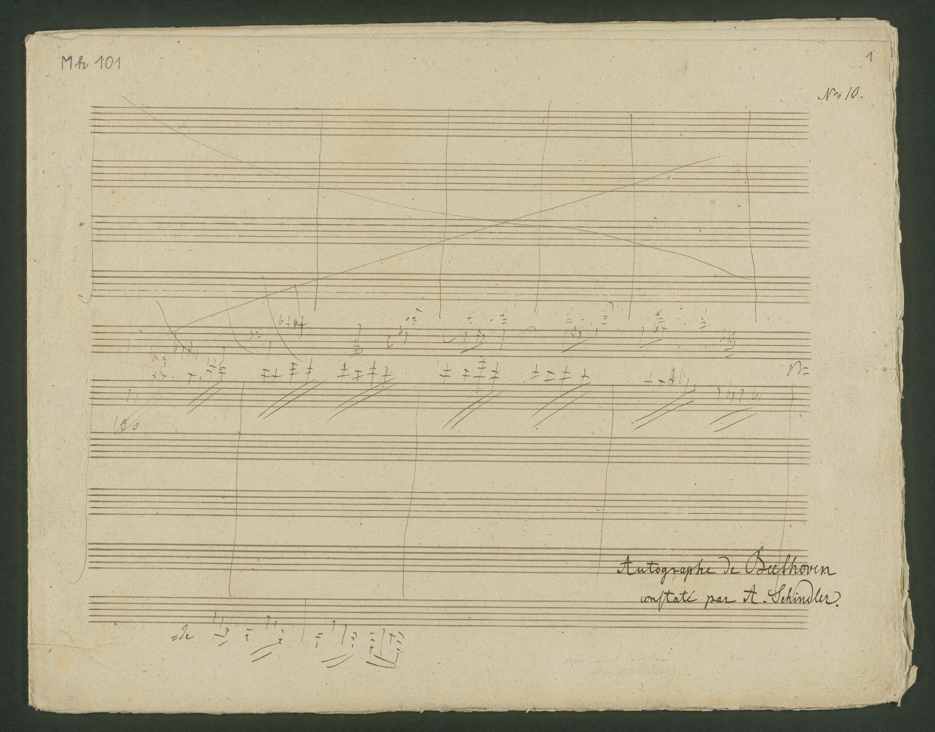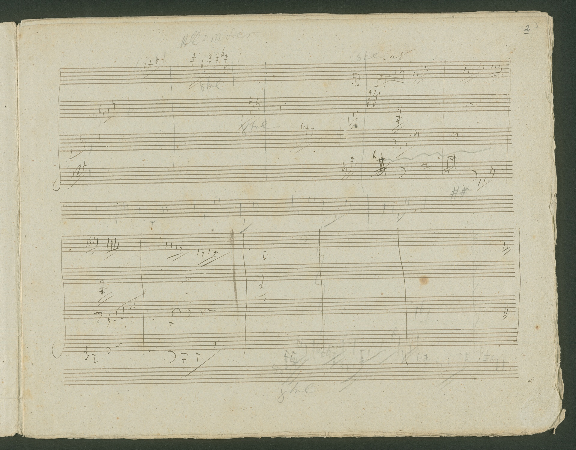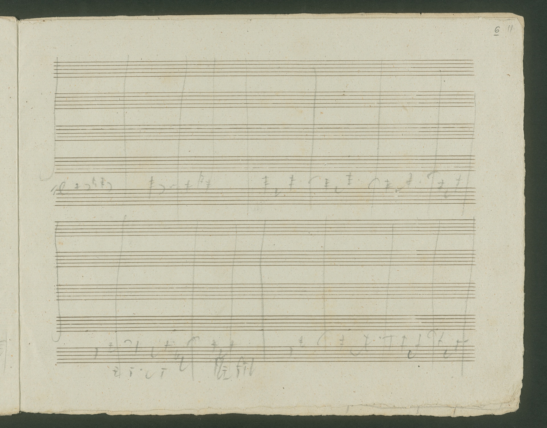 Beethoven skizzierte auf den abgebildeten Blättern die Anlage der Streichquartett-Fuge op. 133. Er hatte sie zunächst als Schlusssatz zum Quartett op. 130 geplant, später jedoch ausgesondert und durch einen neuen ersetzt. Als Finale war der Satz vielen seiner Zeitgenossen zu komplex.