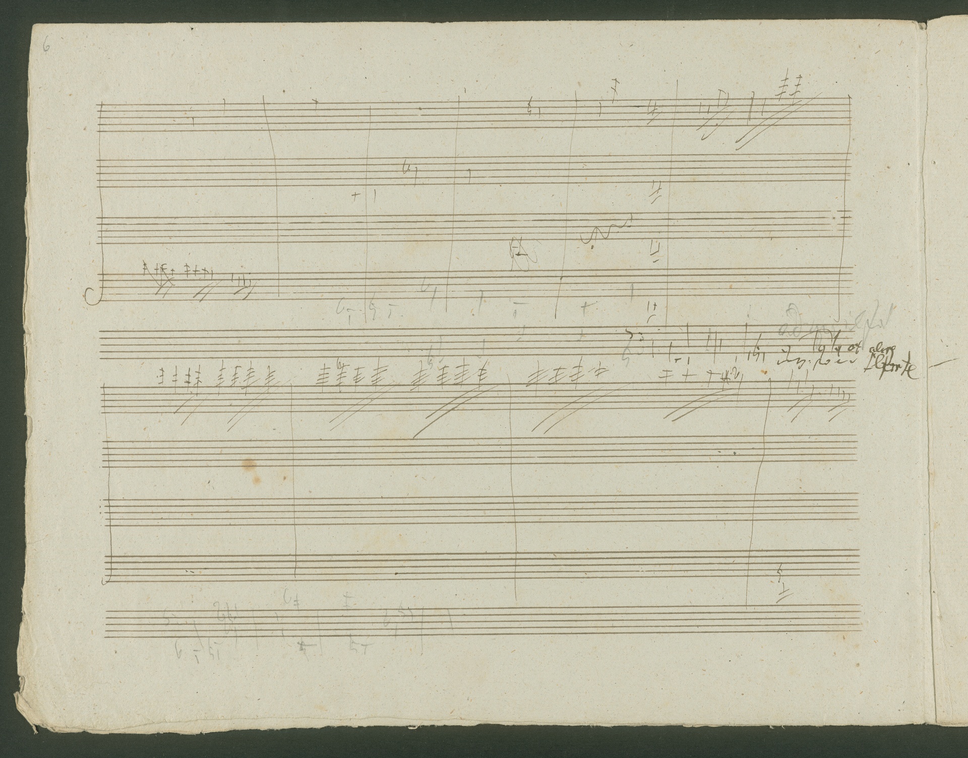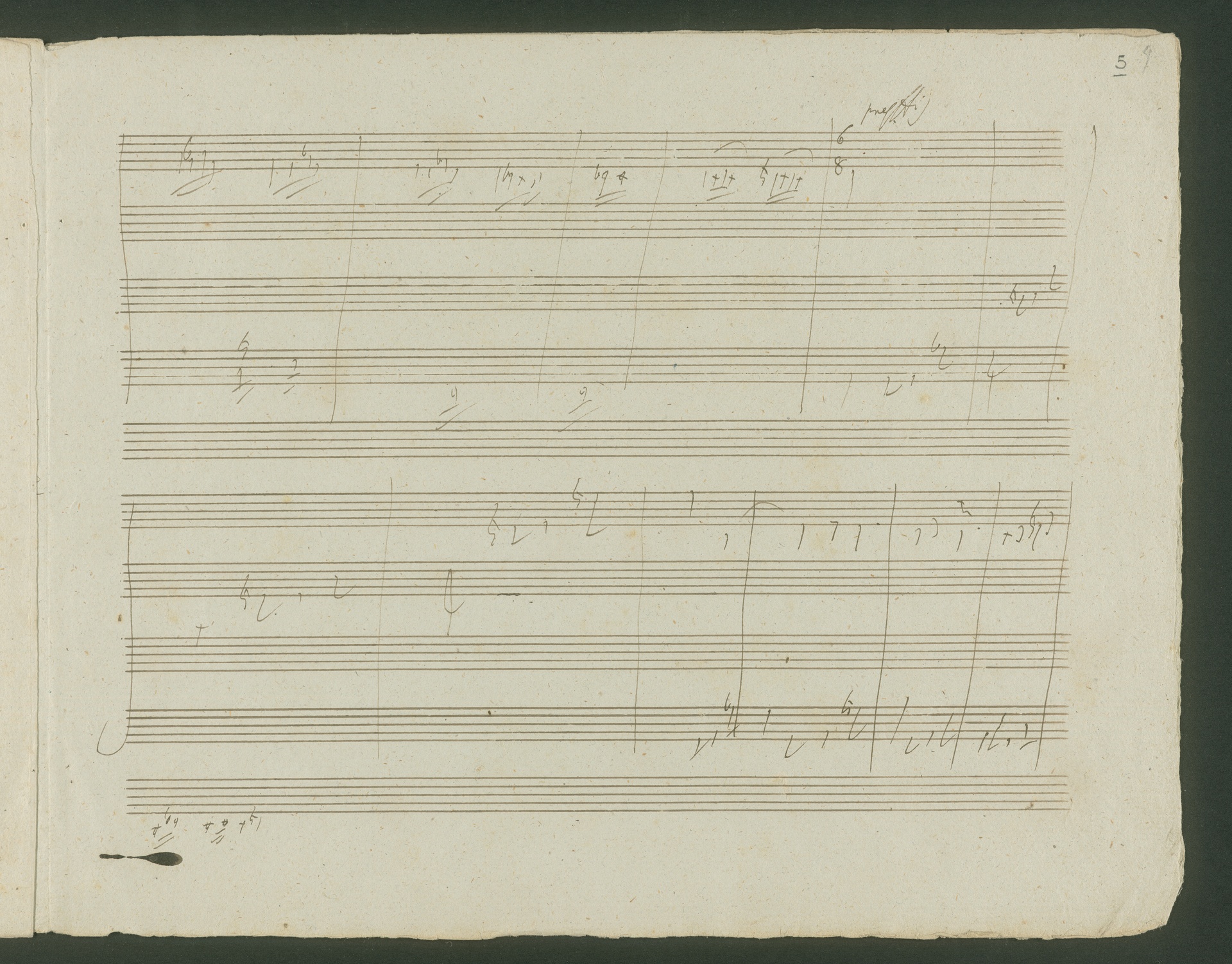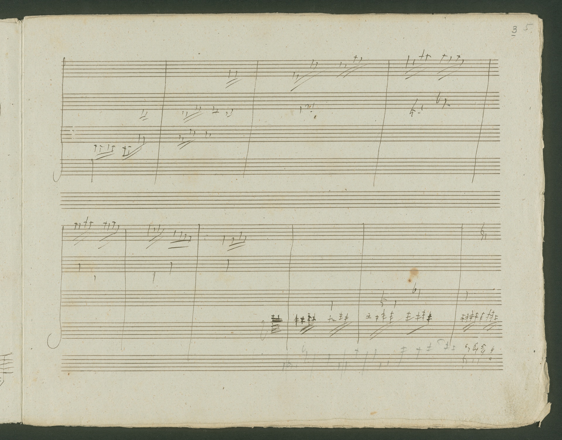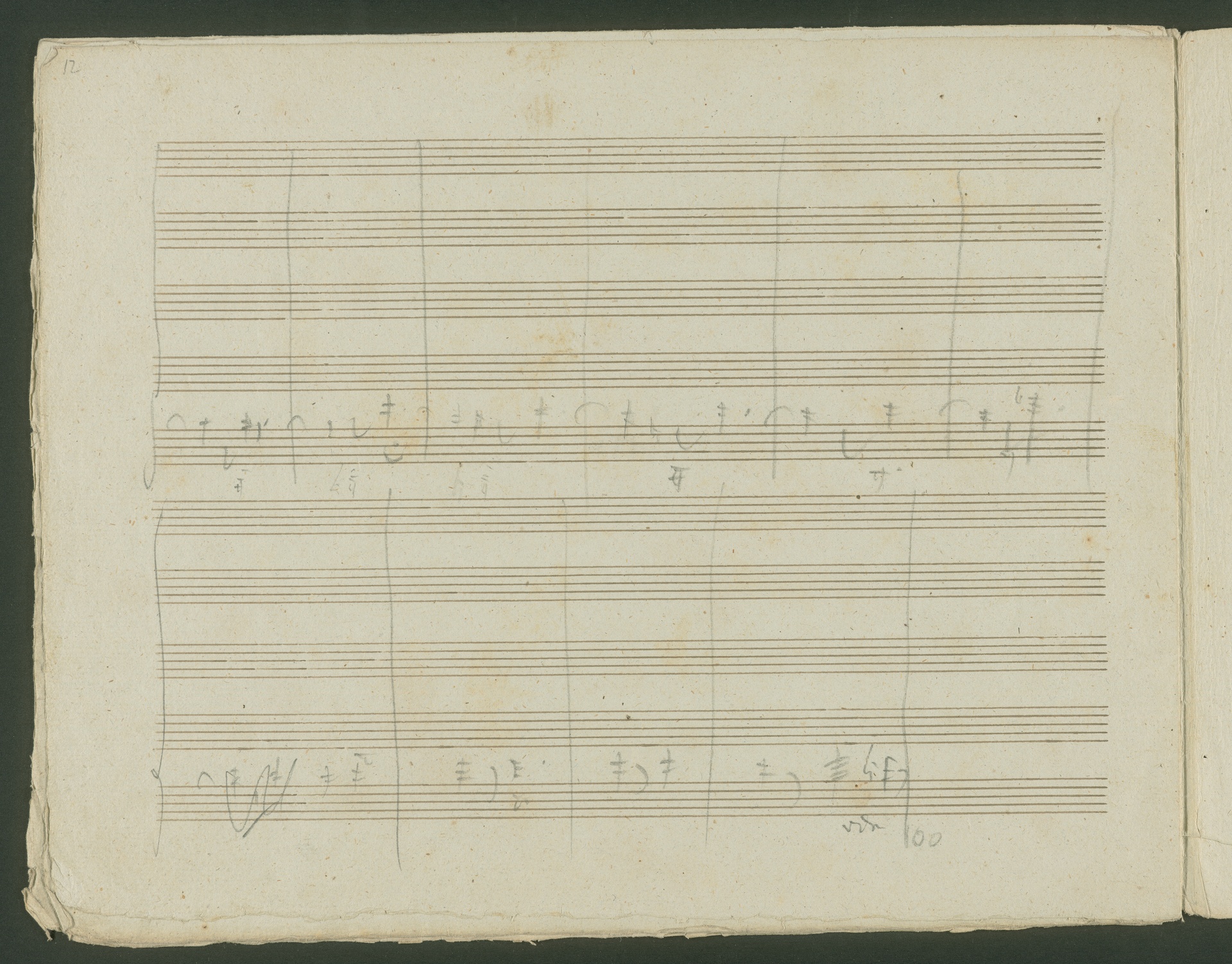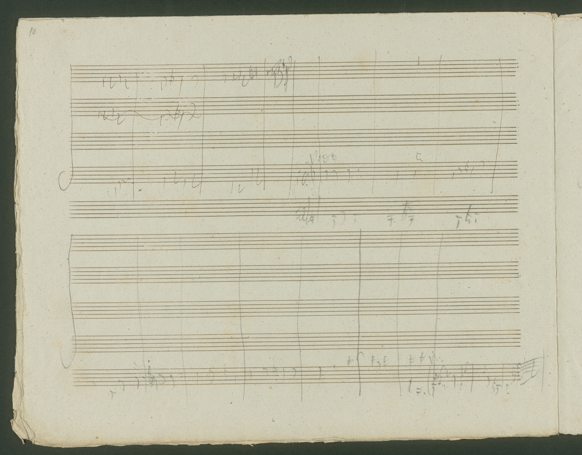 Beethoven skizzierte auf den abgebildeten Blättern die Anlage der Streichquartett-Fuge op. 133. Er hatte sie zunächst als Schlusssatz zum Quartett op. 130 geplant, später jedoch ausgesondert und durch einen neuen ersetzt. Als Finale war der Satz vielen seiner Zeitgenossen zu komplex.