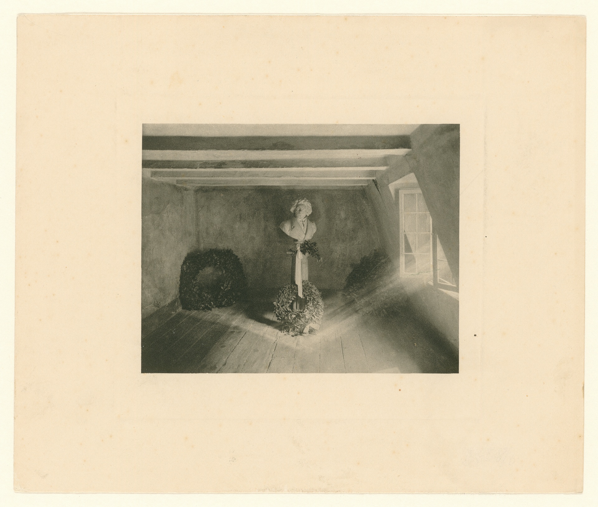 Beethoven-Haus, Bonn, Bonngasse, Geburtszimmer vor dem Einbau des zweiten Fensters, mit Büste von Karl Voss - Heliogravüre der Firma Deutsche Photogravur Aktiengesellschaft Siegburg nach einer retuschierten Fotografie, u.U. unter Verwendung einer Vorlage von 1910, Bonn um 1927