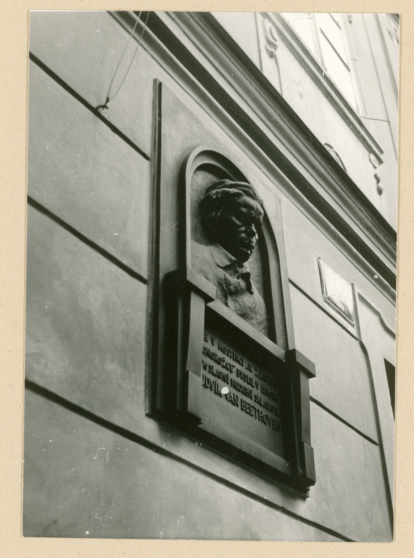 Ludwig van Beethoven - Relief von Otakar Spaniel von 1926, Gedenktafel am Haus "Zum Goldenen Einhorn" in Prag, Fotografie, wohl von Marta Adamkova, Prag, 1968
