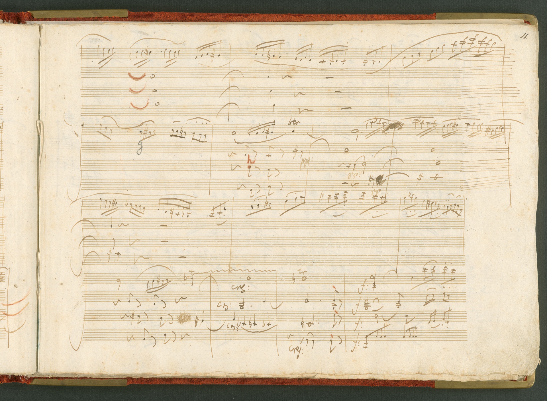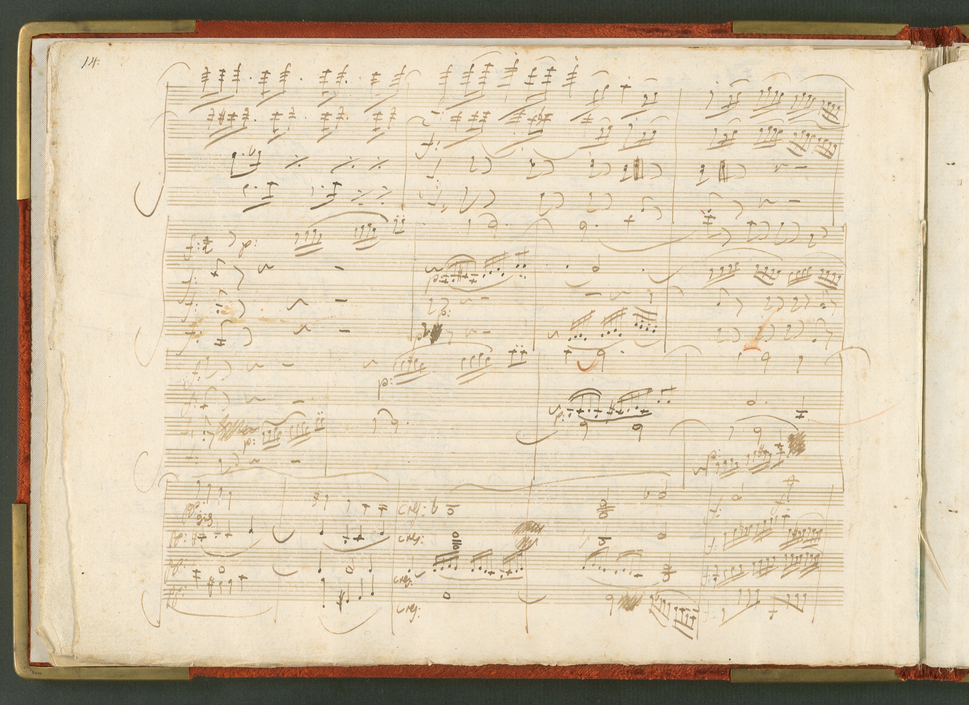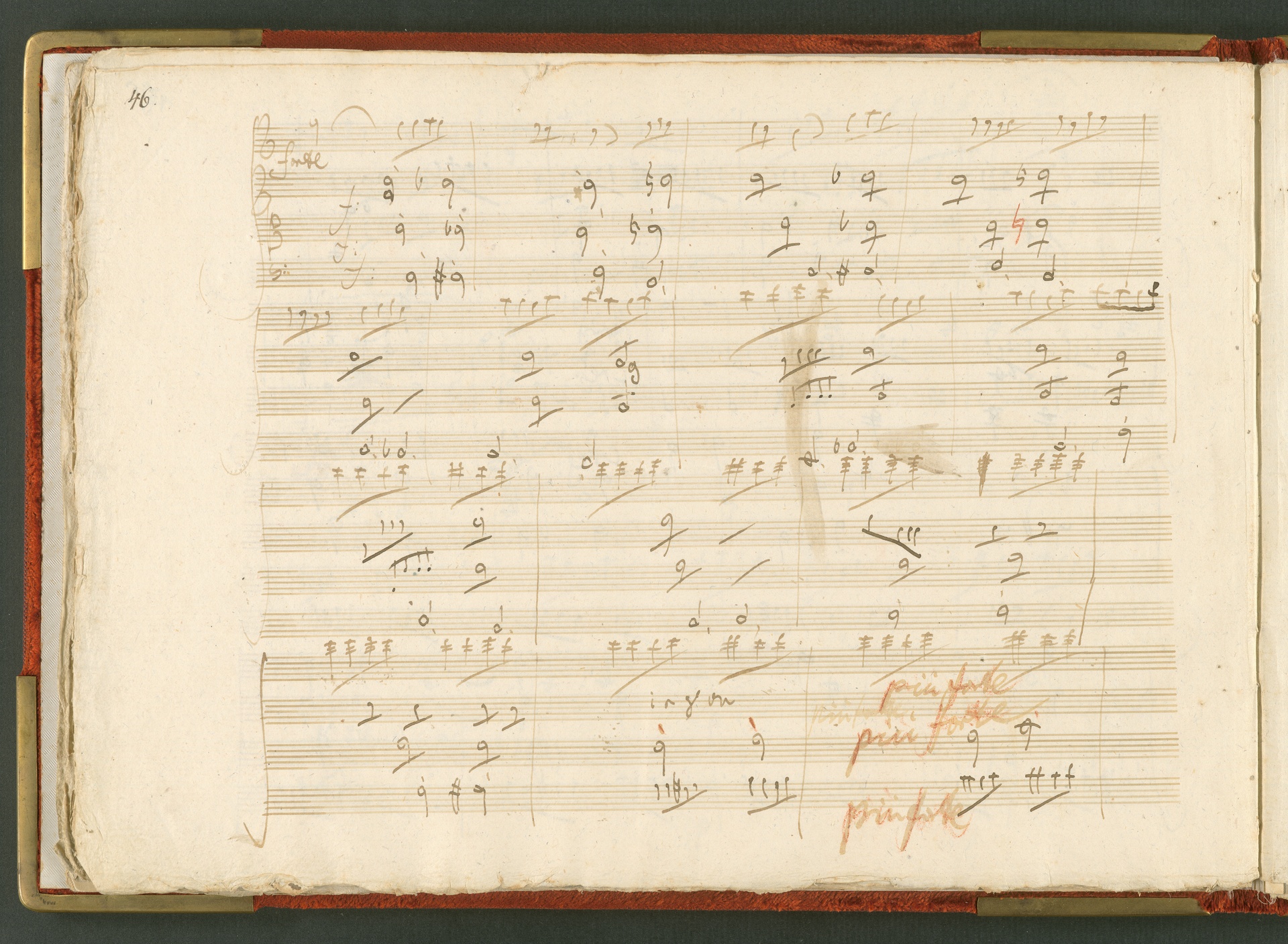 Die hier abgebildete Handschrift ist das Partitur-Autograph des Streichquartetts op. 59 Nr. 3, des letzten der sogenannten Rasumowsky-Quartette. Andreas Kyrillowitsch Graf Rasumowsky (1752-1836), Gesandter des Zaren am Wiener Hof, war leidenschaftlicher Musikliebhaber und unterhielt zwischen 1808 und 1816 ein eigenes Hausquartett unter der Leitung von Ignaz Schuppanzigh. Obwohl Rasumowsky und Beethoven sich gut kannten, liegt die Widmung der drei Quartette an Rasumowsky nicht nur in der Freundschaft zwischen dem Grafen und dem Komponisten begründet, denn reiche Gönner bezahlten für Widmungen auf musikalischen Werken. Der Einfluß Rasumowskys auf die Quartette wird auch deutlich in der Verwendung russischer Volksmelodien, die Beethoven in die ersten beiden Quartette einbaute. Im dritten Quartett verzichtete er darauf, es ist insgesamt schlichter angelegt. Dies trug vielleicht mit dazu bei, dass das dritte Quartett von den Zeitgenossen als das einzig erträgliche der Reihe angesehen wurde, während vor allem die ersten beiden in der Kritik der Allgemeinen musikalischen Zeitung (27. Februar 1807) schlecht weg kamen. Sie wurden als "sehr lang und schwierig, tiefgedacht und trefflich gearbeitet, aber nicht allgemein fasslich" charakterisiert. Der Erfolg des dritten Rasumowsky-Quartetts lässt sich auch an der Tatsache messen, dass es schon zu Beethovens Lebzeiten bearbeitet wurde: 1819 für Klavier und 1820 für zwei Gitarren. Die Beliebtheit des Quartetts blieb bestehen: Die Fuge des letzten Satzes kannten viele Fernsehzuschauer als Erkennungsmelodie des "Literarischen Quartetts" ... (J.R.)