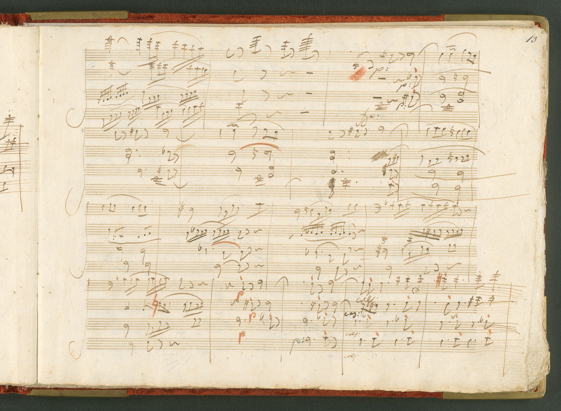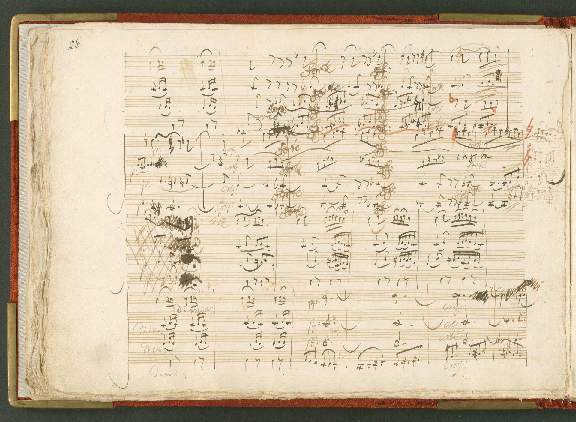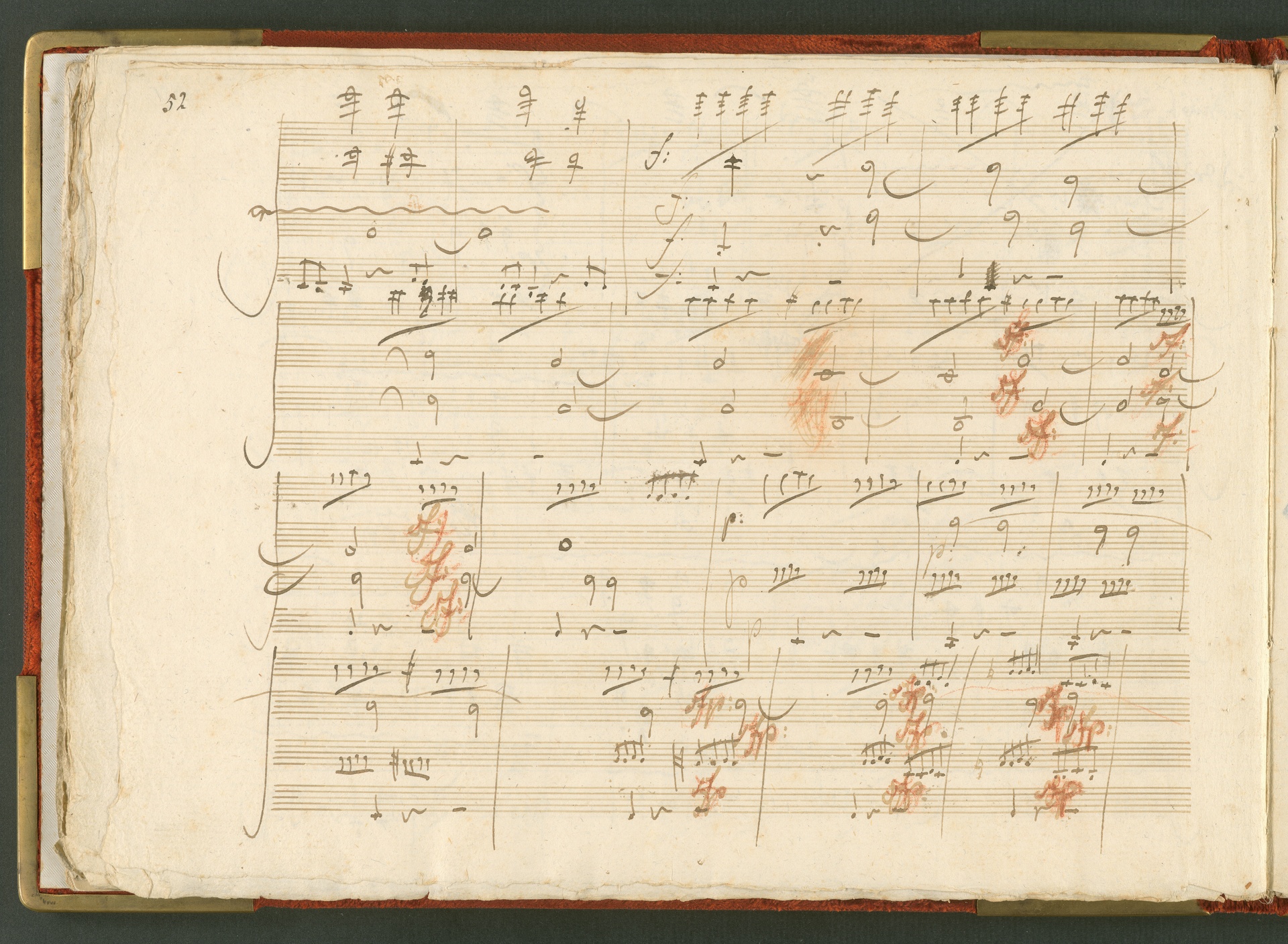 Die hier abgebildete Handschrift ist das Partitur-Autograph des Streichquartetts op. 59 Nr. 3, des letzten der sogenannten Rasumowsky-Quartette. Andreas Kyrillowitsch Graf Rasumowsky (1752-1836), Gesandter des Zaren am Wiener Hof, war leidenschaftlicher Musikliebhaber und unterhielt zwischen 1808 und 1816 ein eigenes Hausquartett unter der Leitung von Ignaz Schuppanzigh. Obwohl Rasumowsky und Beethoven sich gut kannten, liegt die Widmung der drei Quartette an Rasumowsky nicht nur in der Freundschaft zwischen dem Grafen und dem Komponisten begründet, denn reiche Gönner bezahlten für Widmungen auf musikalischen Werken. Der Einfluß Rasumowskys auf die Quartette wird auch deutlich in der Verwendung russischer Volksmelodien, die Beethoven in die ersten beiden Quartette einbaute. Im dritten Quartett verzichtete er darauf, es ist insgesamt schlichter angelegt. Dies trug vielleicht mit dazu bei, dass das dritte Quartett von den Zeitgenossen als das einzig erträgliche der Reihe angesehen wurde, während vor allem die ersten beiden in der Kritik der Allgemeinen musikalischen Zeitung (27. Februar 1807) schlecht weg kamen. Sie wurden als "sehr lang und schwierig, tiefgedacht und trefflich gearbeitet, aber nicht allgemein fasslich" charakterisiert. Der Erfolg des dritten Rasumowsky-Quartetts lässt sich auch an der Tatsache messen, dass es schon zu Beethovens Lebzeiten bearbeitet wurde: 1819 für Klavier und 1820 für zwei Gitarren. Die Beliebtheit des Quartetts blieb bestehen: Die Fuge des letzten Satzes kannten viele Fernsehzuschauer als Erkennungsmelodie des "Literarischen Quartetts" ... (J.R.)