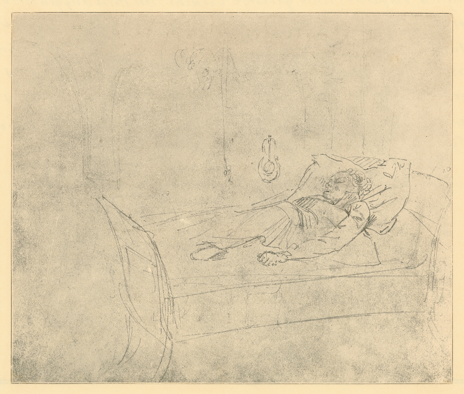 Dies ist die zweite von drei Bleistiftzeichnungen in einem Skizzenbuch des österreichischen Malers Josef Teltscher, die dieser im März 1827 im Krankenzimmer Ludwig van Beethovens anfertigte. Dabei hat sich der Künstler nicht nur auf die Person Beethovens konzentriert, sondern gesamte die Situation im Wohn- und Schlafzimmer des Komponisten festgehalten. Beethovens Freund Gerhard von Breuning erinnerte sich 1874 daran: "Der kranke Beethoven lag, wie in seinen gesunden Tagen, in dem zweifensterigen Zimmer (in jenem, bevor man in sein Arbeitszimmer gelangte). Das Bett stand an der der Eingangsthüre gegenüber befindlichen, das große Zimmer von dem Compositionscabinete trennenden Wand, mit dem Kopfende an die hintere Mauer angerückt, so daß Beethoven mit dem Gesichte nach den zwei Fenstern, mit der linken Seite aber der Mitte des Zimmers zugewandt, die ganze Stube übersah." (S.B.)