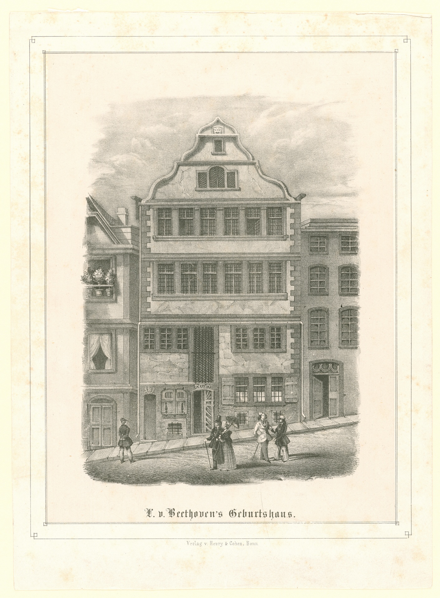 Bonn, Rheingasse, Wohnung der Familie Beethoven - Lithographie von Franz Michelis, wohl nach einer eigenen Zeichnung, erschienen bei Henry und Cohen, Bonn, Mitte 19. Jahrhundert
