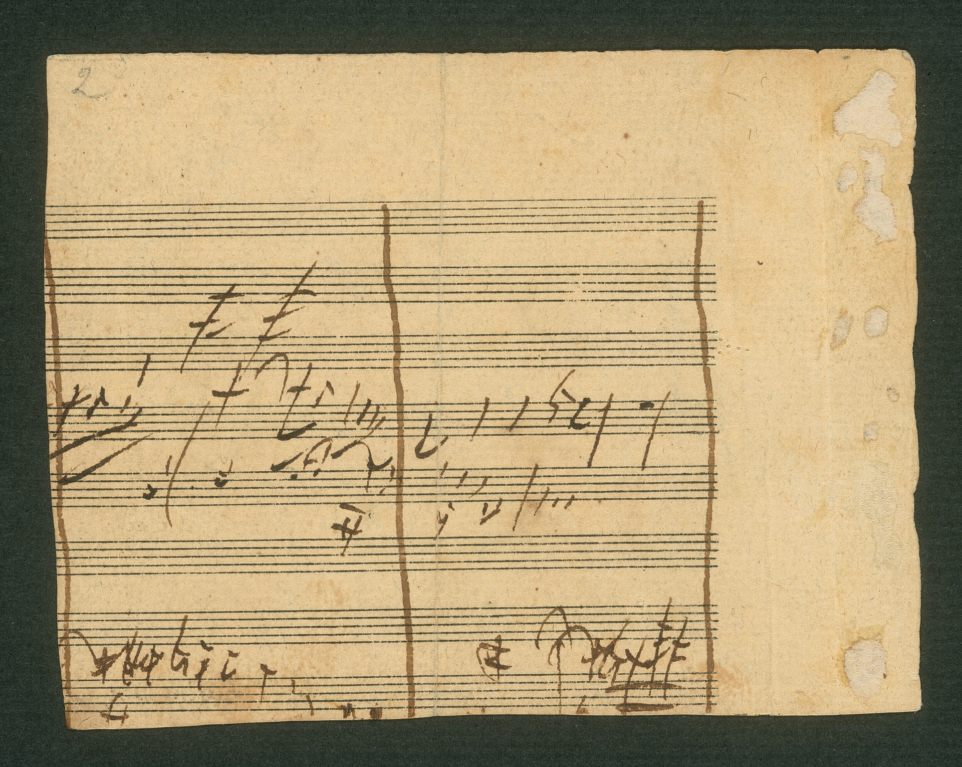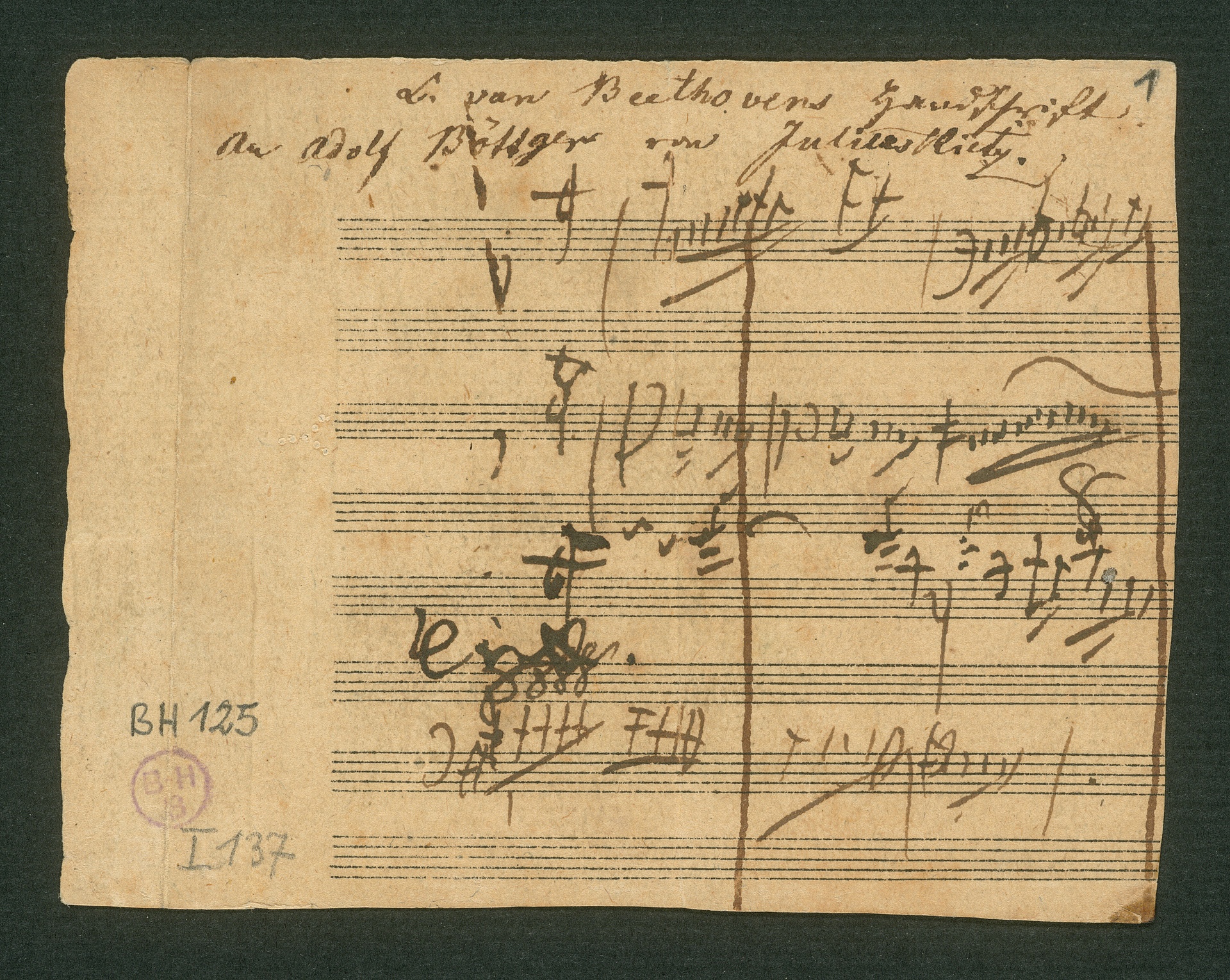 Abgebildet ist ein Skizzenblatt zur Klaviersonate op. 106. Beethoven komponierte die "Grosse Sonate für das Hammer-Klavier" 1817 und 1818. Das Autograph muss vor Januar 1819 abgeschlossen gewesen sein, denn zu diesem Zeitpunkt diskutierte Beethoven schon mit Ferdinand Ries in London eine Stichvorlage für den Druck. Die ersten Skizzen zur Hammerklaviersonate stammen von November/Dezember 1817. Die meisten der erhaltenen Entwürfe spiegeln Beethovens Arbeit am 4. Satz wider (nur acht von 44 Blättern skizzieren die ersten drei Sätze). Die Skizzen zu op. 106 befinden sich in der Mehrzahl auf losen Einzelblättern, wenig in Skizzenbüchern (ein Skizzenbuch zu op. 106, das sogenannte Boldrini-Skizzenbuch, wurde im 19. Jahrhundert beschrieben, ist jedoch verschollen). Diese Blätter sind sehr heterogen und von der Papierbeschaffenheit her keinem Konvolut zuzuordnen. Das vorliegende Blatt ist ein Fragment, das Viertel eines größeren Einzelblattes, mit Skizzen zum 4. Satz. (J.R.)