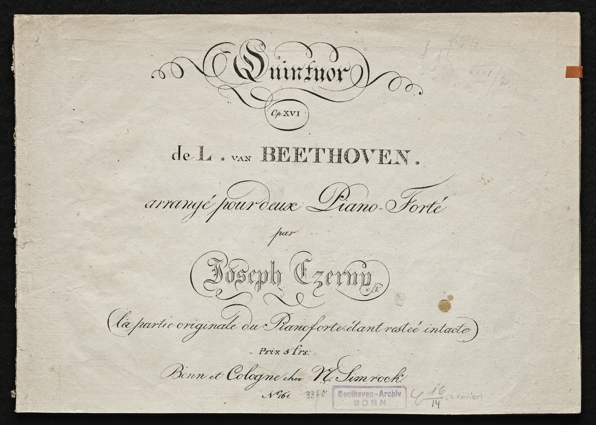 Ludwig van Beethoven, Quintett für Klavier, Oboe, Klarinette, Fagott und Horn (Es-Dur) op. 16, Bearbeitung für Klavier von Joseph Czerný, Simrock, 161