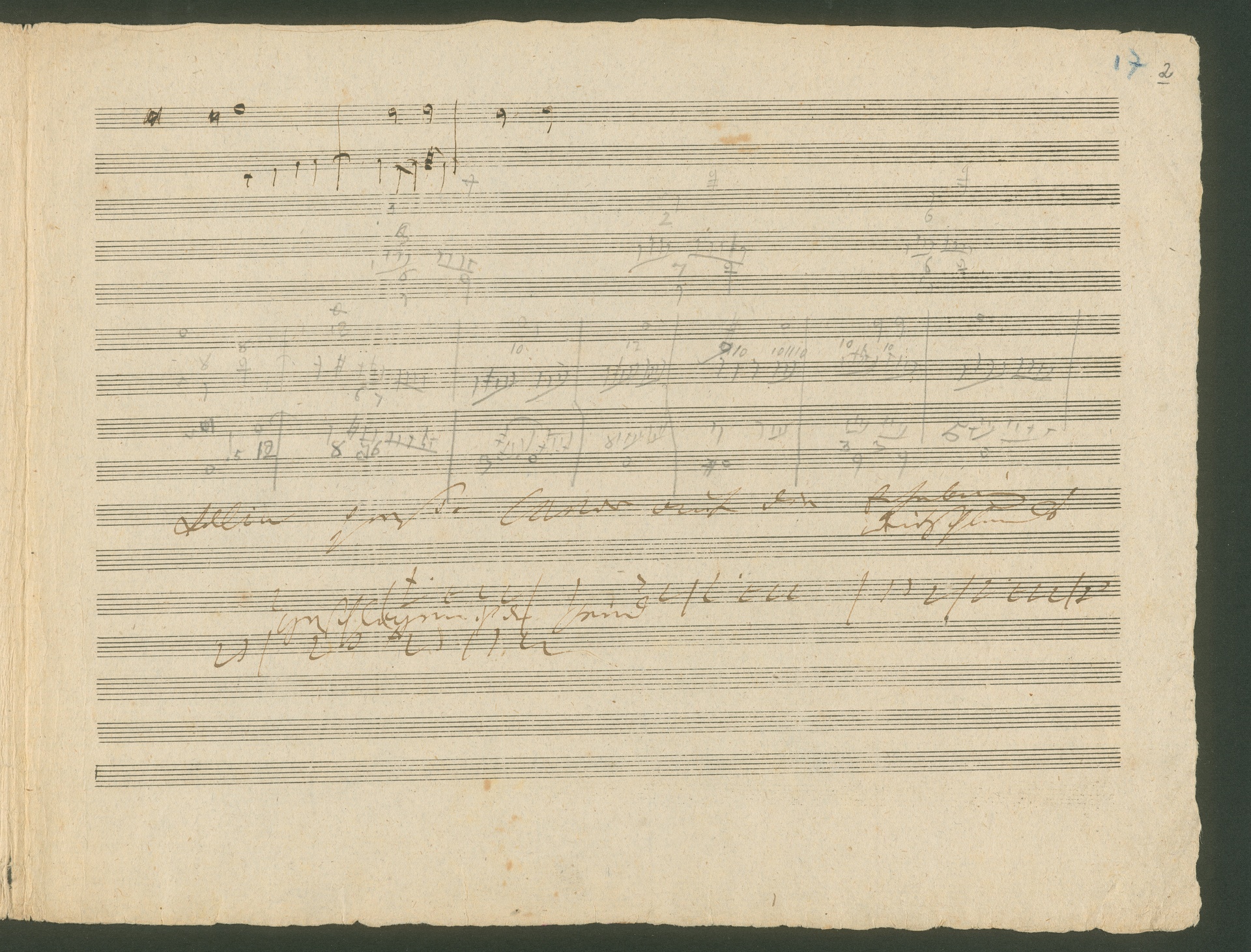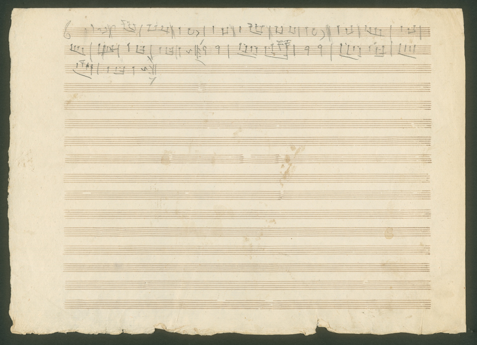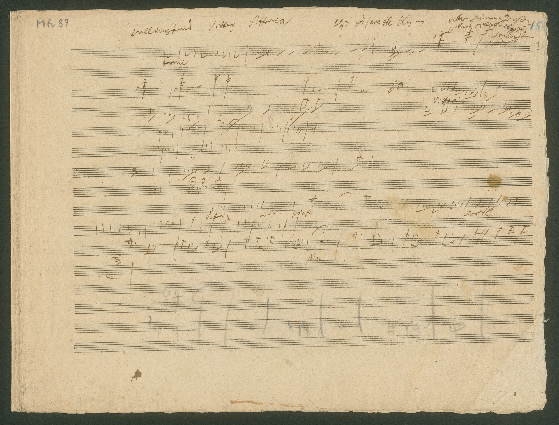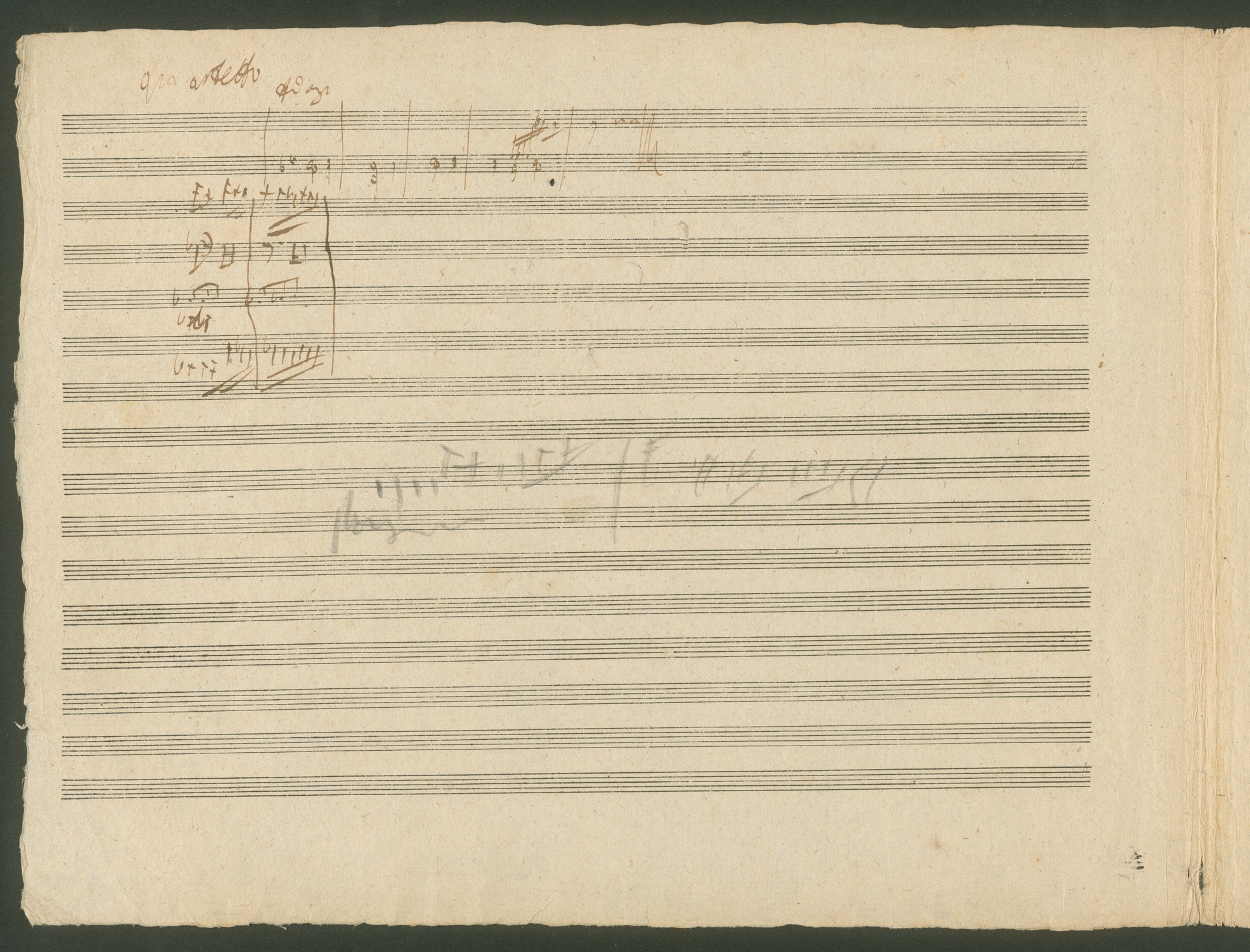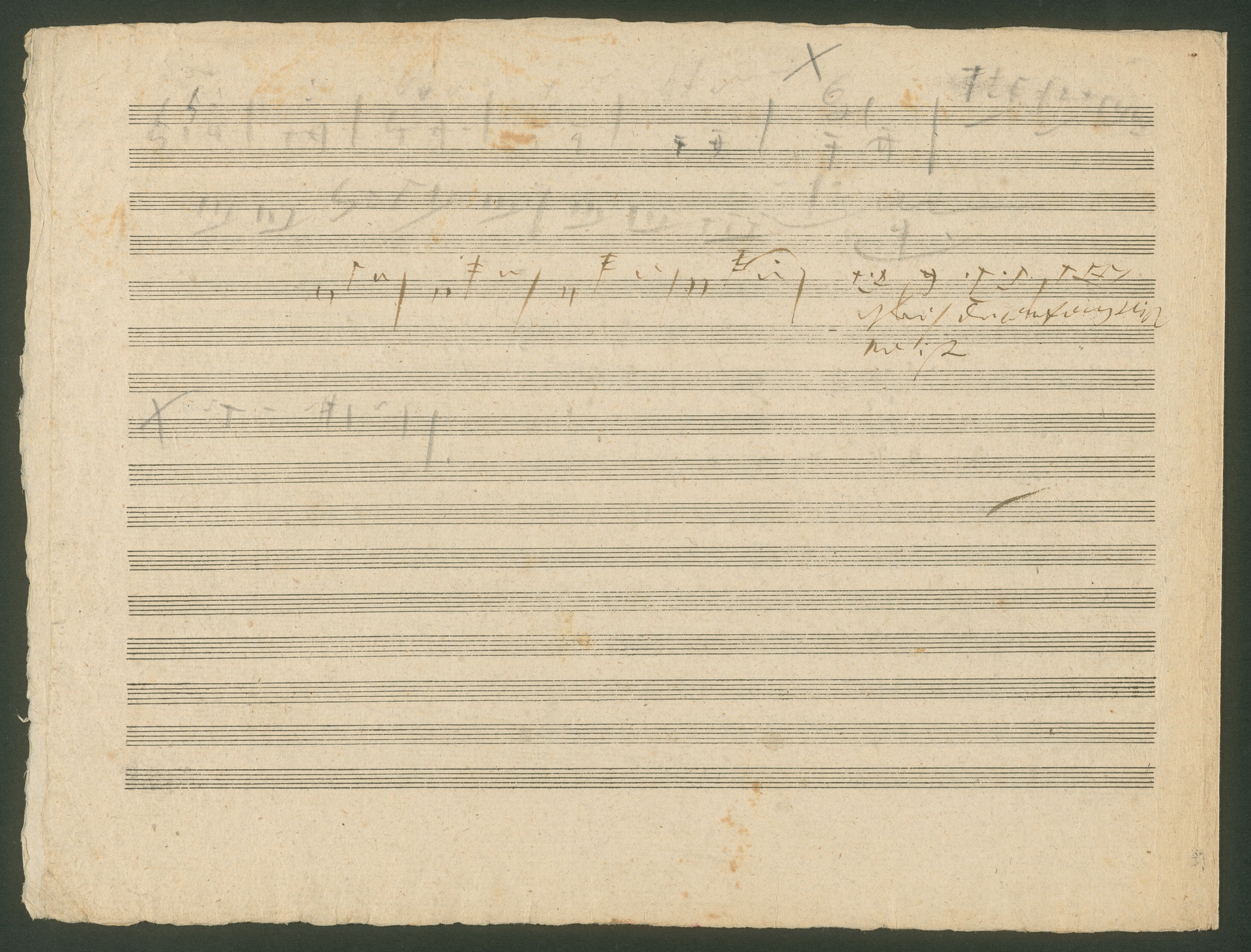 Schon seit dem 15. Jahrhundert gibt es die Tradition musikalischer Schlachtengemälde. Dabei wurden sowohl tatsächliches militärisches Geschehen dargestellt, als auch allegorische Konfrontationen wie z.B. der Liebeskrieg in Musik gesetzt. Die musikalische Darstellung von Schlachtgetümmel und Trompetensignale spielen dabei eine große Rolle. Ausgelöst durch die Napoleonischen Kriege in Europa hatte das Genre der Schlachtenmusiken (später auch der Siegessinfonie) zu Anfang des 19. Jahrhunderts große Konjunktur. Einer der entscheidenden Siege gegen Napoleon errang der englische Feldmarschall Arthur Wellesley, First Duke of Wellington am 21. Juni 1813 in der Schlacht bei Vittoria in Nordspanien. Die Nachricht dieses Sieges erreichte Wien am 27. Juli 1813 und begeisterte die Stadt. Die Initiative zu Beethovens Schlachtenmusik über Wellingtons Sieg ging allerdings nicht vom Komponisten selbst aus. Der Erfinder und Mechaniker Johann Nepomuk Mälzel (der gleiche, der auch das Metronom erfand) hatte die Idee und bat Beethoven, für sein "Panharmonikon", einen von ihm erfundenen Musikautomaten, eine Sieges-Sinfonie zu schreiben. Erst nach dem großen Erfolg des Werks richtete Beethoven das Stück auch für großes Orchester ein und komponierte noch einen zweiten Teil, eine Schlachten-Sinfonie, dazu. Die befeindeten Truppen der Franzosen und Engländer charakterisierte Beethoven mithilfe unverkennbarer Nationalmärsche: Rule Britannia für die Engländer und Marlborough-Marsch für die Franzosen. Dem hier abgebildeten Doppelblatt mit Skizzen zu "Wellingtons Sieg" op. 91 ist ein Einlegeblatt beigefügt, auf dem militärische Trompetensignale aufgezeichnet sind. Die Handschrift ist uns unbekannt, es spricht allerdings einiges dafür, daß Mälzel auf diesem Blatt für Beethoven einschlägige Trompetensignale aufzeichnete. (J.R.)