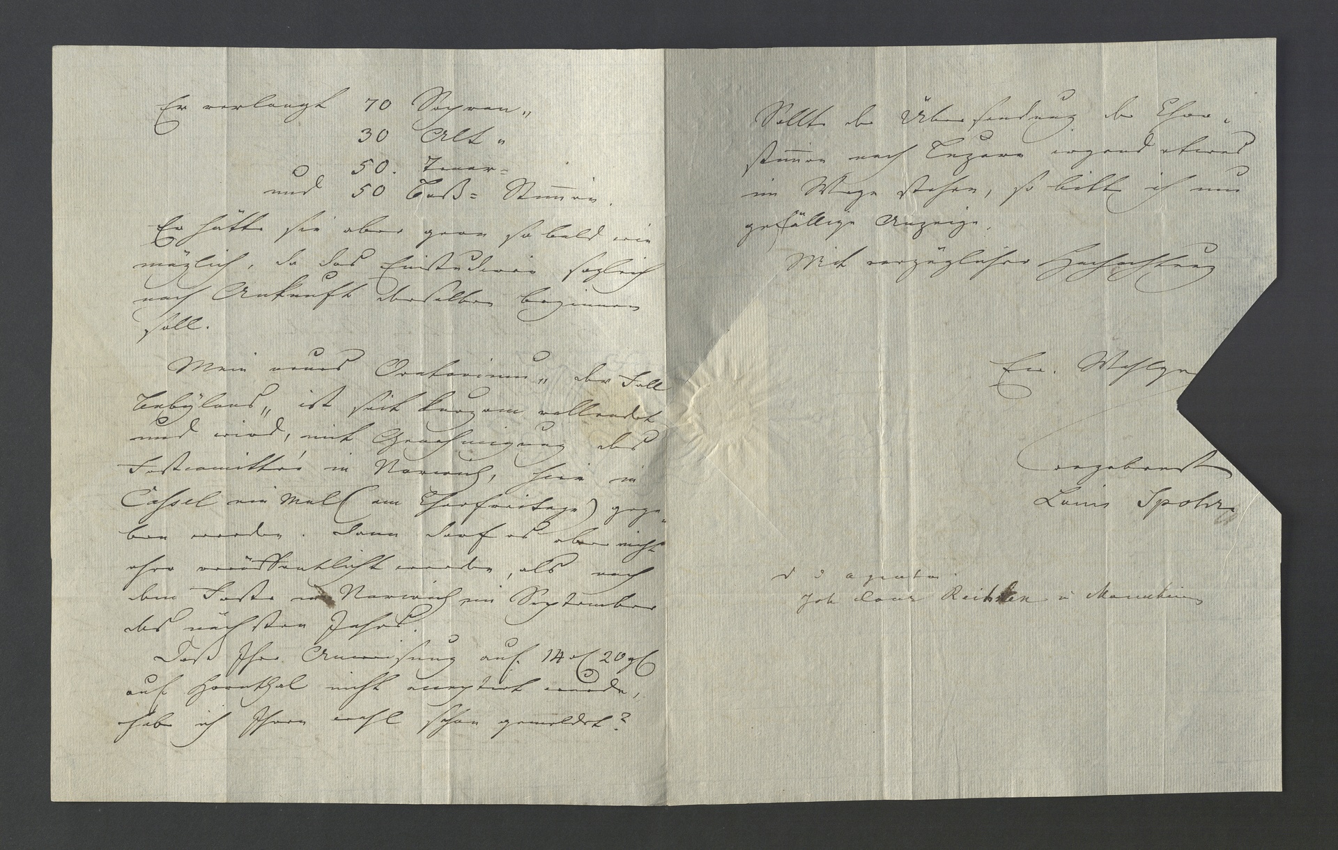 Text: "Wohlgeborner Herr, Wenn ich mich nicht irre, haben Sie die Chorstimmen meines Oratoriums "des Heilands letzte Stunden" gestochen. Dieses Oratorium ist nun von der Schweitzer. Musikgesellschaft zur Aufführung bey ihrem diesjährigen Musikfest in Luzern gewählt worden und der Kapellmeister Carl Meyer in Luzern hat bey mir Partitur, Orchesterstimmen, und die gestochenen Chorstimmen bestellt, wahrscheinlich in der Meinung, letztere seyen, wie der Clavierauszug, im Selbstverlag erschienen. - Partitur und Orchesterstimmen werde ich ihm hier schreiben lassen. Die Chorstimmen haben Sie aber die Güte ihm direkt mit Buchhändler Gelegenheit zu zu senden. Er verlangt 70 Sopran- 30 Alt- 50 Tenor- und 50 Baß-Stimmen. Er hätte sie gern so bald wie möglich, da das Einstudiren sogleich nach Ankunft derselben beginnen soll. Mein neues Oratorium "der Fall Babylons" ist seit kurzem vollendet und wird, mit Genehmigung des Festcommités in Norwich, hier in Cassel ein Mal (am Charfreitage) gegeben werden. Dann darf es aber nicht eher veröffentlicht werden, als nach dem Feste in Norwich im September des nächsten Jahres. Daß Ihre Anweisung auf 14 Rth. 20 Sgr. auf Hornthal nicht acceptirt wurde, habe ich Ihnen wohl schon gemeldet? Sollte der Übersendung der Chorstimmen nach Luzern irgend etwas im Wege stehen, so bitte ich um gefällige Anzeige. Mit vorzüglicher Hochachtung Ew. Wohlgeb. ergebenster". Karl Traugott Goldbach, Spohr-Briefe: <http://bit.ly/1m0q9h2>
