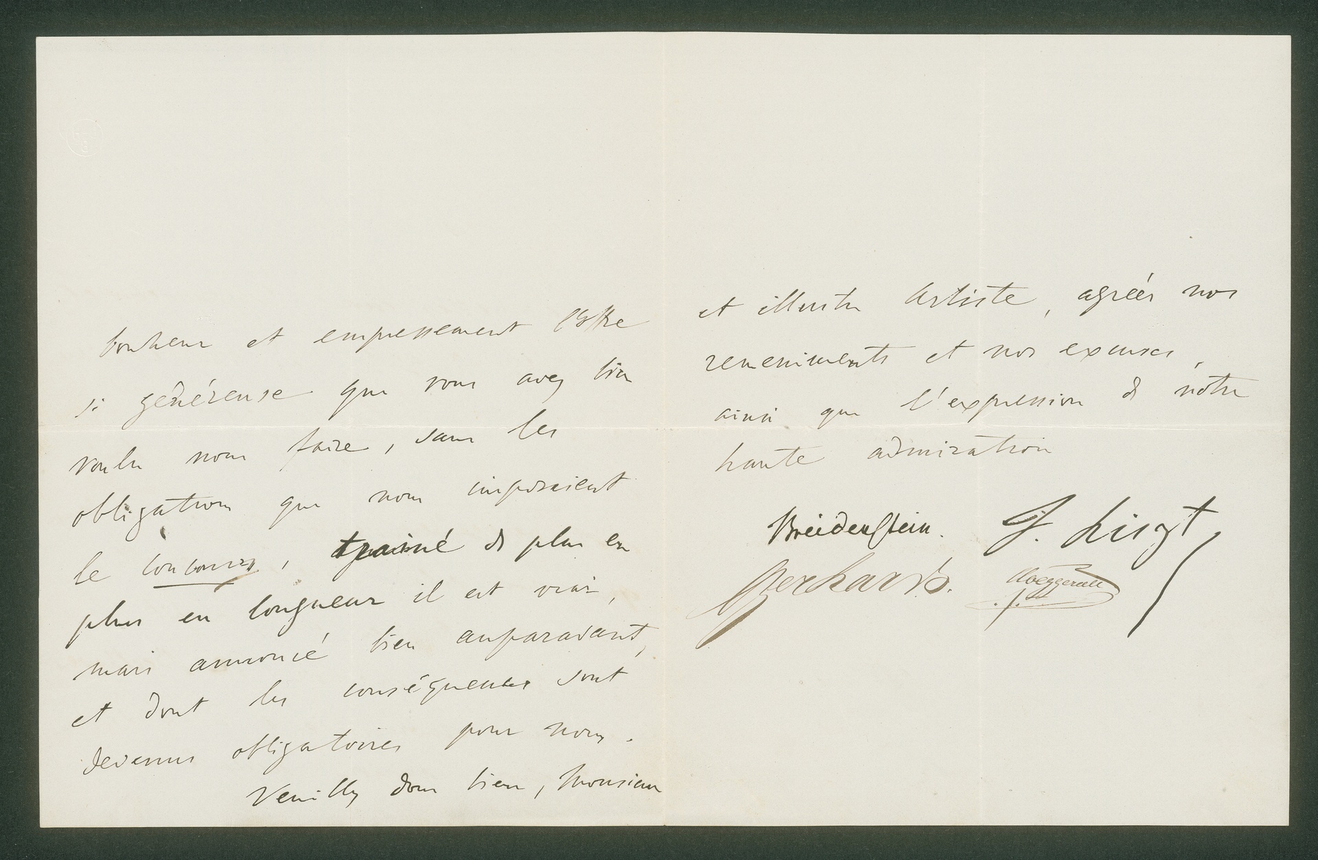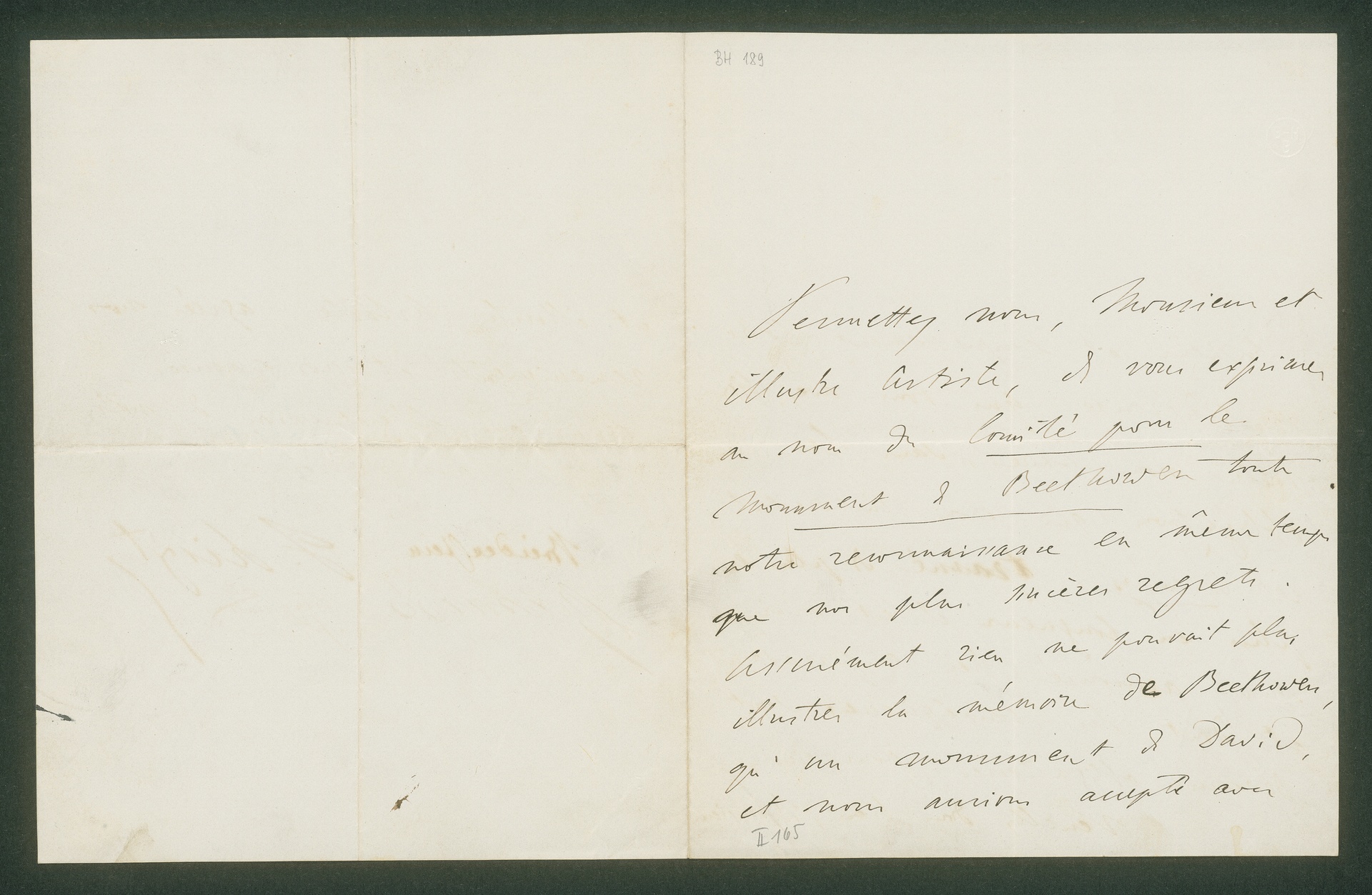 Liszt sagt dem Bildhauer Pierre Jean David (1788-1856) im Namen des Vereins für Beethovens Denkmal höflich aber bestimmt ab. David hatte offensichtlich angeboten, einen Entwurf einzureichen. Liszt erklärt ihm jedoch, die Ausschreibung sei bereits abgeschlossen.