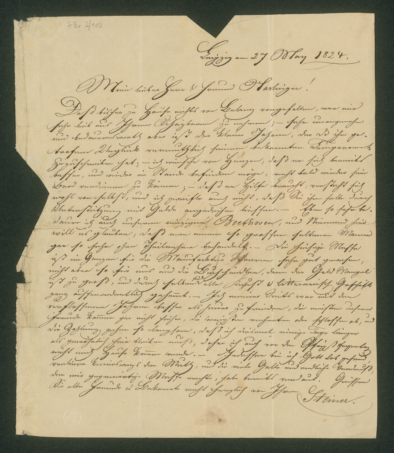 Steiner befindet sich auf der Frühjahrsmesse in Leipzig und berichtet nach Hause über Messegeschäfte. Er zeigt Anteilnahme für die Angelegenheiten, von denen Haslinger ihm berichtet hatte. "Eben so sehr bedaure ich auch unseren einzigen Beethoven, und Niemand hier will es glauben, daß man einen so grossen seltenen Mann gar so sehr ohne Theilnahme behandelt." Möglicherweise spielt Steiner mit dieser Bemerkung auf Beethovens immense Schwierigkeiten in Zusammenhang mit seiner großen Akademie vom 7. Mai 1824 an, die bis Leipzig diskutiert worden waren.