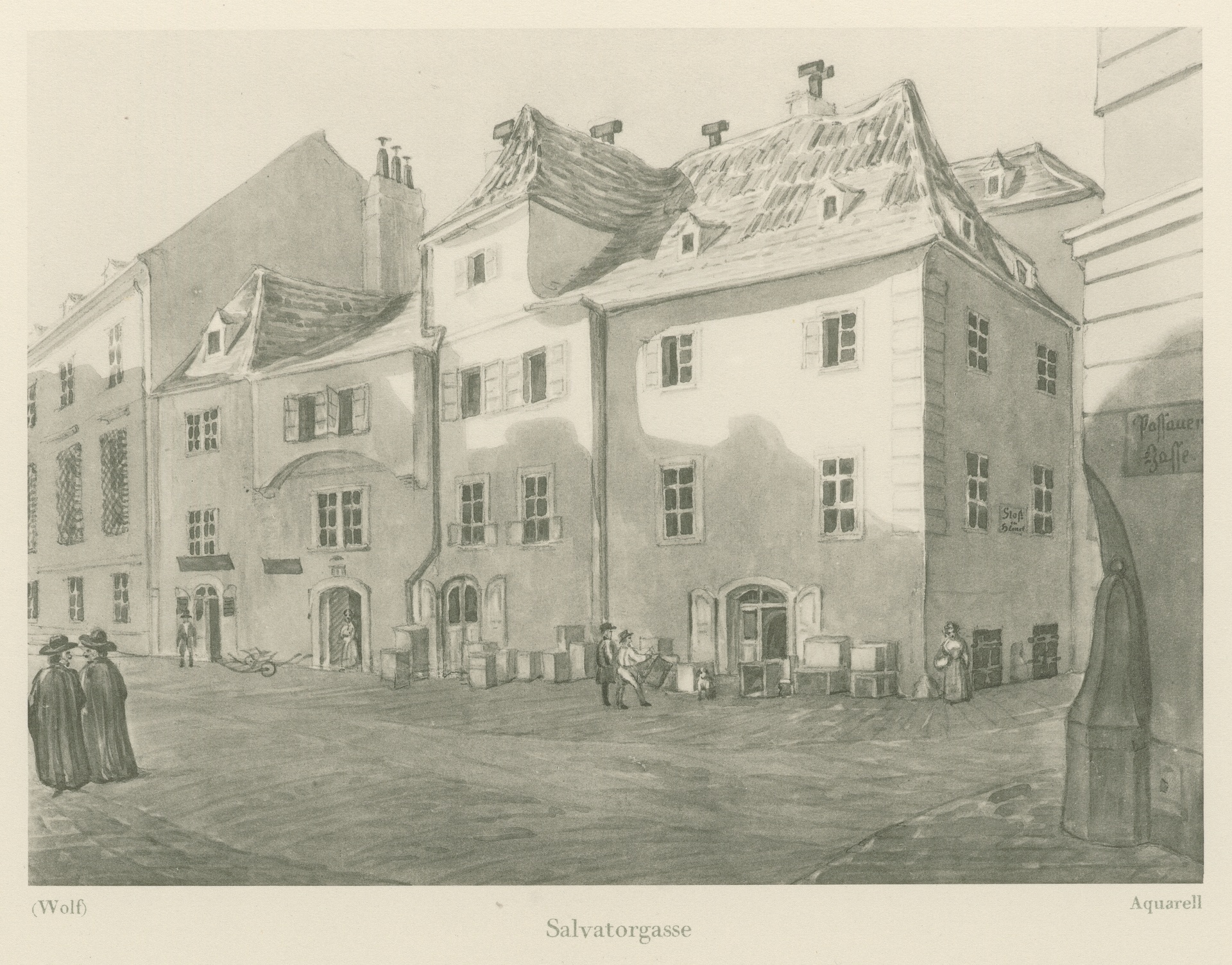Die Salvatorgasse in Wien, um 1840 - Reproduktion eines wohl von Franz Wolf stammenden Aquarells, Wien, 1929