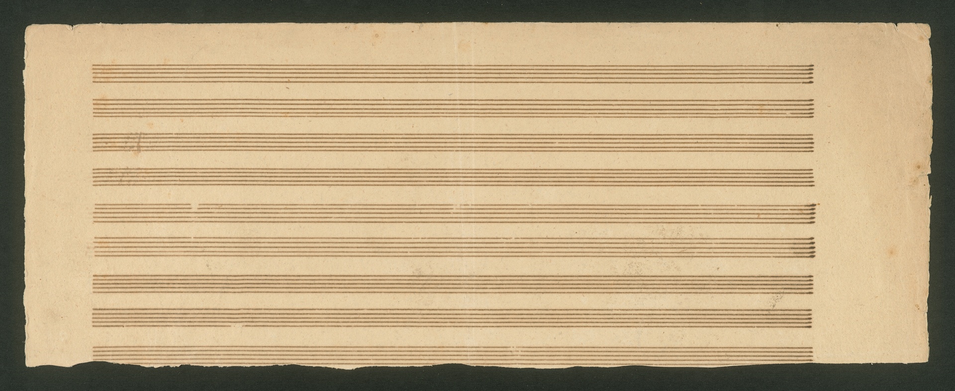 Auf diesem Blattfragment sehen wir eine Partiturskizze Beethovens aus dem Jahr 1817 mit dem Thema einer Fuge für Streichquintett in d-Moll. Das Streichquintett selbst wurde jedoch nie vollendet und ist seinerseits nur in einem Fragment überliefert. Beethoven hatte sich hier die Themeneinsätze der beiden Violinen sowie der 2. Bratsche skizziert. Die Rückseite des Blattes blieb leer. (J.R.)