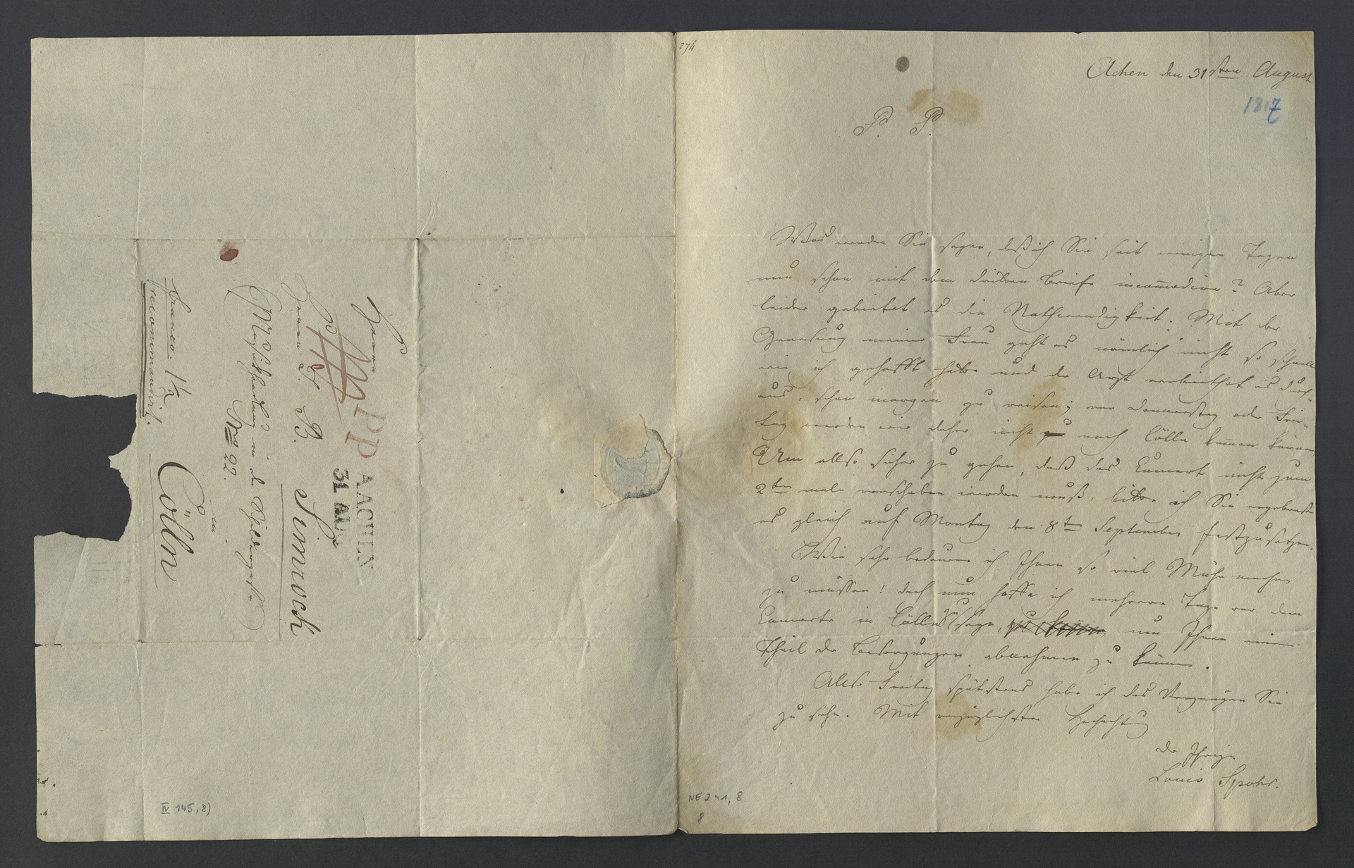 Louis Spohr, Brief an Peter Joseph Simrock in Köln, Aachen, 31. August 1817, Autograph