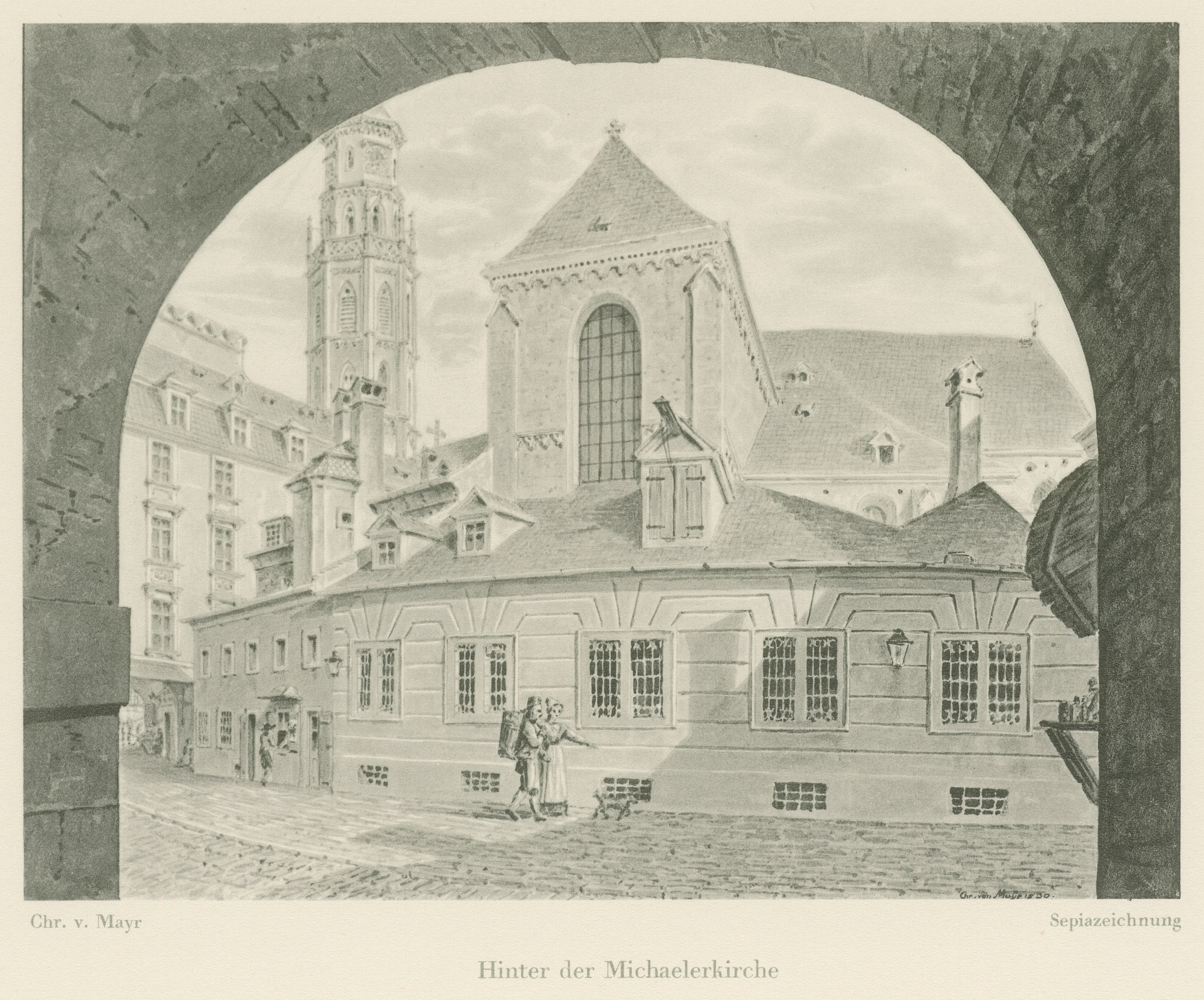 Die Michaelerkirche in Wien, 1830 - Reproduktion einer Sepiazeichnung von Christian von Mayr, Wien, 1929