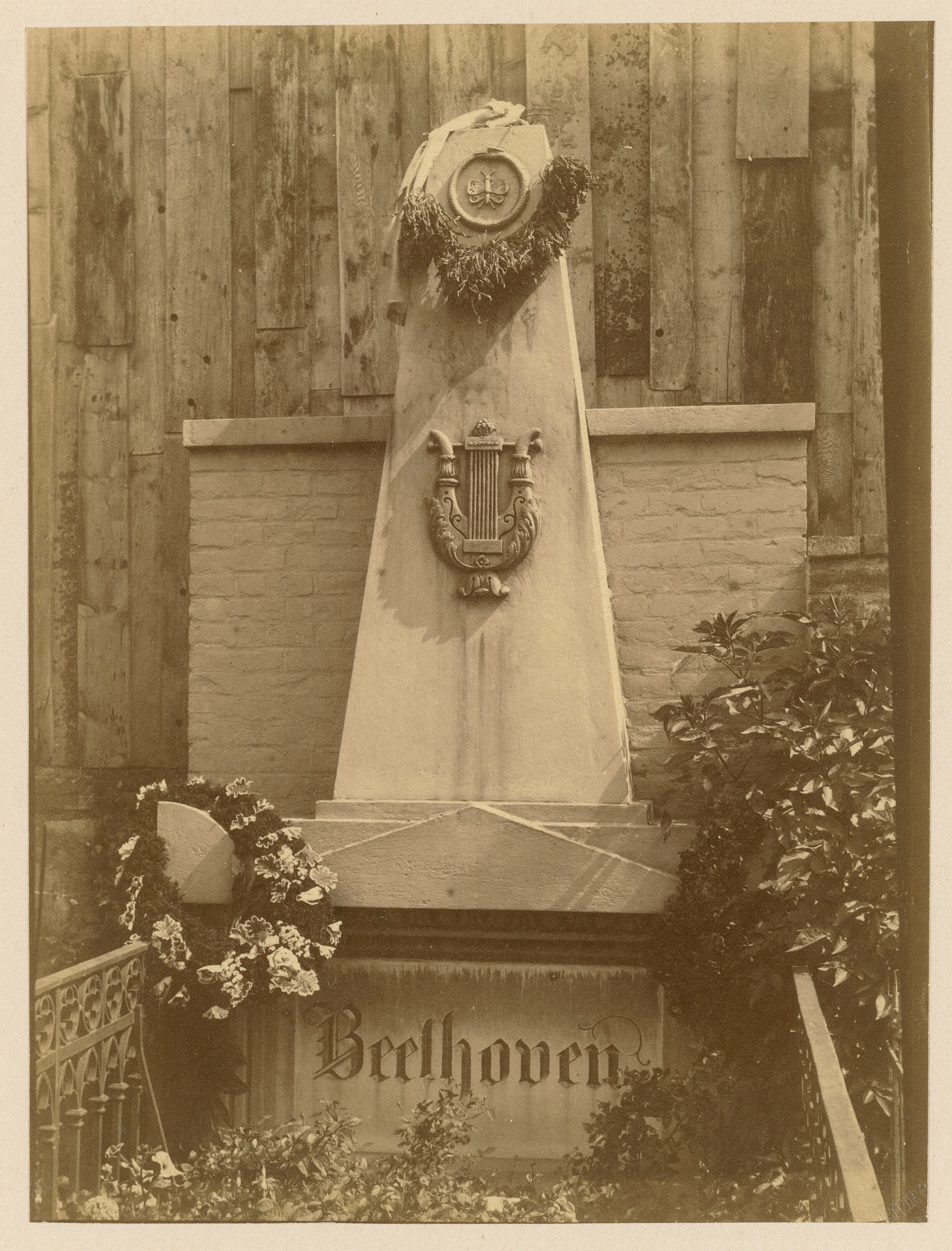 Beethovens Grabstein auf dem Währinger Ortsfriedhof, um 1900 - Fotografie des Ateliers Reiffenstein mit der Abbildung des von Ferdinand Schubert entworfenen Grabmales
