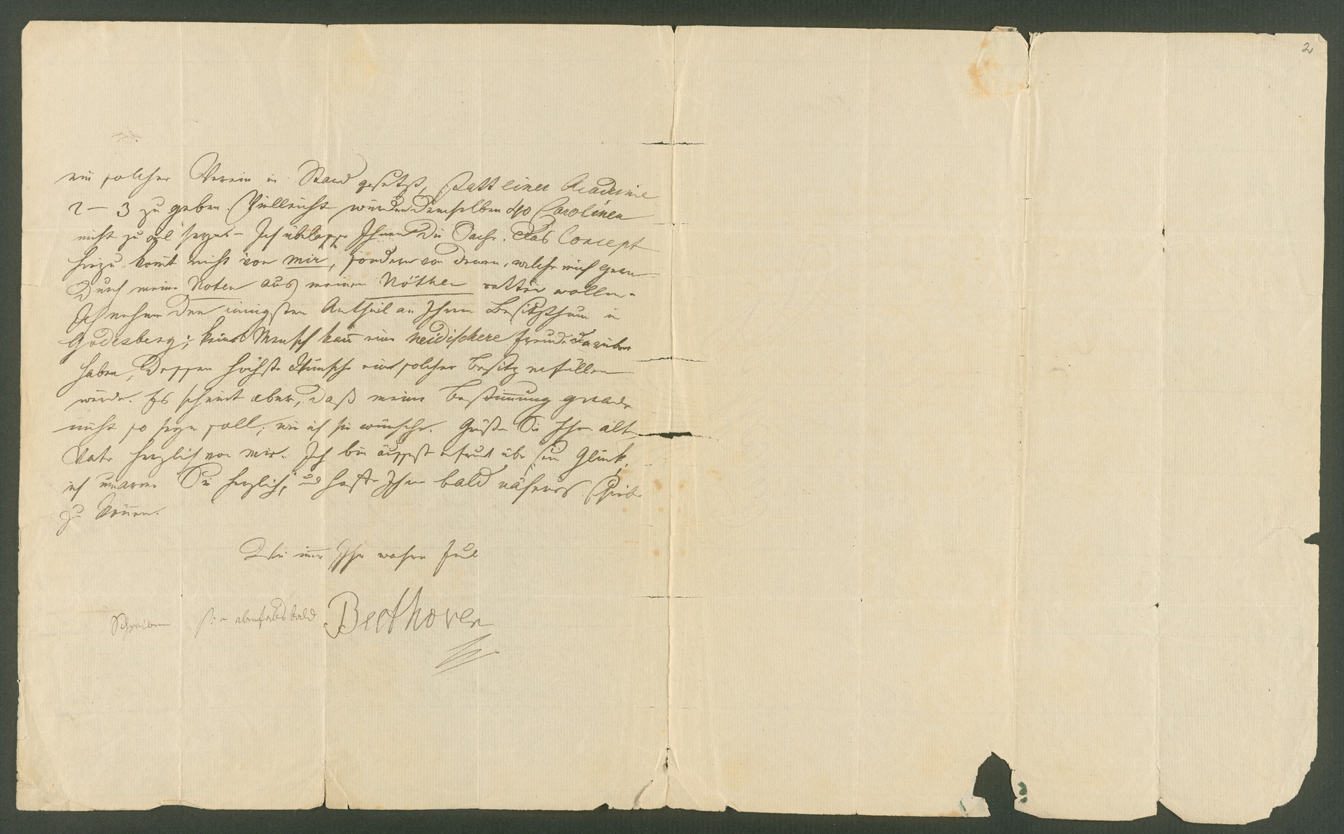 Er verspricht, die gewünschten Metronomangaben zu op. 85 zu liefern (dieses Versprechen hat er nicht gehalten). Beethoven schlägt Ries mehrere Werke zur Aufführung beim Niederrheinischen Musikfest in Aachen vor, worum ihn dieser offenbar gebeten hatte (Ries war Mitglied im Organisationskomitee des renommierten Festes). Beethoven bietet opp. 123, 124 und 125 sowie kleinere Orchester- und Chorwerke an, und fordert dafür 40 Carolinen. Er betont, dieses Angebot stamme nicht von ihm selbst, sondern "von denen, welche mich gern durch meine Noten aus meinen Nöthen retten wollen" (vermutlich seinen Neffen Karl und seinen Bruder Johann).