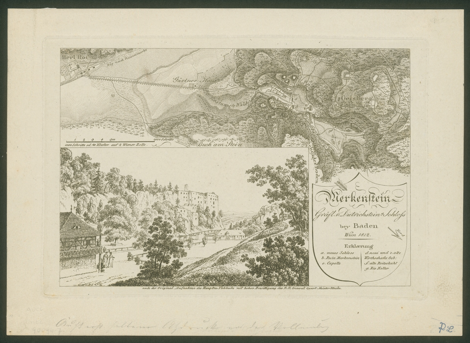 Ruine Merkenstein bei Bad Vöslau, Ansicht der Ruine und Karte des Grundbesitzes Merkenstein - Radierung nach einer Zeichnung von Karl Ludwig Friedrich Viehbeck, Wien, 1812