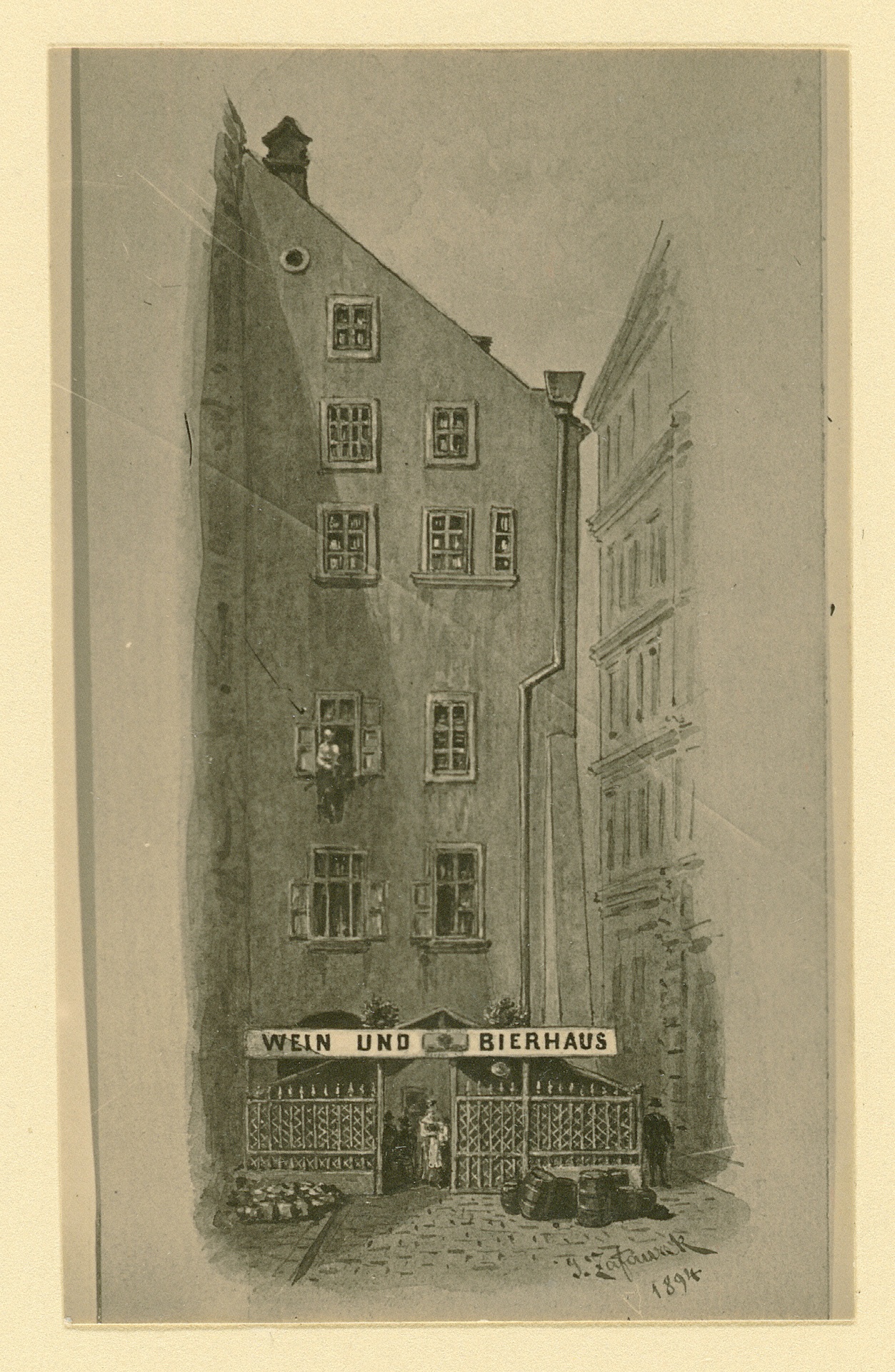 Das Gasthaus "Zur Eiche" in Wien, 1894 - Fotografie einer Tuschfederzeichnung oder eines Aquarells von Gustav Zafaurek