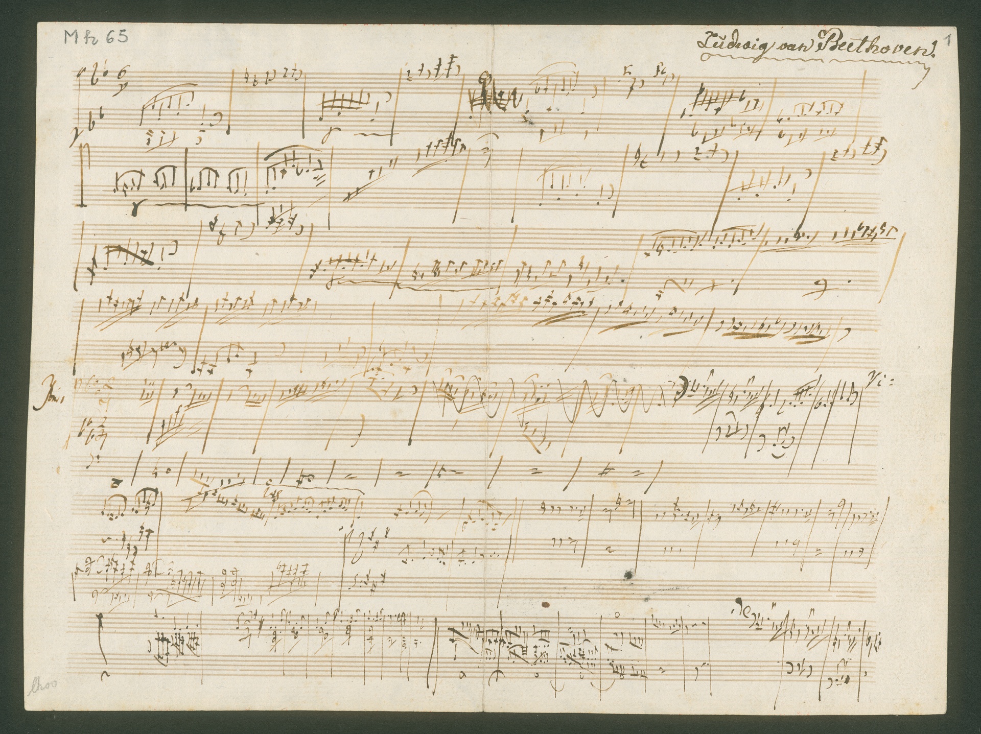 Beethoven komponierte seine sechs Streichquartette op. 18 zwischen 1798 und 1800 im Auftrag des Fürsten Franz Joseph Maximilian von Lobkowitz. Zu op. 18 ist eine Vielzahl von Skizzen überliefert, anhand derer wir die Genese der Quartette recht gut nachvollziehen können. Beethoven arbeitete an den Werken im Wesentlichen in drei Skizzenbüchern. Das erste davon liegt heute in der Staatsbibliothek zu Berlin Preußischer Kulturbesitz und trägt (nach dem Vorbesitzer) die Signatur Mus. ms. autogr. Beethoven Grasnick 1. "Grasnick 1" hatte ursprünglich 48 Blätter - eine Standardgröße zur Beethoven-Zeit. Die ersten neun Blätter wurden jedoch herausgetrennt, vermutlich schon bevor der Autographensammler Friedrich August Grasnick es Mitte des 19. Jahrhunderts erwarb. Die Spur der meisten dieser entfernten Blätter konnte jedoch nachvollzogen werden, ihre Mehrzahl ist mittlerweile identifiziert. Zwei davon sind die hier abgebildeten beiden Skizzenblätter mit Notaten zum dritten Quartett aus op. 18. Die beiden Blätter gehören nicht nur an den Anfang des Skizzenbuches "Grasnick 1", sie lagen dort auch direkt nacheinander. Dies beweisen uns zwei relativ kleine Tintenflecke, die beim Schreiben mit einer Feder oft vorkommen. Da die Tinte nicht so schnell trocknet, bilden sich Tropfen von einer Seite auf der gegenüberliegenden Seite ab. Auf der Rückseite von HCB Mh 64 (dort Bild 2), oberhalb des dritten Systems von unten, ungefähr nach dem ersten Längendrittel der Zeile, ist mitten im Notentext ein kleiner, verwischter Tropfen erkennbar. Der Abdruck dieses Tropfens findet sich auf dem anderen Skizzenblatt, HCB Mh 65 (Bild 1), hier auf der Vorderseite. Er ist hier viel deutlicher zu erkennen, denn an dieser Stelle ist das Notensystem leer. Dieser einfache kleine, kaum auffallende Abdruck belegt, dass beide Blätter nacheinander in dem gleichen Buch gebunden waren. Aus der Forschung wissen wir, dass Beethoven seine Arbeit zu den Streichquartetten op. 18 im Skizzenbuch "Grasnick 1" 1798 begann. Die Tatsache, dass auf den ersten Blättern des Buches, zu denen auch die hier vorliegenden gehören, Skizzen zum dritten Quartett notiert sind, offenbart eine weitere Tatsache der Entstehungsgeschichte: Die Reihenfolge der sechs Quartette op. 18, wie wir sie heute kennen, entspricht nicht der Reihenfolge ihrer Entstehung. Ganz offensichtlich begann Beethoven die Arbeit mit dem Quartett Nr. 3. (J.R.)