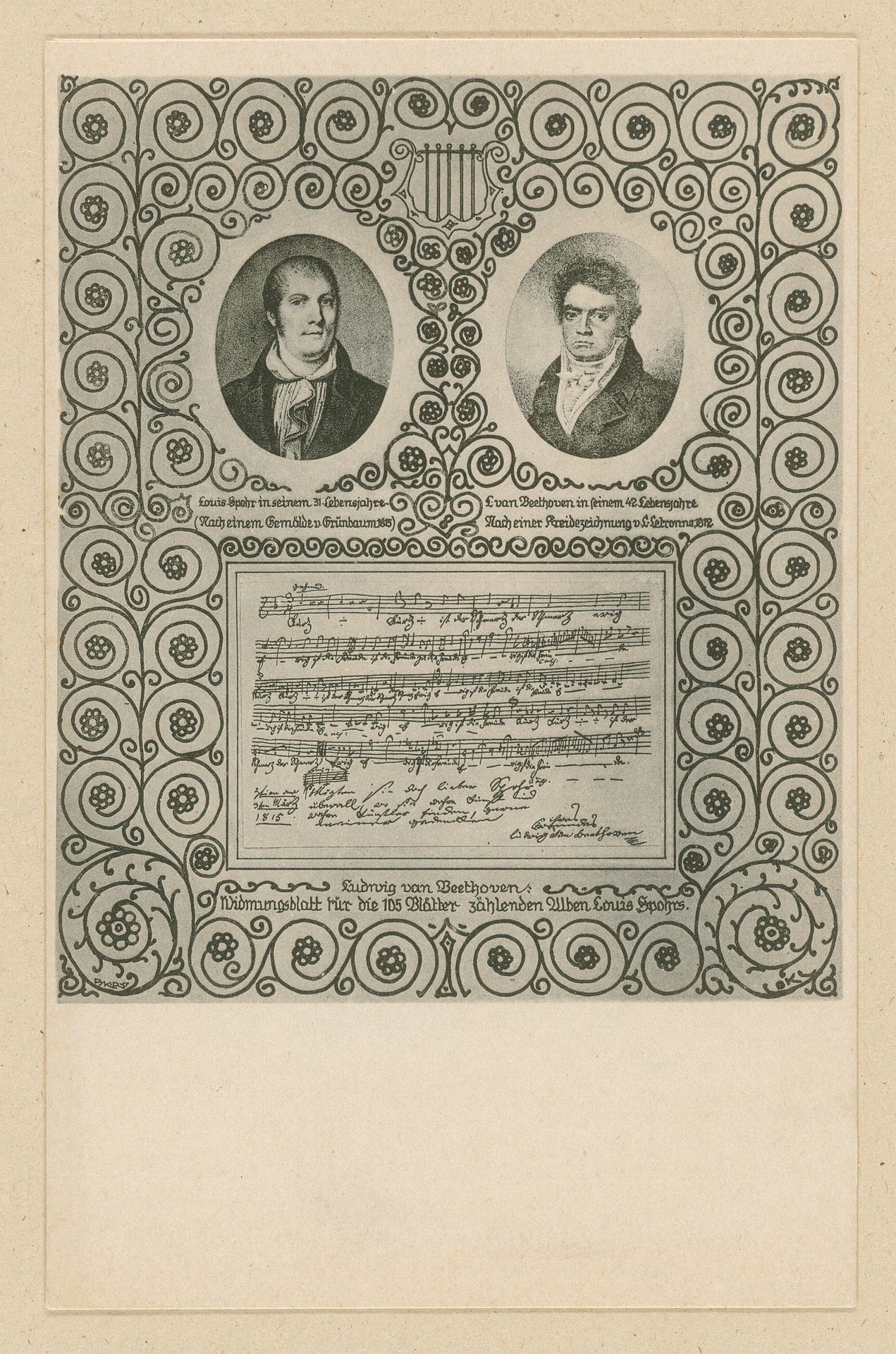Ludwig van Beethoven und Louis Spohr - Kunstpostkarte mit der Reproduktion des Widmungsblattes Beethovens für das Album Louis Spohrs, kombiniert mit den Portraits Beethovens von Blasius Höfel aus dem Jahr 1814 nach der Zeichnung von Louis Letronne und dem Porträt Spohrs nach dem Gemälde von Adam Grünbaum in dekorativer Rahmung, Kassel, um 1920