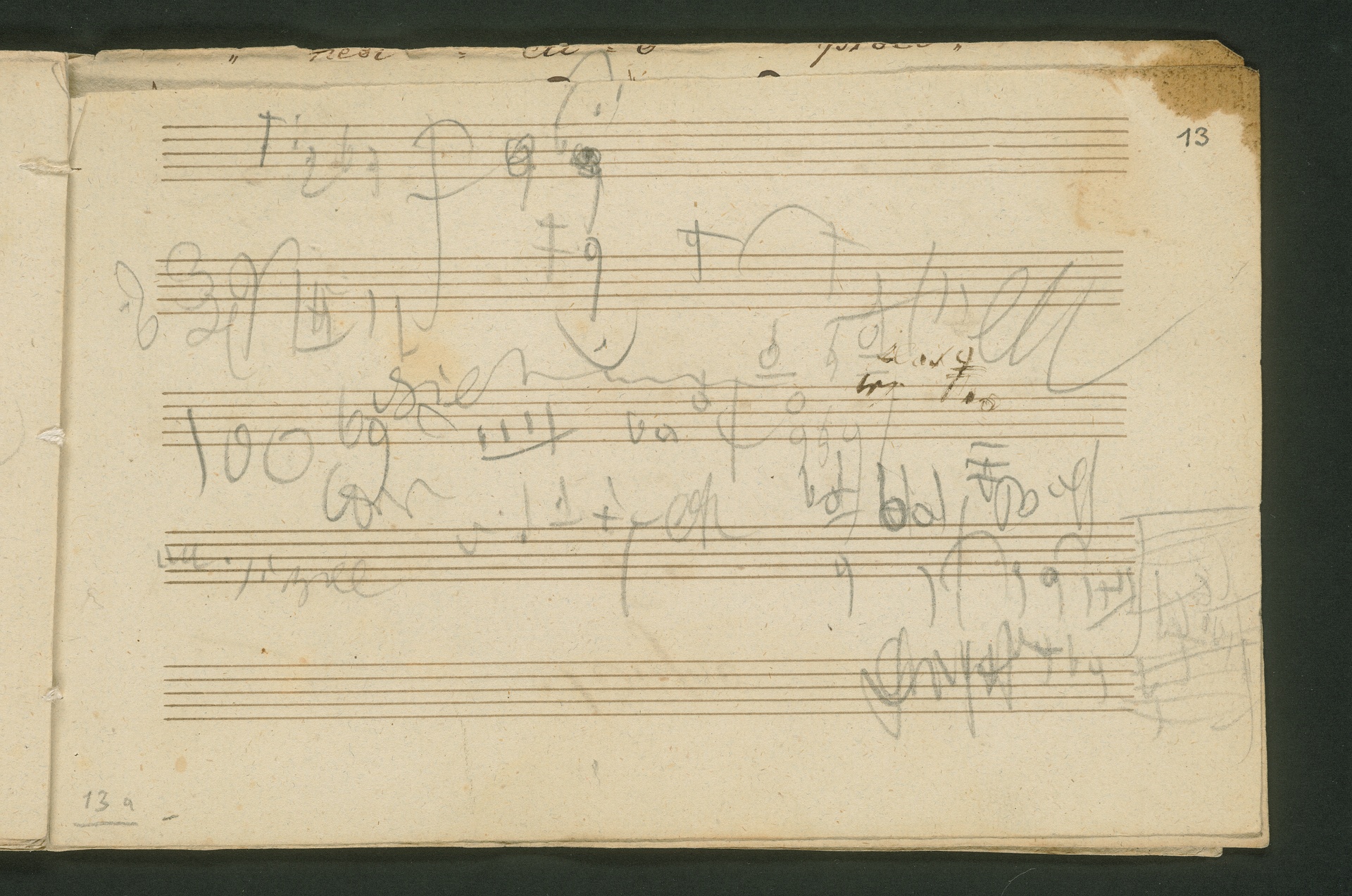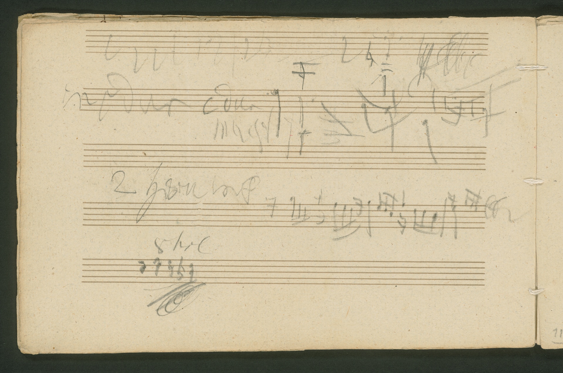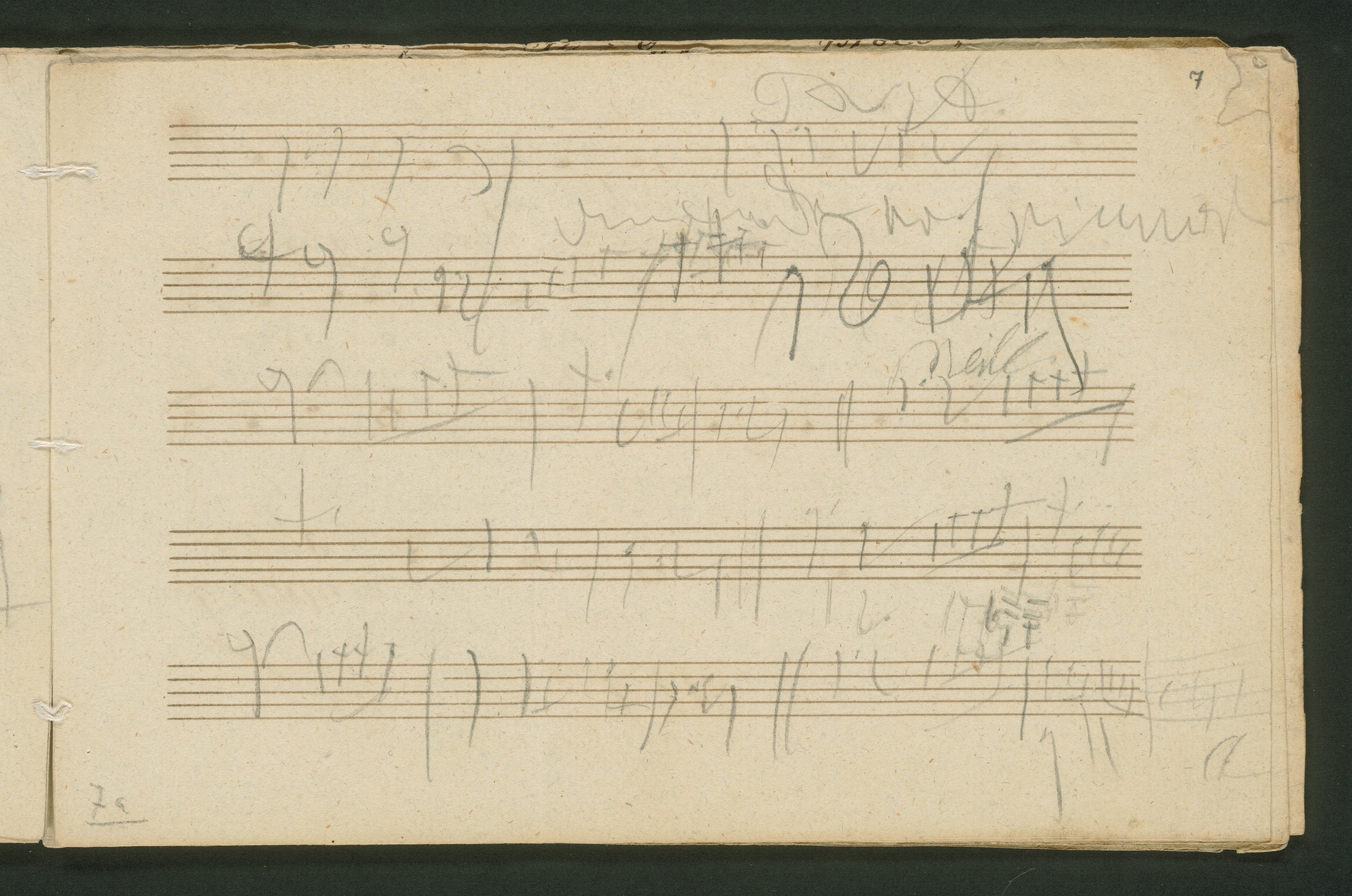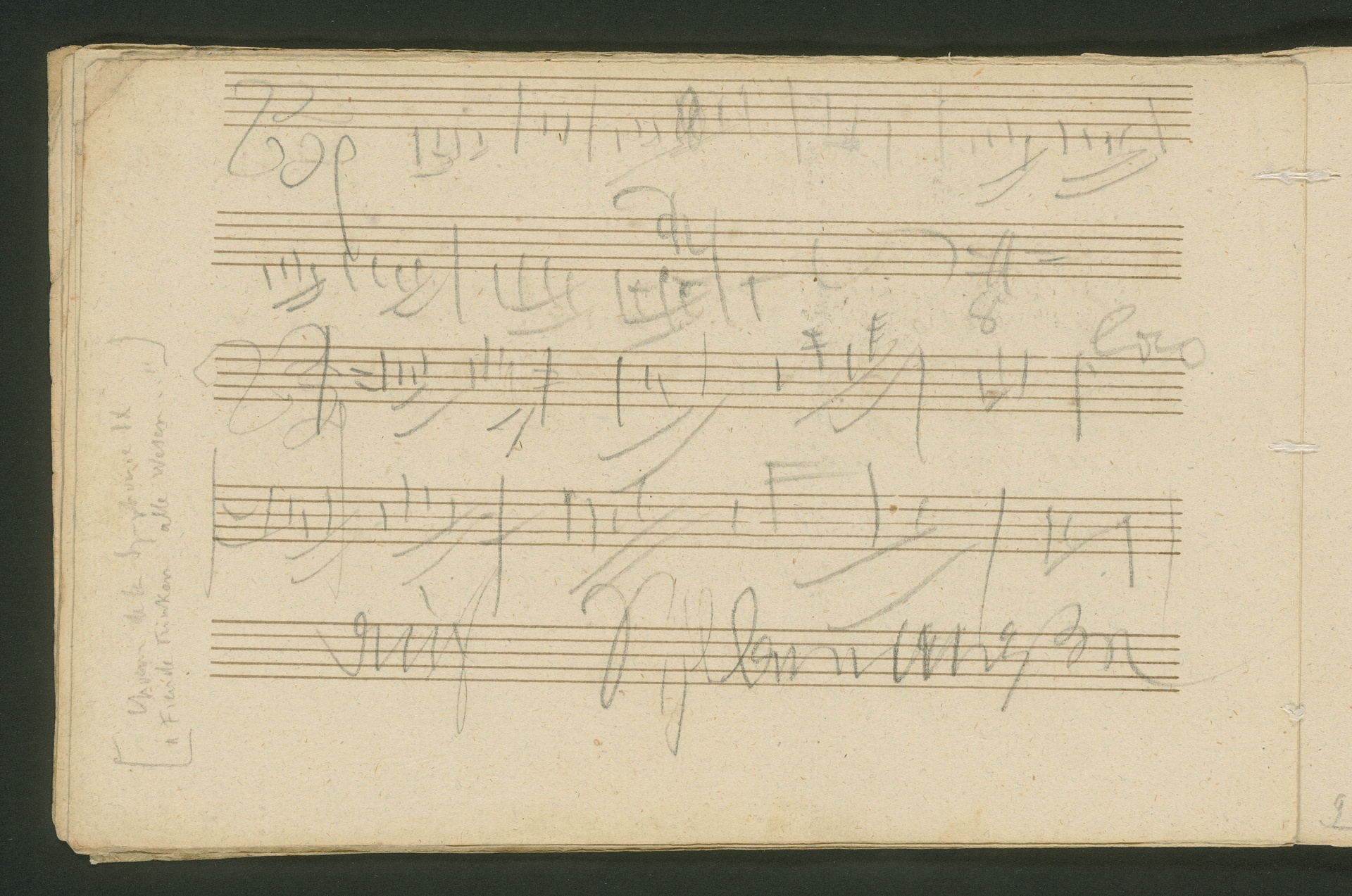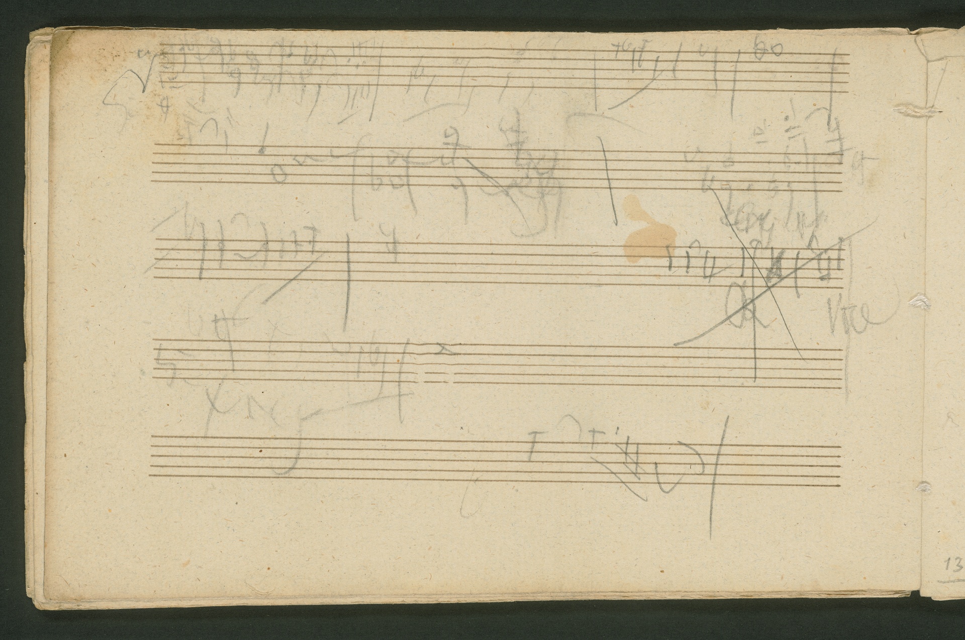 Dieses Taschenskizzenbuch, benannt nach seinem früheren Besitzer Romain Rolland, birgt ein Kuriosum. Normalerweise verwendete Beethoven zur Herstellung seiner kleinformatigen Taschenskizzenhefte neues, unbenutztes Notenpapier. Nicht so bei diesem, das übrigens noch die originale Heftung hat und offensichtlich so intakt ist, wie Beethoven es hinterließ. Beethoven benutzte für dieses Heft die Abschrift eines "Tantum ergo" von J. Stadelmayr für vier Gesangstimmen. Ob er gerade kein anderes Papier zur Hand hatte, aber dringend Notenpapier benötigte? Die Kopistenabschrift war auf hochformatigem Papier geschrieben, einige Rückseiten waren jedoch leer. Beethoven faltete die Blätter auf die Hälfte zusammen, schnitt sie auseinander und notierte seine Skizzen nicht nur auf den leer gebliebenen Seiten, sondern auch auf einzelne freie Systeme unterhalb der Abschrift. Beim Durchblättern des Heftes fallen daher drei unterschiedliche Typen von Seiten auf: Jene, auf denen sich Beethovens Bleistiftskizzen befinden. Jene, auf der wir die mit Tinte geschrieben Abschrift eines Berufskopisten zu Stadelmayers "Tantum ergo" erkennen können. Diese Seiten stehen wegen der Faltung der Blätter bei der Herstellung des Heftes auf dem Kopf. Und schließlich jene Seiten, die sowohl das eine als auch das andere bergen: im oberen Teil die Abschrift in Tinte, auf frei gebliebenen Systemen darunter Beethovens Skizzen in Bleistift. Alle Skizzen Beethovens beschäftigen sich mit dem 3. Satz der Neunten Sinfonie. (J.R.)