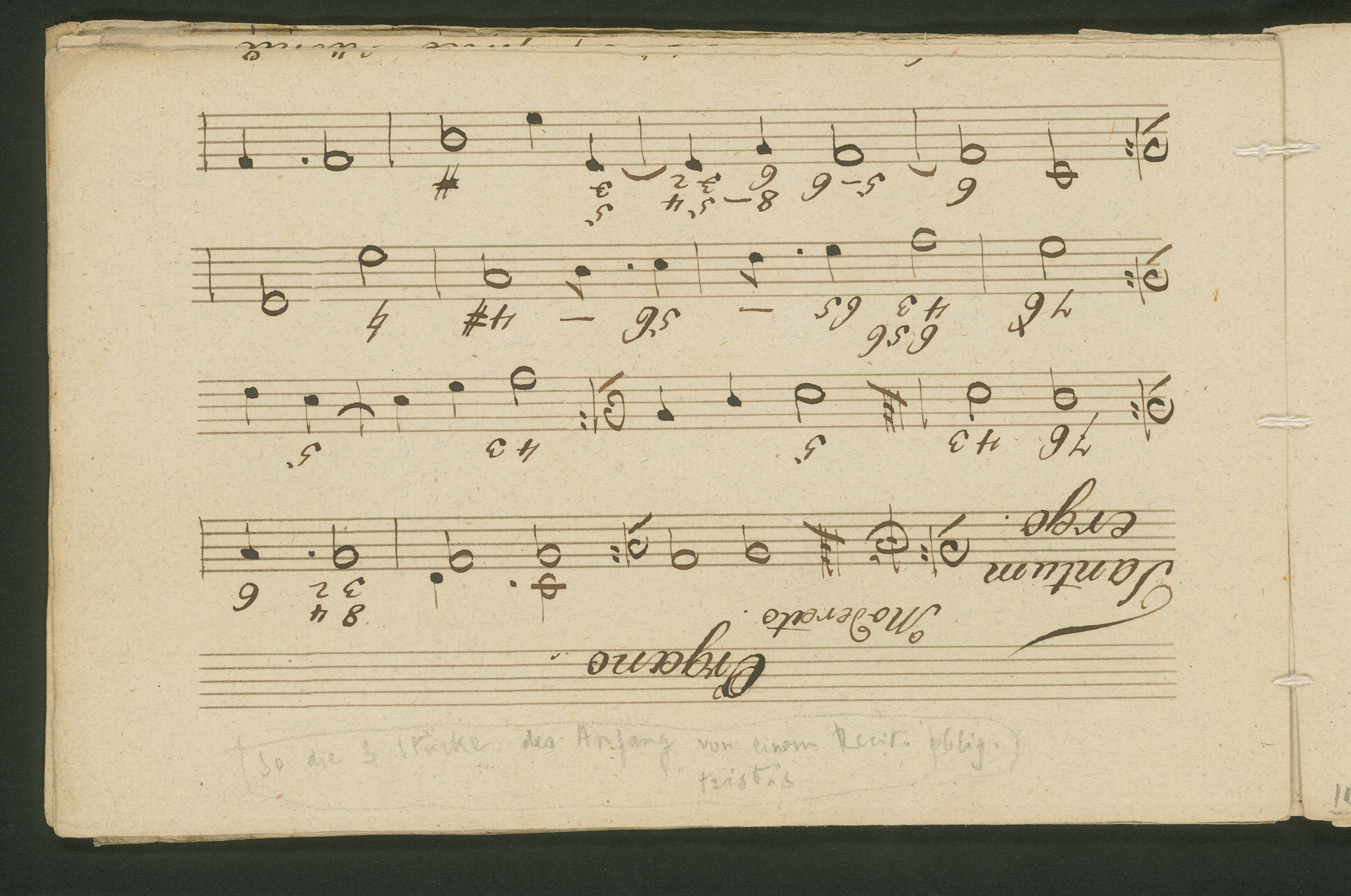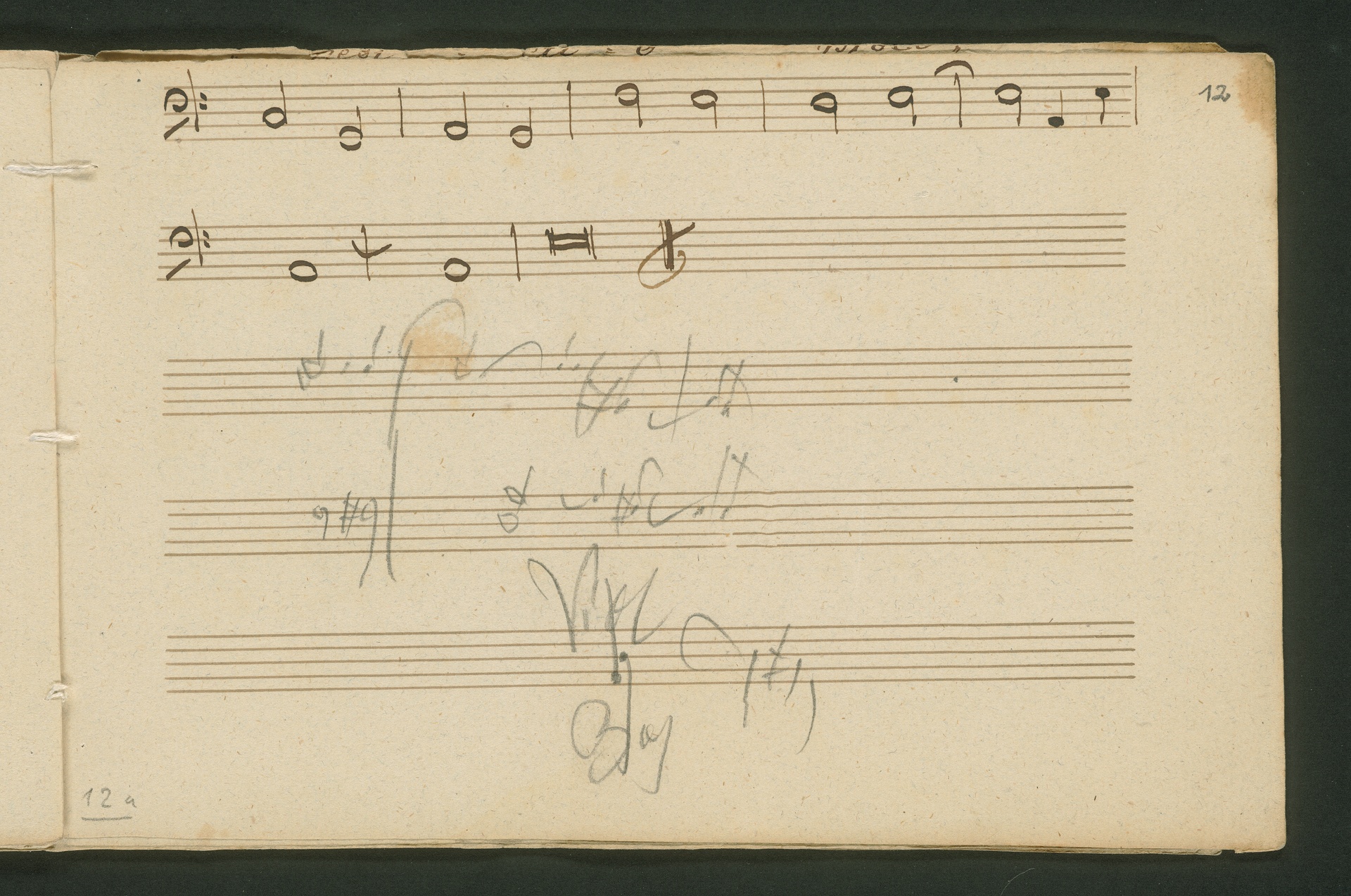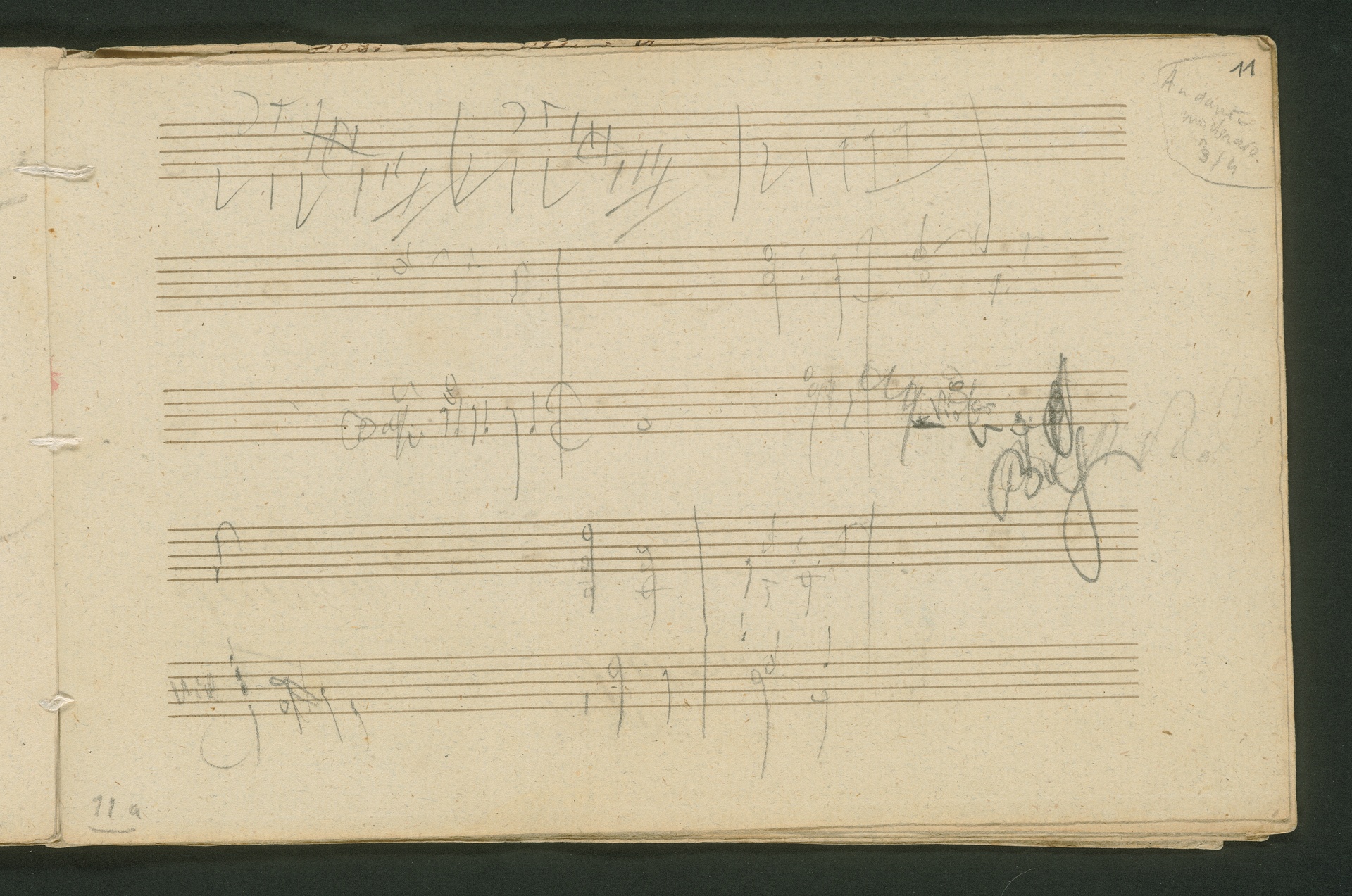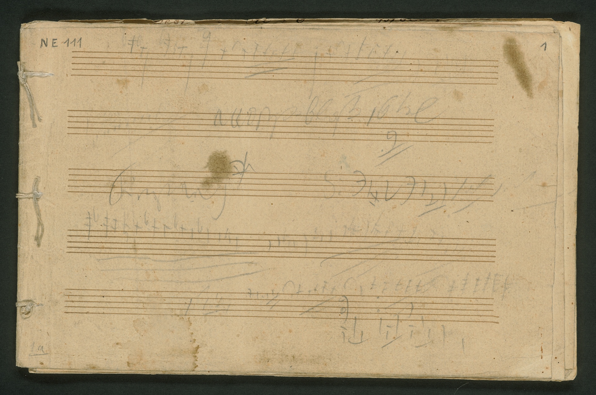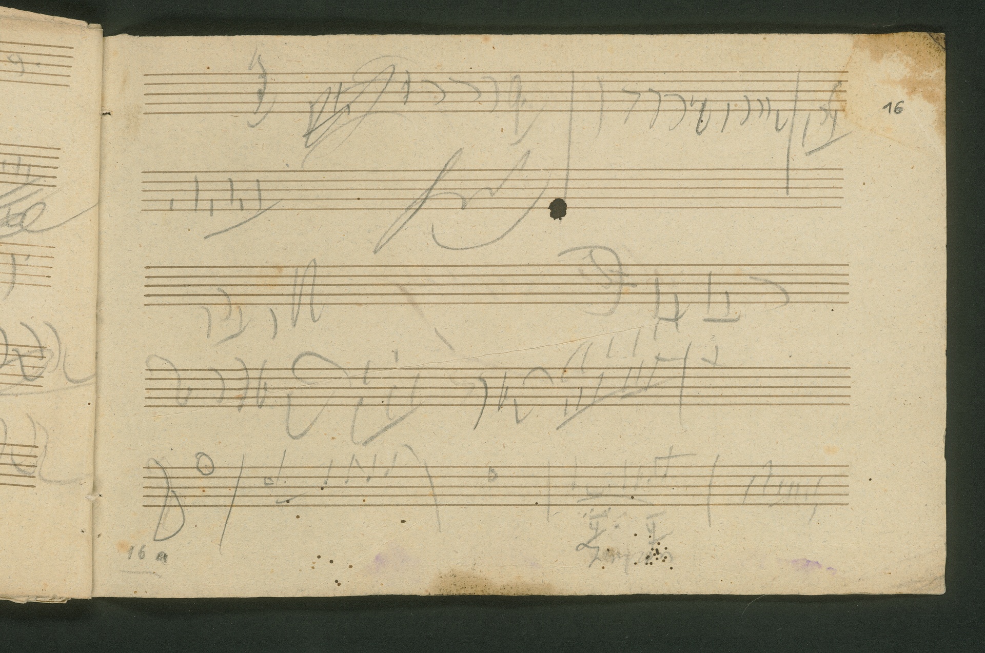 Dieses Taschenskizzenbuch, benannt nach seinem früheren Besitzer Romain Rolland, birgt ein Kuriosum. Normalerweise verwendete Beethoven zur Herstellung seiner kleinformatigen Taschenskizzenhefte neues, unbenutztes Notenpapier. Nicht so bei diesem, das übrigens noch die originale Heftung hat und offensichtlich so intakt ist, wie Beethoven es hinterließ. Beethoven benutzte für dieses Heft die Abschrift eines "Tantum ergo" von J. Stadelmayr für vier Gesangstimmen. Ob er gerade kein anderes Papier zur Hand hatte, aber dringend Notenpapier benötigte? Die Kopistenabschrift war auf hochformatigem Papier geschrieben, einige Rückseiten waren jedoch leer. Beethoven faltete die Blätter auf die Hälfte zusammen, schnitt sie auseinander und notierte seine Skizzen nicht nur auf den leer gebliebenen Seiten, sondern auch auf einzelne freie Systeme unterhalb der Abschrift. Beim Durchblättern des Heftes fallen daher drei unterschiedliche Typen von Seiten auf: Jene, auf denen sich Beethovens Bleistiftskizzen befinden. Jene, auf der wir die mit Tinte geschrieben Abschrift eines Berufskopisten zu Stadelmayers "Tantum ergo" erkennen können. Diese Seiten stehen wegen der Faltung der Blätter bei der Herstellung des Heftes auf dem Kopf. Und schließlich jene Seiten, die sowohl das eine als auch das andere bergen: im oberen Teil die Abschrift in Tinte, auf frei gebliebenen Systemen darunter Beethovens Skizzen in Bleistift. Alle Skizzen Beethovens beschäftigen sich mit dem 3. Satz der Neunten Sinfonie. (J.R.)