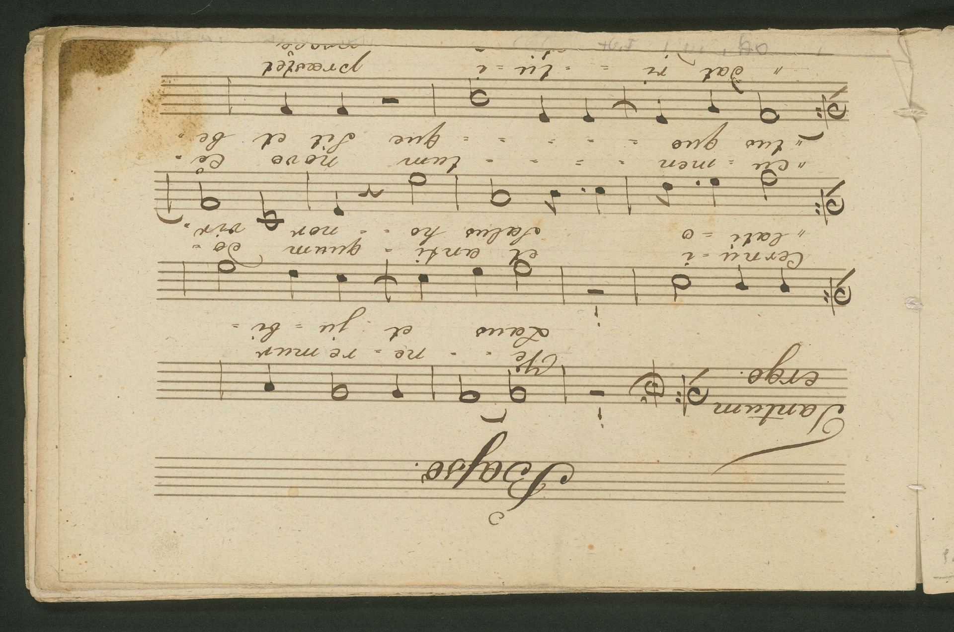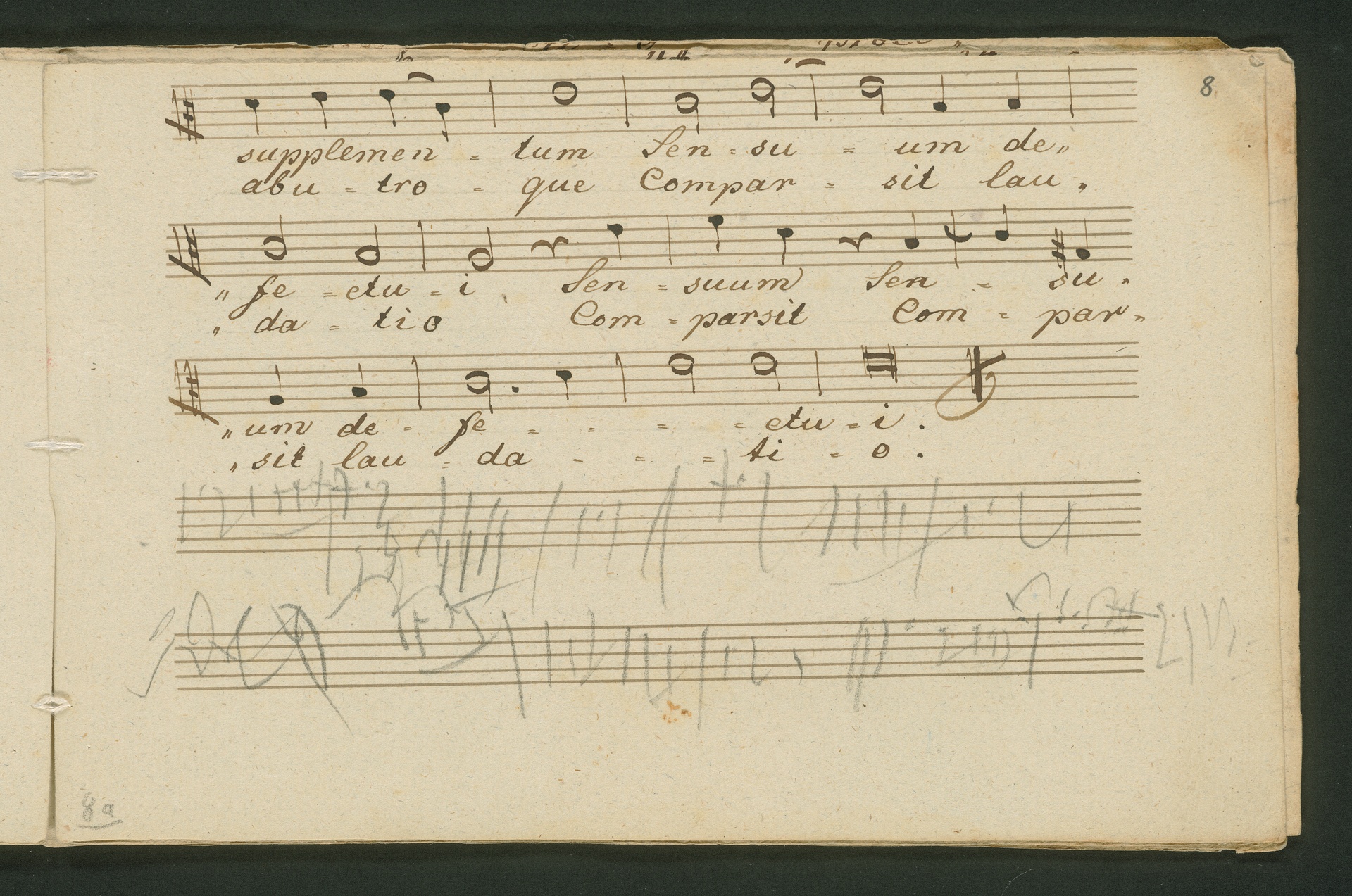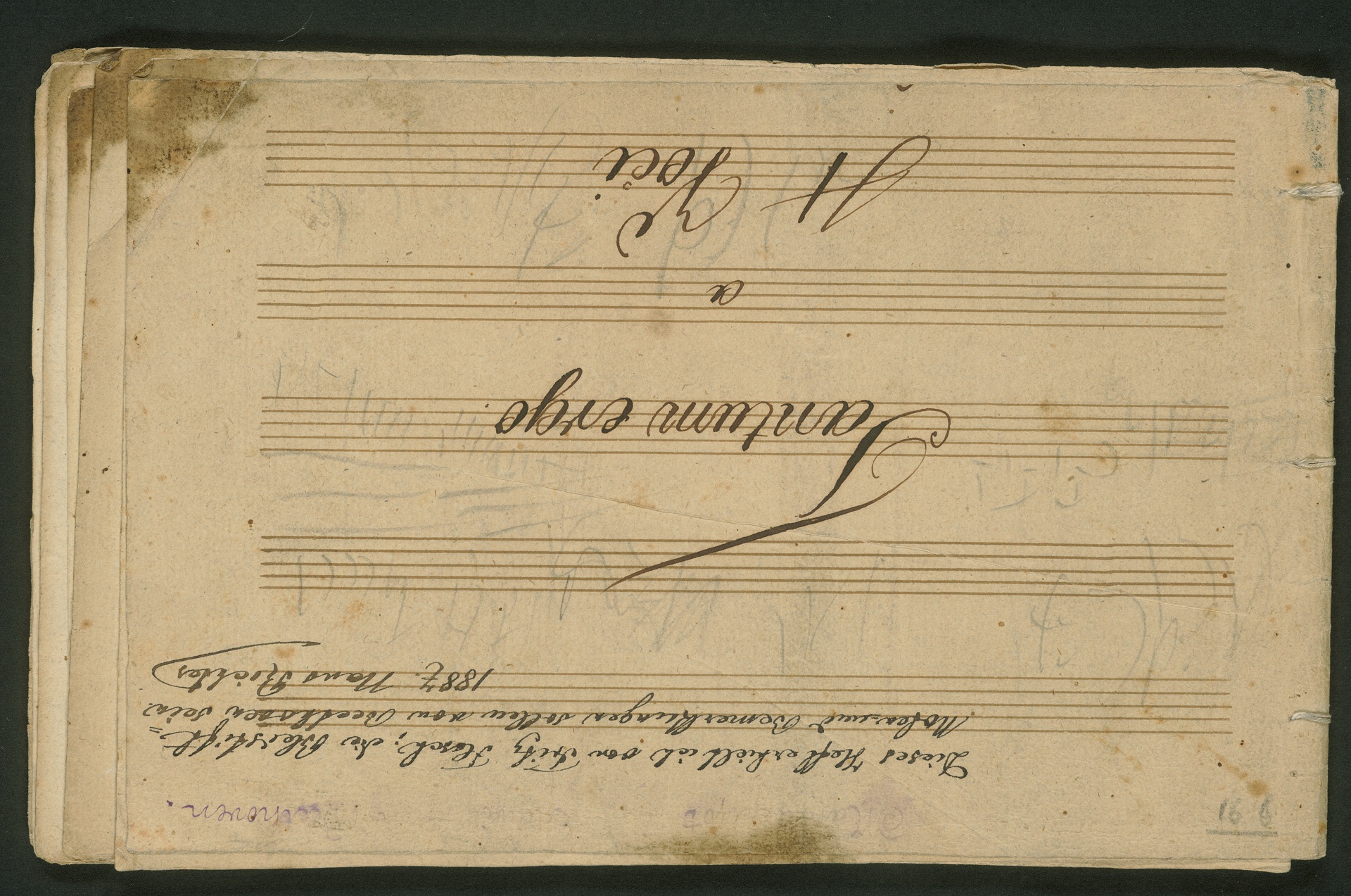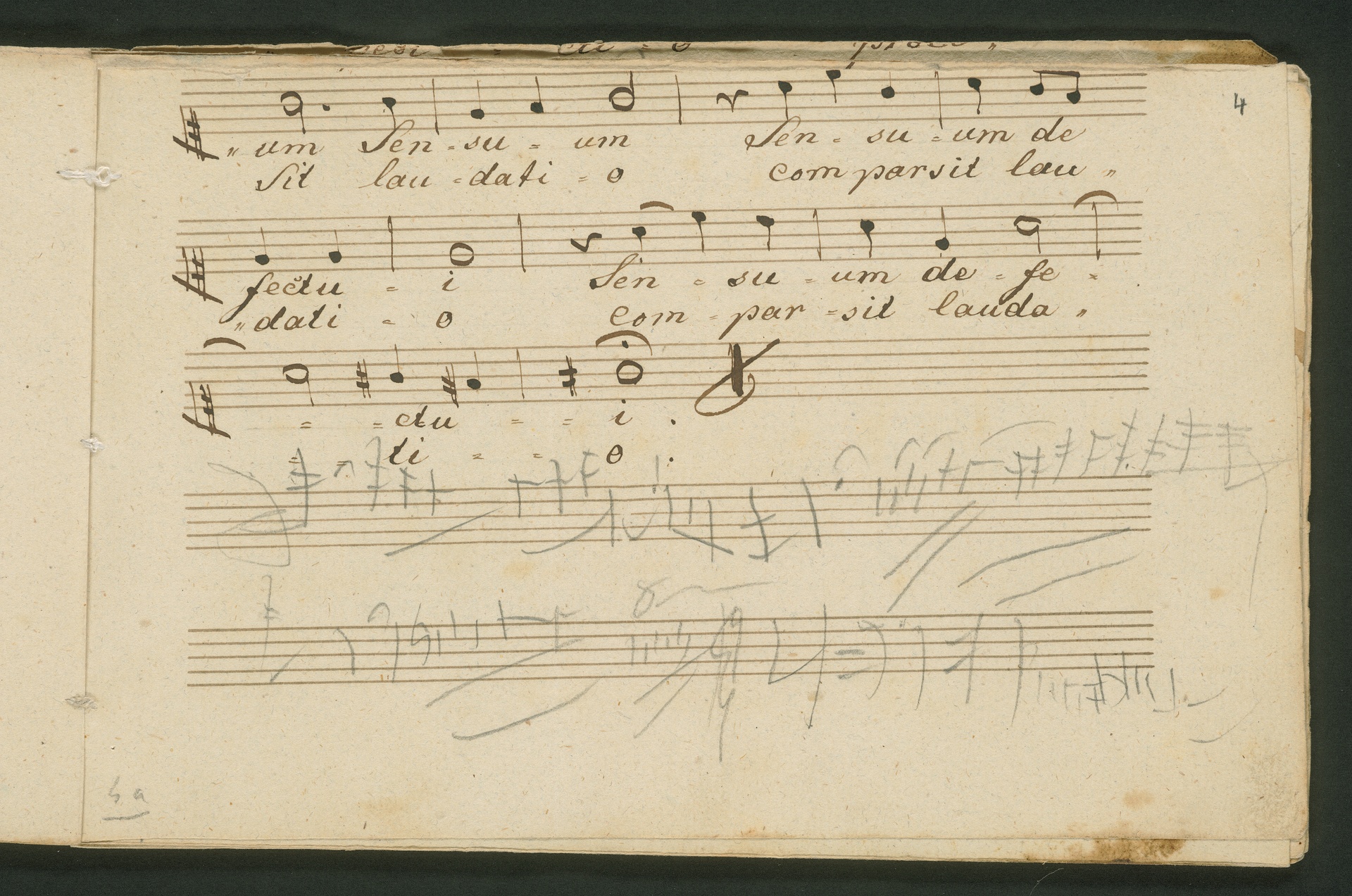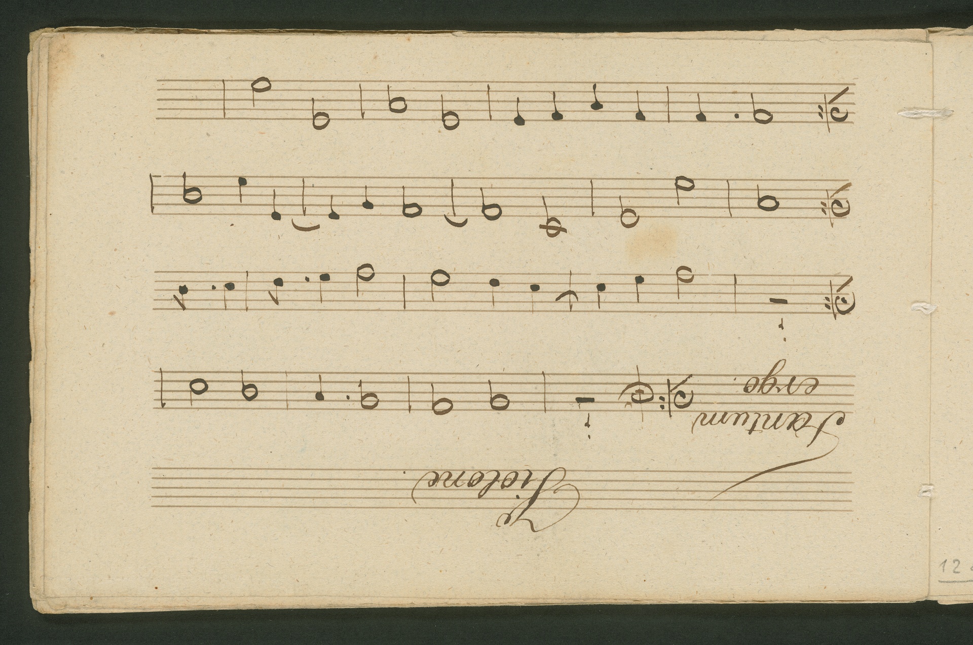 Dieses Taschenskizzenbuch, benannt nach seinem früheren Besitzer Romain Rolland, birgt ein Kuriosum. Normalerweise verwendete Beethoven zur Herstellung seiner kleinformatigen Taschenskizzenhefte neues, unbenutztes Notenpapier. Nicht so bei diesem, das übrigens noch die originale Heftung hat und offensichtlich so intakt ist, wie Beethoven es hinterließ. Beethoven benutzte für dieses Heft die Abschrift eines "Tantum ergo" von J. Stadelmayr für vier Gesangstimmen. Ob er gerade kein anderes Papier zur Hand hatte, aber dringend Notenpapier benötigte? Die Kopistenabschrift war auf hochformatigem Papier geschrieben, einige Rückseiten waren jedoch leer. Beethoven faltete die Blätter auf die Hälfte zusammen, schnitt sie auseinander und notierte seine Skizzen nicht nur auf den leer gebliebenen Seiten, sondern auch auf einzelne freie Systeme unterhalb der Abschrift. Beim Durchblättern des Heftes fallen daher drei unterschiedliche Typen von Seiten auf: Jene, auf denen sich Beethovens Bleistiftskizzen befinden. Jene, auf der wir die mit Tinte geschrieben Abschrift eines Berufskopisten zu Stadelmayers "Tantum ergo" erkennen können. Diese Seiten stehen wegen der Faltung der Blätter bei der Herstellung des Heftes auf dem Kopf. Und schließlich jene Seiten, die sowohl das eine als auch das andere bergen: im oberen Teil die Abschrift in Tinte, auf frei gebliebenen Systemen darunter Beethovens Skizzen in Bleistift. Alle Skizzen Beethovens beschäftigen sich mit dem 3. Satz der Neunten Sinfonie. (J.R.)