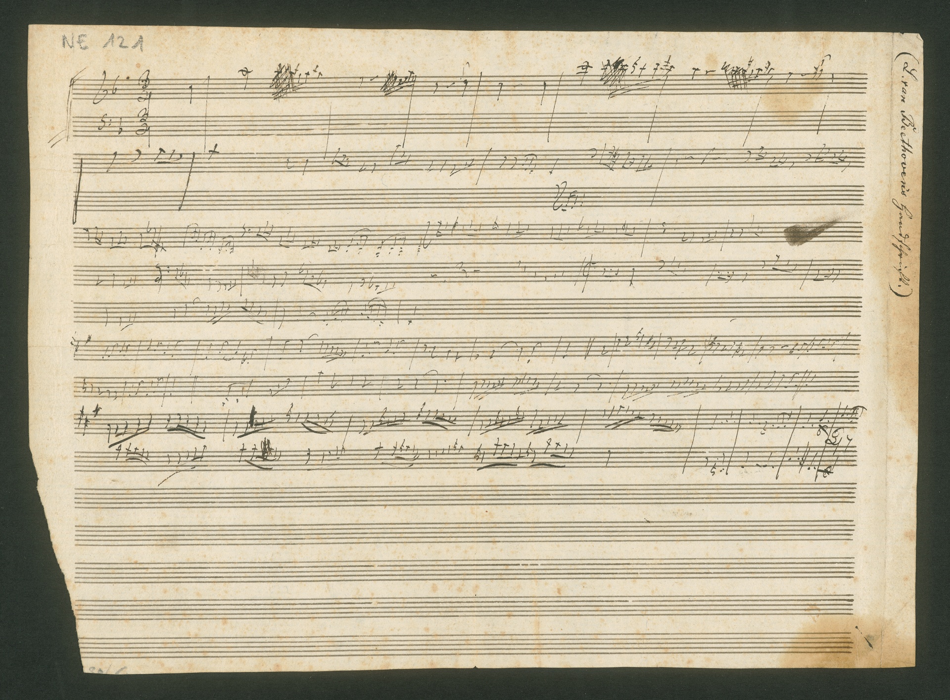 Dieses Skizzenblatt enthält neben nicht identifizierten Skizzen auch solche zu den Klaviervariationen WoO 68. Beethovens Handschrift trägt noch die Züge seiner "Jugendschrift" vor 1800. Das Papier gehört einer Sorte an, die er häufig zwischen 1795 und 1799 verwendete. Eine nähere Datierung lässt sich aus dem Inhalt erschließen: Den zwölf Variationen für Klavier WoO 68 liegt als Thema das Menuett "à la Viganò" aus dem Ballett "Le nozze disturbate" zugrunde. Mozarts Schwager Jakob Haibel komponierte dazu die Musik, aufgeführt wurde das Ballett am 18. Mai 1795. Beethovens Variationen über das Menuett, das bei den Zeitgenossen sehr beliebt war und auch von anderen Komponisten variiert wurde, erschienen in der Originalausgabe im Februar 1796 beim Wiener Verleger Artaria. Für die Datierung des Skizzenblattes ergibt sich deshalb, dass es nach dem 18. Mai 1795 und vor Februar 1796 entstanden sein muß. Berücksichtigt man jetzt noch, dass jeder Druck bestimmte Produktionszeiten braucht (Satz, Korrekturphasen etc.) und eine Skizze vor dem fertigen Werk entsteht, so ist es sehr wahrscheinlich, dass dieses Blatt im Jahr 1795 verwendet wurde. (J.R.)